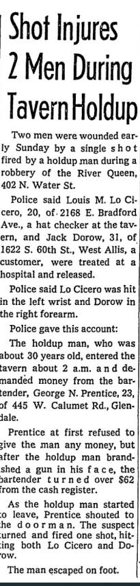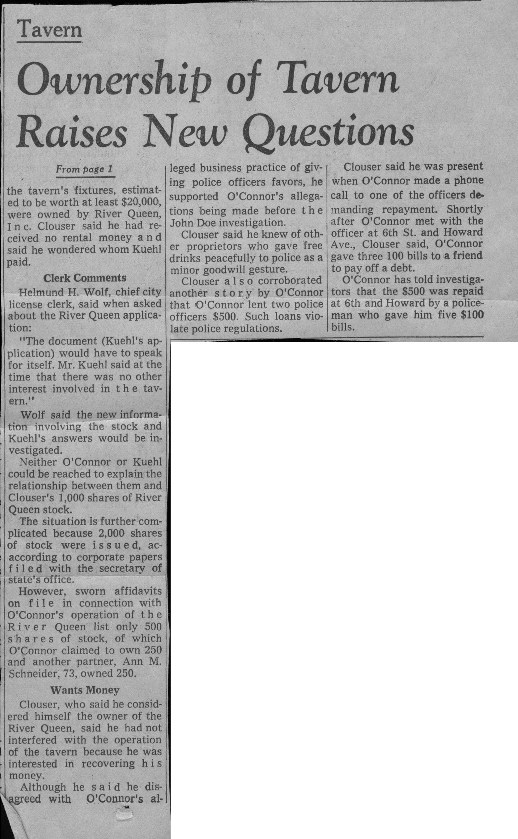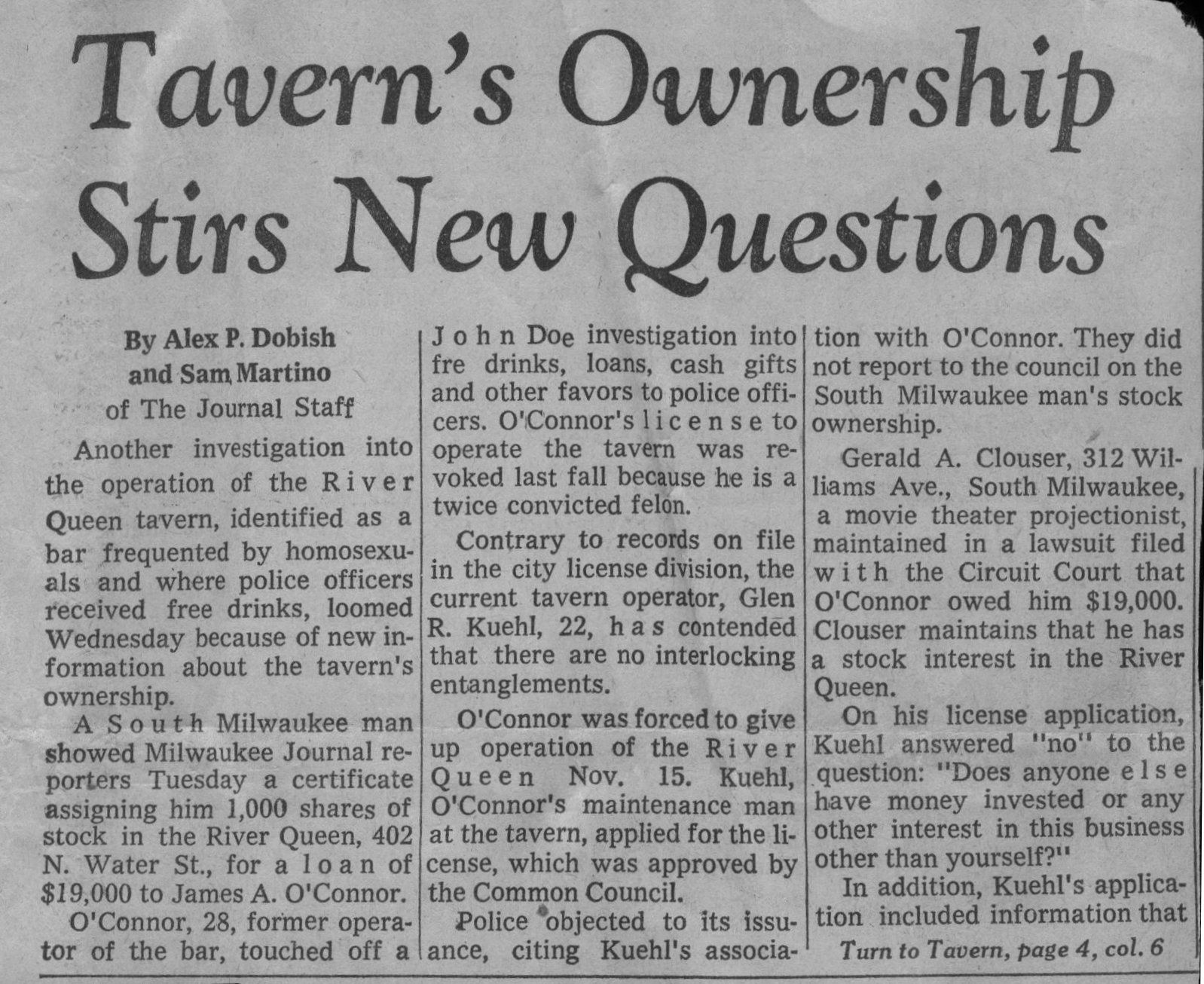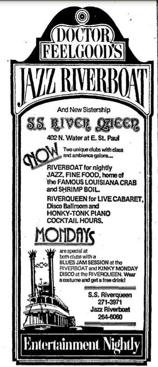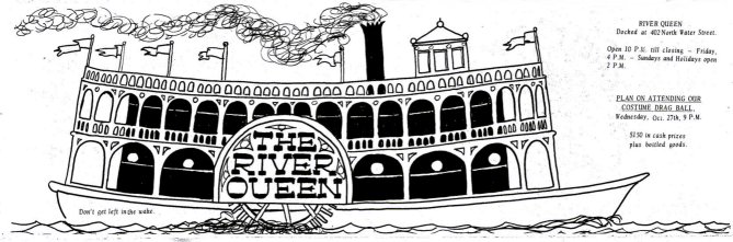 One of Milwaukee's most legendary gay and drag bars, The River Queen bar was one of several gay bars housed in a building originally known as the Cross Keys Hotel (built in 1853). Opened by Al Berry who had run the Rooster bar, the River Queen was rumored at the time to be backed by Chicago mob money. The River Queen had a relatively long life, and ranged from a dance bar to a popular hang-out bar, the bar in which everyone was seen at one point or another. In its later years it was often referred to as a drag bar, although it continued to draw a mixed group. The bar is generally accepted as being frequented by "gay" national celebrities when in town for local shows or performances: these include Liberace (actually a Milwaukee-area native), Milton Berle, Paul Lynde, and others. Historian/ researcher Michail Takach explains more of the history of the Cross Keys and River Queen in his book, "LGBT Milwaukee": Built in 1853, the Cross Keys Hotel (400 North Water Street) once hosted Pres. Abraham Lincoln for a bath. Surrounded by warehouses “one sneeze away from falling over,” the building seemed doomed. The Crystal Palace, a saloon specializing in banjo players and piano singalongs, attracted gay customers from the Plankinton Avenue strip throughout the 1960s. When Al Barry opened the River Queen in 1971, the Cross Keys was the last building on the block. Decked out in crystal chandeliers and red velvet, the River Queen is remembered as the finest lounge of its time, where Liberace, Milton Berle, Paul Lynde, and Carol Channing cocktailed. Unfortunately, the bar’s license was in constant jeopardy, possibly due to its alleged affiliation with organized crime. Overwhelmed, Barry sold the business to James O’Connor in 1973. In January 1976, the River Queen was the scene of a massive police corruption scandal. To avoid harassment, O’Connor had provided cash payoffs, expensive gifts, cases of liquor, and unlimited free drinks to over 50 policemen and their wives for years. Officers were allegedly served at the bar until 7:00 a.m. (by both bartenders and prostitutes) and sometimes fired bullets into the ceiling. Investigators traveled the Midwest to obtain shadowy testimonials, but the case was dismissed without charges. “Detectives say that homosexuals, like prostitutes, are often valuable sources of information about criminal activity,” reported the Milwaukee Journal. The River Queen closed temporarily, and then closed forever. Although few patrons knew or understood the Cross Keys’s glorious past, everyone wanted a piece of the River Queen. Some still own barstools to this day. The last half of the 1970s sees a succession of name changes to the bar. The August 1976 issue of the local "GLIB Guide" is seemingly a last mention of the River Queen, reading: "Another familiar bar, the River Queen closed, remodeled and reopened as the Side Door. The new bar is an expanded version of the old bar, with plus carpeting and a giant-size TV screen. The Side Door also features a disco." The Side Door is named because it advertises its address as the side entrance address, 212 E. St. Paul. But by August 1978 the River Queen is to re-open as "The S.S. River Queen", reclaiming its "402 N. Water Street" address as well. But then in May 1979 it is advertised as yet another bar, Jocks, again using the side entrance address. The struggle to remake itself ends in May 1980 when the bulding was demolished. Michail Takach goes into more detail on the final years: Whether or not the SS River Queen ever opened is a mystery. We do know that Tiny's Waterfront Disco was announced in the same space in March 1979. But with Tiny's April 27, 1979 disappearance (and subsequent murder,) those plans were sadly cancelled. After the legendary River Queen closed, a revolving door of gay bars—including Sharon’s, Side Door, and Jocks (May 1979)— came and went. By 1979, the building’s sole occupant was the Waterfront Café. On November 28, 1979, a three-alarm fire broke out at the Cross Keys at 4:15 a.m. The fire started on the first floor, but the state fire marshal never found its cause. Over 100 firefighters battled to save the building, but it was a total loss. Inspectors noted the former hotel lobby, once five feet above street level, had sunk five feet below street level since 1879. After 127 years of service, the oldest building in Milwaukee was razed in May 1980. The land remained vacant until 2005, when the Milwaukee Public Market was built on the Cross Keys Hotel footprint. One wonders if the Cross Keys Hotel would still be with us, if Tiny and his Waterfront Disco had ever opened. LGBT researcher/historian Michail Takach wrote the following about one effort to resurrect the business in a Feb. 2022 Facebook post: After corrupt cops sank the rambunctious River Queen in 1976, people thought the bar was gone forever. Not quite. In fall 1978, the "S.S. River Queen" reopened at this address-- offering a "Kinky Monday Disco" (!)-- alongside a New Orleans seafood restaurant named "Doctor Feelgood's Jazz Riverboat." Sadly, both were gone within a year, the 145-year old building was destroyed by fire two years later, and "Tiny's Waterfront Disco" never happened at all. (A book, "LGBT Milwaukee" by Michail Takach, seeks to make the story of LGBT Milwaukee accessible, visible, and portable for future generations--before it is too late. The River Queen in the Cross Keys Hotel is one of many early LGBT landmarks documented in the book.) Recollections: The following are recollections of others who have been kind enough to submit their personal memories to the webmaster. You are welcome to do the same! The River Queen - First gay bar I was ever in. I was surprised to see so many guys, none of whom matched the sissy stereotype. "The River Queen was the premier meeting and dance bar in its day, located on the site of the current Milwaukee Public Market. I don't remember ever seeing any drag queens there, unless you count