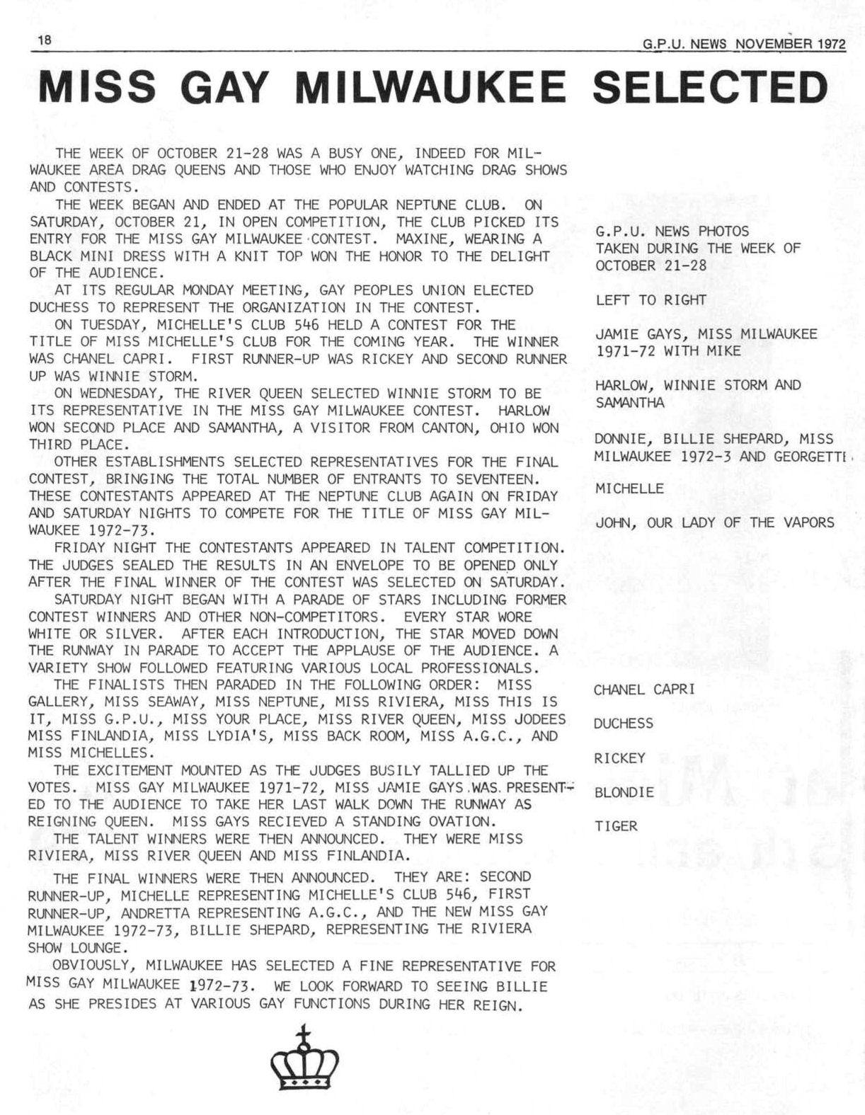 Recollections: The following are recollections of others who have been kind enough to submit their personal memories to the webmaster. You are welcome to do the same! Brings back so many wonderful memories! Mel & Jerry were fabulous people. Milwaukee had a very active and proactive drag community and they were the definitive leaders, not to mention MaMa Ray. They did countless fund raisers for H.I.T. as well as many other causes. I remember when some members of the gay sports community were reluctant to having them appear in the awards banquets and going to bat for them......"they are good enough to raise money for you, they belong in the awards ceremonies." Kenneth Kurtz, via Facebook (2018)
