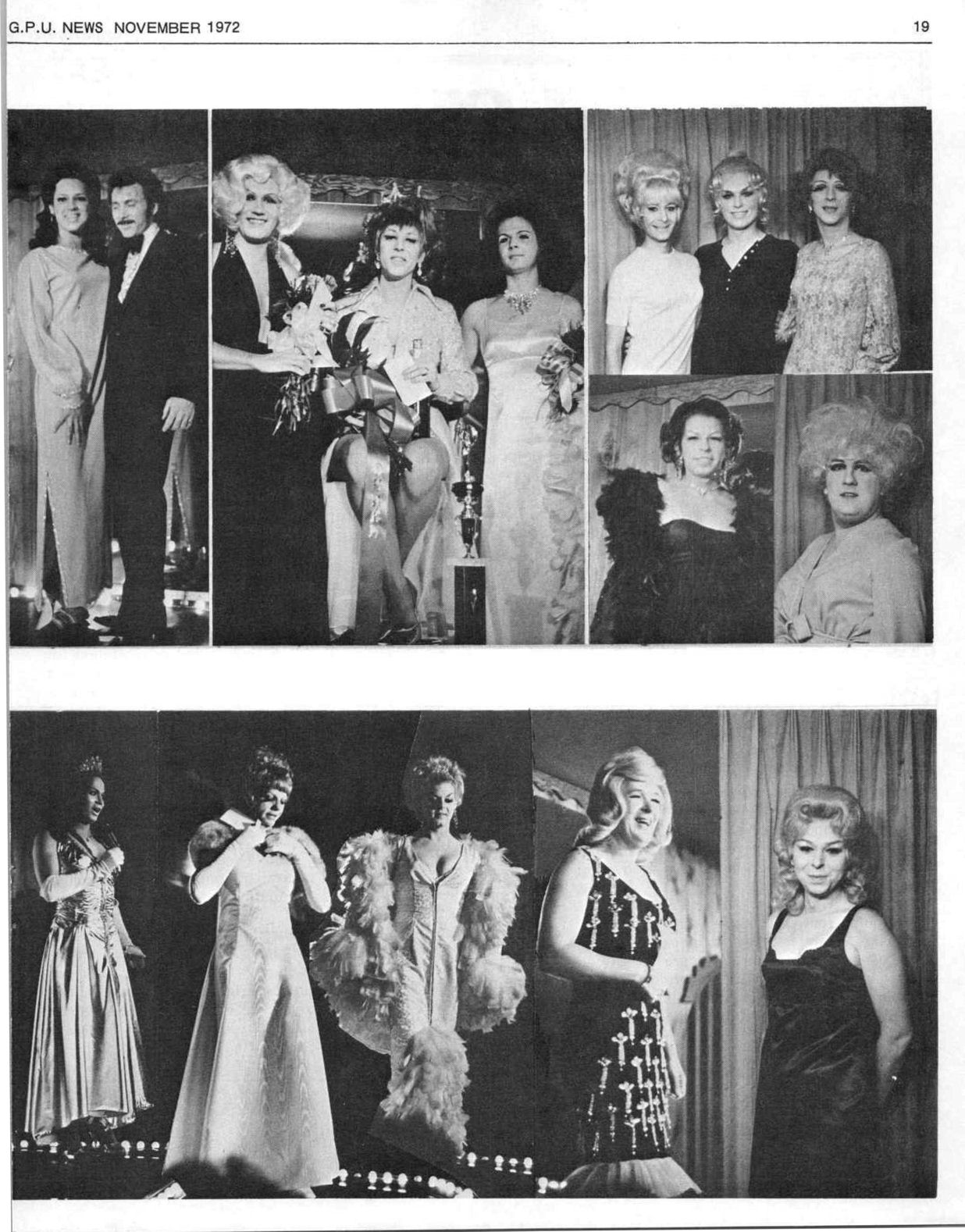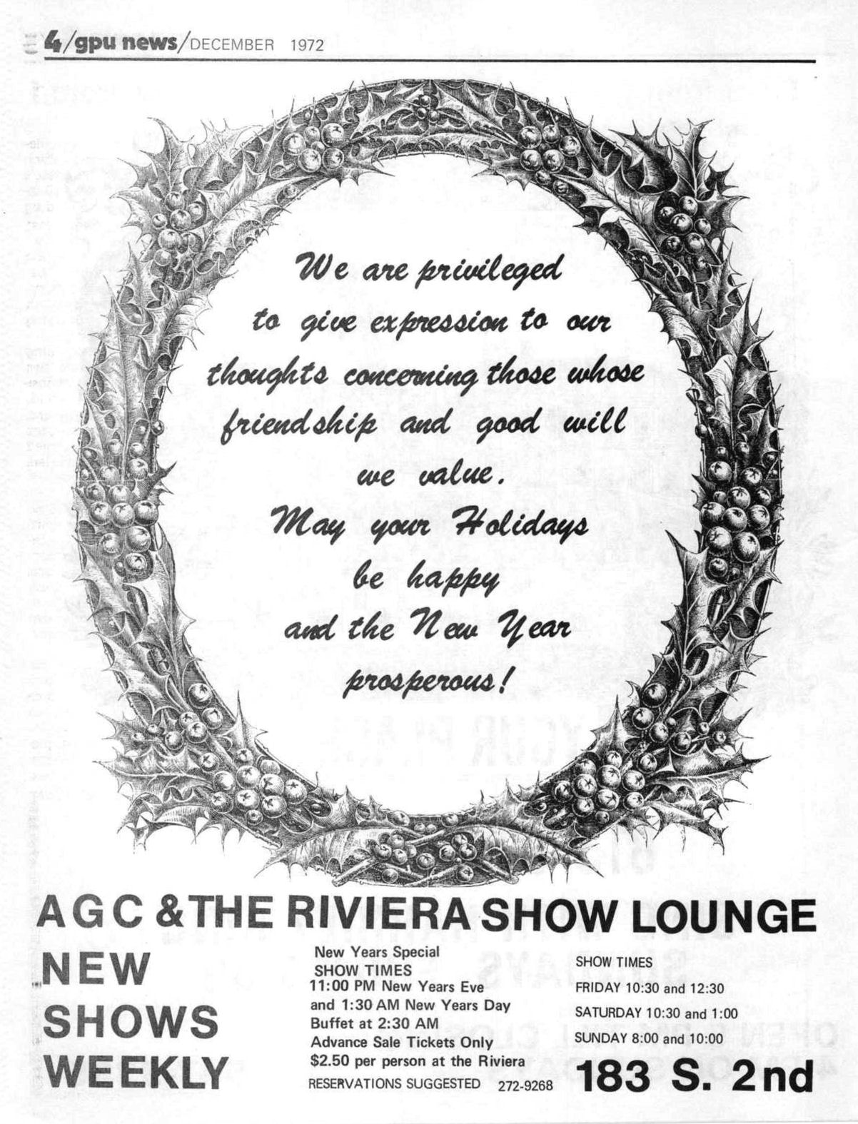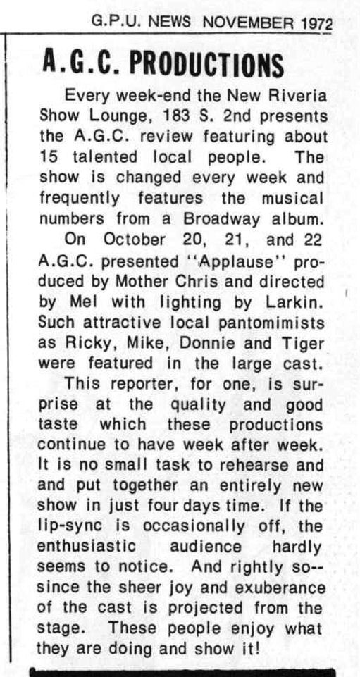 Riviera Show Lounge, formerly the Nite Beat, had its grand opening on June 30, 1972. The first production was called "The Dolly Review", presenting a cast of local female impersonators. According to an article in GPU News, "The show consisted of eleven numbers in pantomime and was produced by "Norma Jean" Baker with choreography by Mel Powers. The show featured Winnie Storm, Mel Powers, Jerry Powell, Bill, Andretta, and Mother Chris with Norbert, Tom, Frank and Donnie as chorus boys... The production was lavishly costumed and of excellent quality." The Lounge promised to feature an entirely new production weekly, with performances on Friday, Saturday and Sunday nights. Future ads headlined "A.G.C. & the Riviera Show Lounge present new shows weekly". The few mentions and ads for the Riviera Show Lounge mention "A.G.C. Productions" doing all of their shows, and the Lounge seems to be directly linked in some way with the A.G.C. group. But we have no information on what or who the A.G.C. actually was. (We have seen indications that a bar/restaurant named "Dionysus" existed in this location in 1974; so it appears the Riviera Show Lounge did not exist for more than a year or two. However, we have no verifiable information about the "Dionysus" bar at all.) More information about this business or the A.G.C. is welcomed from anyone who can contribute it.