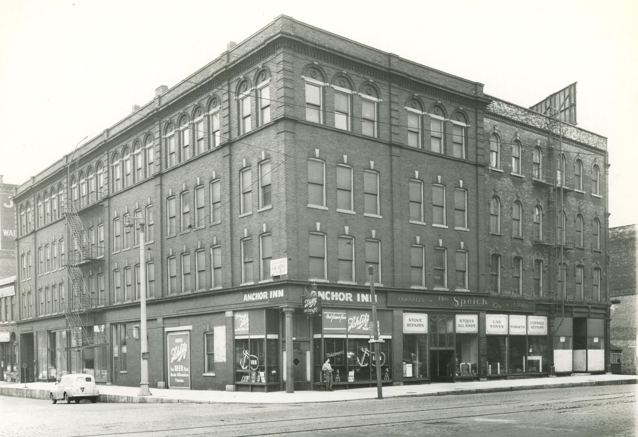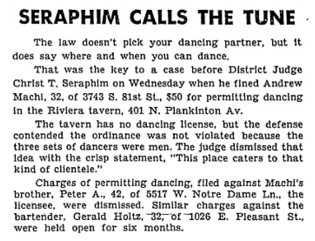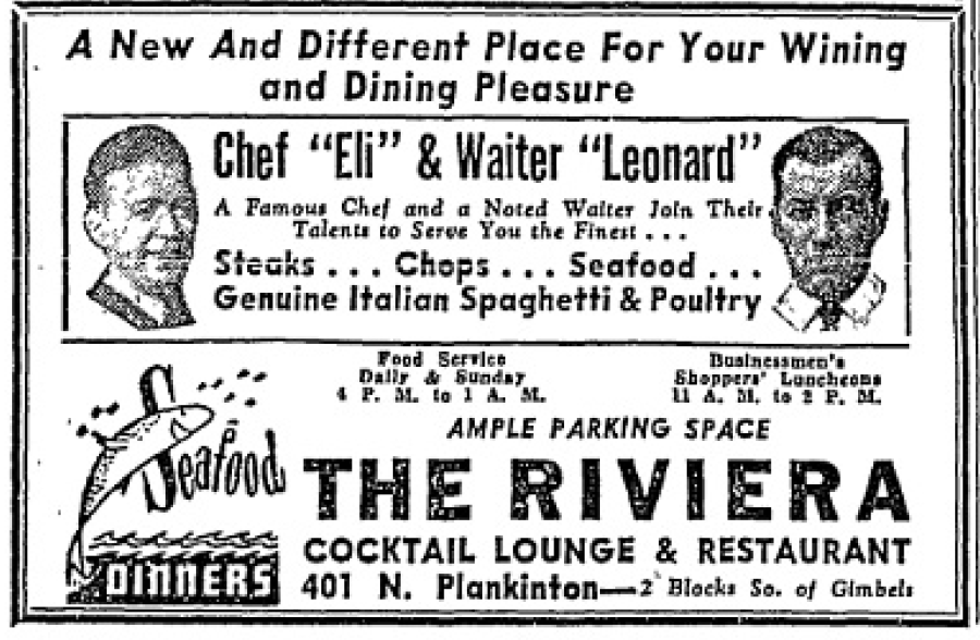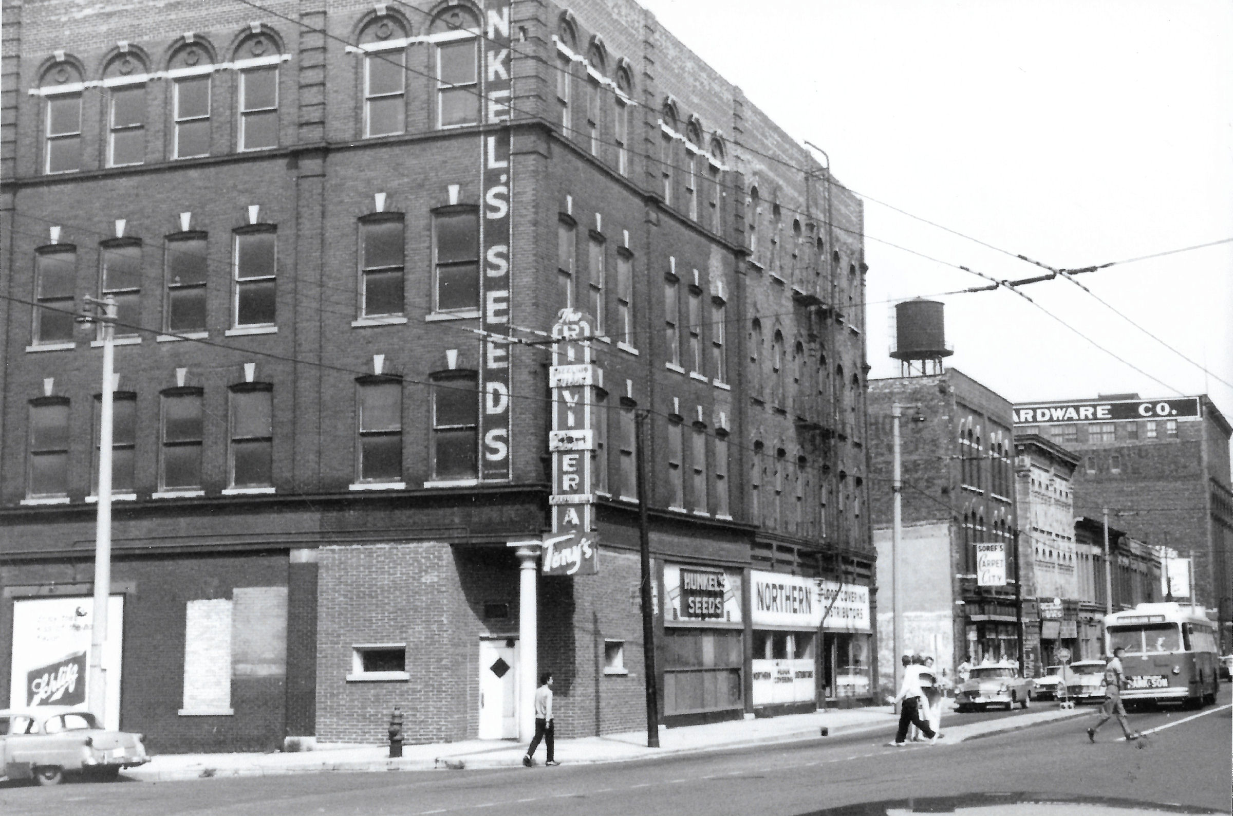 The first gay bar documented in the 401 North Plankinton Avenue space was apparently the "Anchor Inn", but almost nothing is known about that bar. The Anchor Inn, located in the historic Hunkel Seed building, was already an unofficial gay meeting place by the late 1940s. The 3,000-square-foot tavern reopened as The Riviera Cocktail Lounge and restaurant on November 25, 1949, almost 20 years before Stonewall, by John Balestrieri and cousin John Triliegi (according to a NewsBank article). The Anchor Inn and then The Riviera was one of four bars that anchored Milwaukee's first gayborhood-- the Strip-- which emerged in 1948 from an earlier generation of sailor bars catering to downlow workingmen. The ancient Cream City warehouse, formerly Hunkel Seed Factory, was built before the Civil War, but The Riviera is remembered as a modern, cozy, upscale cocktail lounge that made a great starting point for big nights out. An ad in the December 21, 1949 Milwaukee Journal Sentinel of course didn't reference it as a "gay bar", but called it "A new and different place for your wining and dining pleasure". The ad then mentions "Chef 'Eli' and Waiter 'Leonard'", and states "A famous chef and a noted bartender join their talents"; those may have been names familiar to gay men of the time. The cocktail lounge was taken over by Tony Machi (of an Old Third Ward family) sometime in September 1951 and became "Tony's Riviera Cocktail Lounge" (although still commonly called simply 'The Riviera'), offering 35 cent Martinis. By 1952 the tavern was under lease to Peter Machi, who may have been a silent partner to the more visible Tony Machi. Tony’s Riviera became quietly known as the premier gay bar of the 1950s. The Machi brothers invested considerable money- and involved many sponsors- while carving a modern lounge out of the historic grain mill. "On Sunday afternoons, the place was loaded with cops," said contributor George "Bunny" Opper. "They would come in on Sunday nights with their women, but never their wives; they never spent a dime, and they always left richer than they came." Various patrons remember policemen visiting the Riveria’s basement, which allegedly housed an illegal booking joint, and stuffing envelopes into their coat pockets on the way out. Milwaukee police suspected the Riviera of paying "insurance," but the Machi brothers denied being shaken down by any syndicate. For 15 years, Tony's was one of the hottest gay bars (and hustler joints) in town. It was both popular and profitable-- so much, in fact, that it attracted the attention of FBI agents wondering HOW a gay bar could be so successful in mid-century Milwaukee. Eyewitnesses contend that Tony's was profitable not only for its owners, but for police officers on the payoff system that protected early gay bars. (An article from a 1961 Milwaukee Journal Sentinel issue demonstrates one method of harassment toward gay bars at the time. Notoriously homophobic judge Christ Seraphim fined one of the owners, Andrew Macki, $50 for permitting dancing. The defense contention that the ordinance was not violated because the three sets of dancers were men was rejected by the judge, who said "This place caters to that kind of clientele". It's interesting to see how widely the Riviera was known as a gay bar, so long before Stonewall.) In March of 1964, there was a lover's spat: an unknown customer, whose married lover had just broken up with him, went around the back of the building (a 4-floor brick warehouse), and set the building on fire (a grain elevator). And thus early on the morning of March 15, 1964, a catastrophic five-alarm fire consumed the Riviera and devastated the block. At 6:00 p.m., someone ran into the bar and yelled "Fire!" Bartender Richard Isensee remained open until policemen ordered him to evacuate. "When we left, the ceiling was on fire," said Isensee. "But you just don’t leave a dirty bar." One contributor who relates this story remembers that when the front wall of the building collapsed, it crushed the fire department's ladder truck. "I was on vacation in California," said another contributor, "when someone called me to say 'your house is on fire—come home!'" The ruins smoldered for a week. Although arson was suspected, FBI documents note that the underinsured tavern was a "profitable fag joint." (The book "Beertown Blazes, A Century of Milwaukee Fire Fighting" by R.L. Nailen and James S. Haight (Renaissance Books), recalls what is likely that fire on page 240, as one of the Top 100 fires in the city. It documents the fire as follows: "March 15, 1964 Northern Floor Covering et al; 401-411 N. Plankinton; 4 (story) brick 100x125 mercantile & storage. Box alarm 6:18pm for fire in rear loading dock; ceiling flashed over while lines being laid; hot air explosion involved 2nd floor; 5 alarms by 7:30. Four men of Truck 3 trapped on 3rd floor, rescued via aerial ladder. Fire out all floors and through roof; 4 special calls; north wall fell 8 p.m. crushing Truck 7's trailer. Under control 3 a.m.; ruins smoldered for a week. Response 160 men, 18 engines, 6 trucks, fireboat; 36 hose lines; 10 million gallons water. Loss $185,370.") N. 3rd Street Location Tony Machi relocated The Riviera to 952 North 3rd Street (where North Plankinton Avenue joined N. 3rd St. at the time), where it was often referred to as The New Riviera. Its time there was brief; it and the entire block was demolished in 1967 to create Pere Marquette Park, which also swallowed the section of Plankinton Avenue north of Kilbourn Street. Little to nothing is known about that short-lived second location (variously called "New Riviera" or simply "The Riviera" in national gay guides). By 1967, the entire Strip in the neighborhood of 400 North Plankinton was gone too, replaced by interstate freeway I-794. Follow-up While Tony's Riviera never reopened after its brief stay on North 3rd Street, Tony opened "The Barn," a live music venue at 1434 N. Farwell Ave in 1968. Wiscons