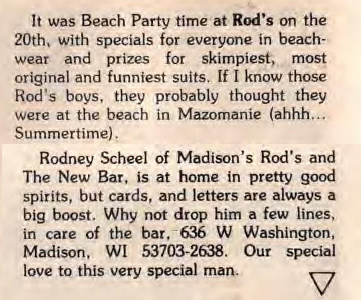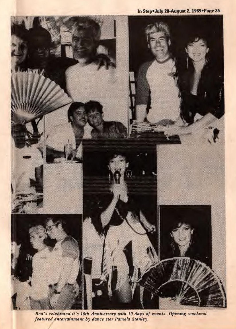 'Steppin Out' column, Mar-Apr 1990: Beach Party info, and update on Rodney Scheel's health