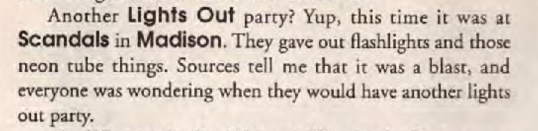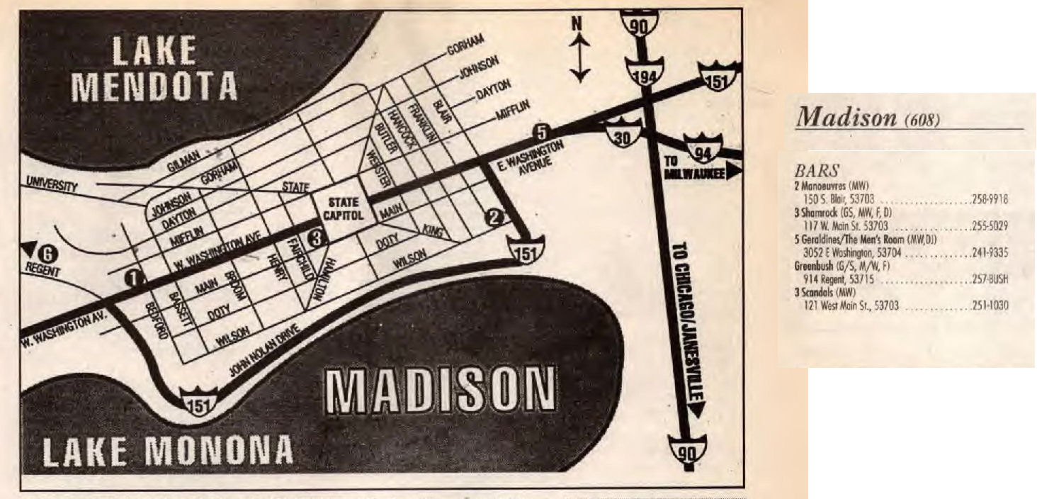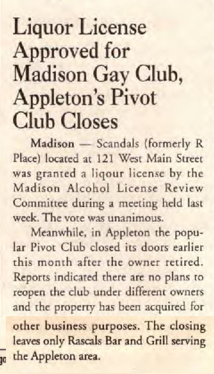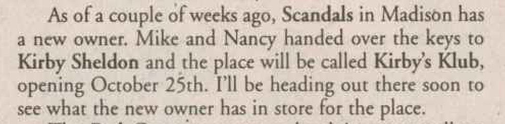 Understandably though, the parents of the owner of the previous bar, R Place, were not keen on operating a 'gay' bar that their son had abandoned and left in their care. A notice appeared in October 1997 that owners Mike and Nancy handed over the keys to Kirby Sheldon and the place would be called Kirby's Klub. Scandals was thus just the second in a long line of names for an LGBT bar in this location (121 W. Main Street, Madison) over a period of just 4 years: