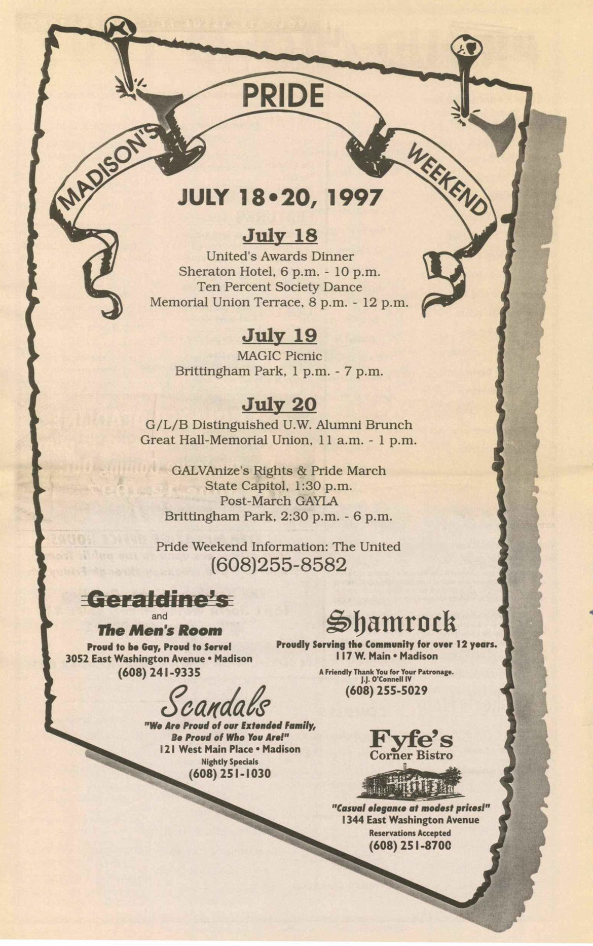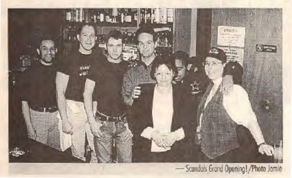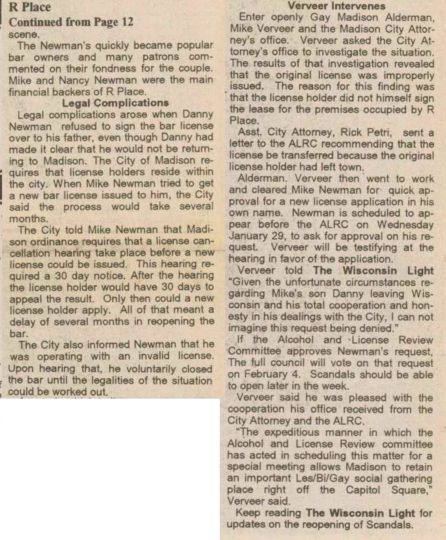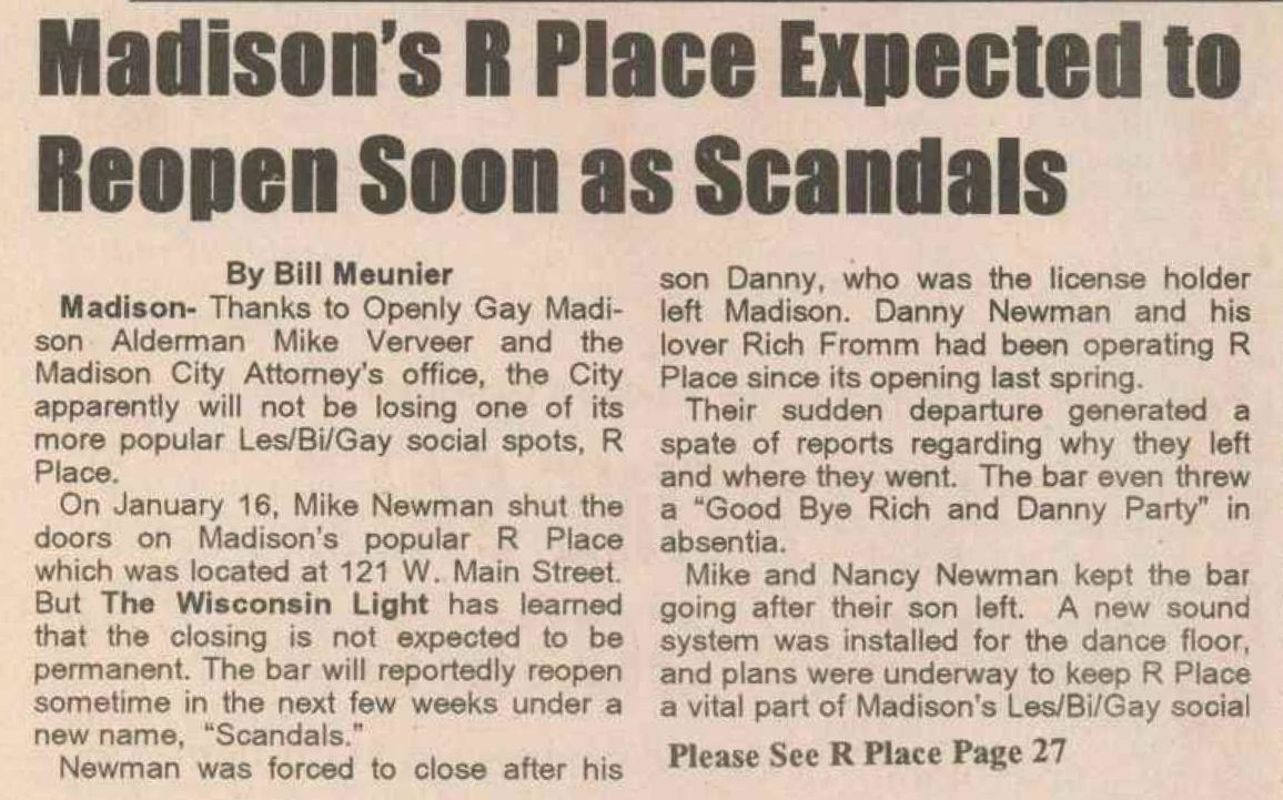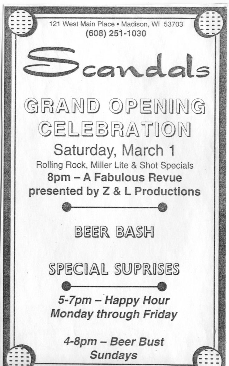 Scandals bar was opened by Mike and Nancy Newman. The bar came about when the license holder of the previous LGBT bar there, "R Place, (Mike's son Danny Newman) left Madison. (Madison requires liquor license holders to reside within the city.) The full situation is described in a story in Wisconsin Light newspaper (see below). (Rumors at the time were that Danny had skipped town with cash, and thus the bar would be reborn as a result of a scandal. Good story, but the truth is somewhat different as the article explains.) Scandals bar opened on March 1, 1997, with a 'Z & L Productions' show. The 'Steppin Out' column in 'In Step' magazine observed "Scandals will definitely be a great place to party". It didn't hurt that the location was two doors away from Madison's popular LGBT bar, the Shamrock Bar & Grille! The bar was listed in the 'Quest magazine' Guide from issue 4-02 to 4-17, reading "features backroom dancefloor, fireplace and hot crowd".