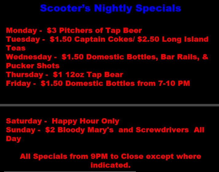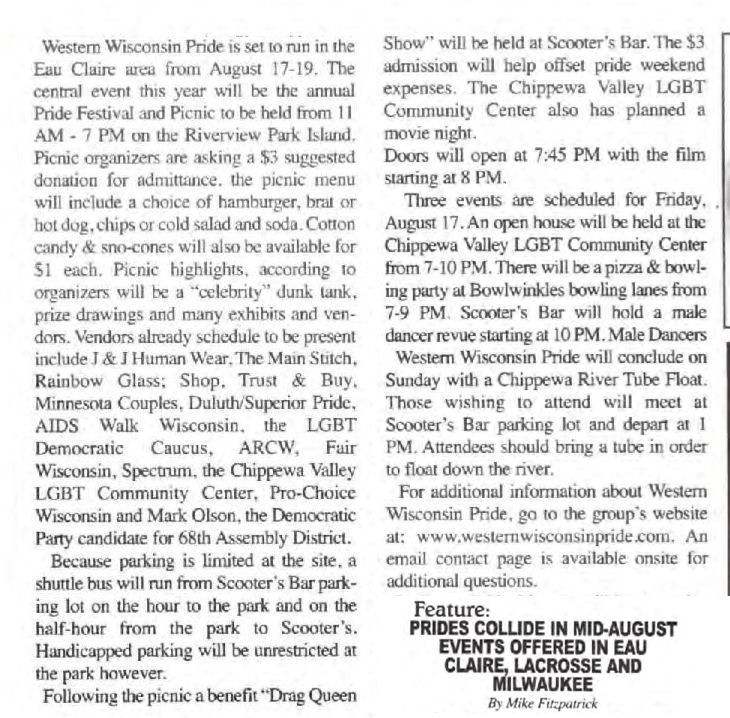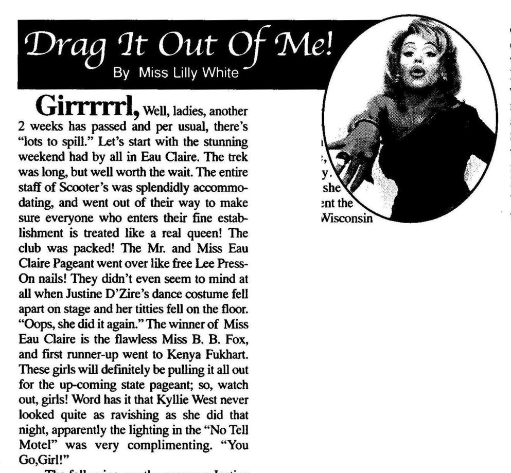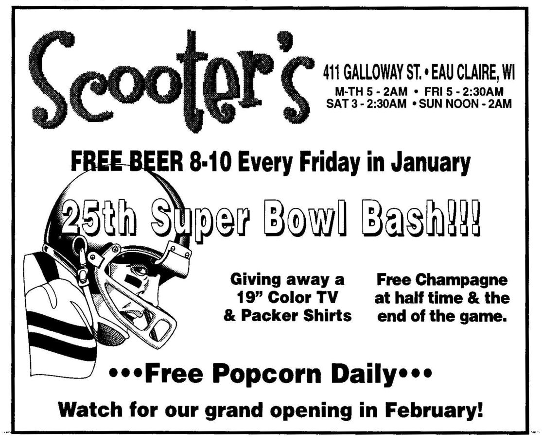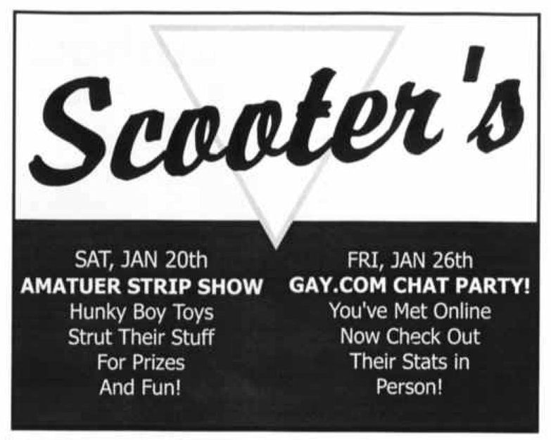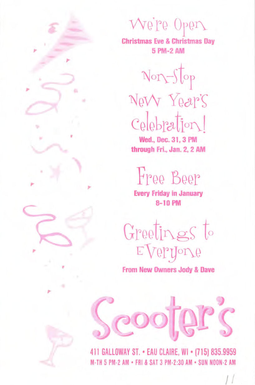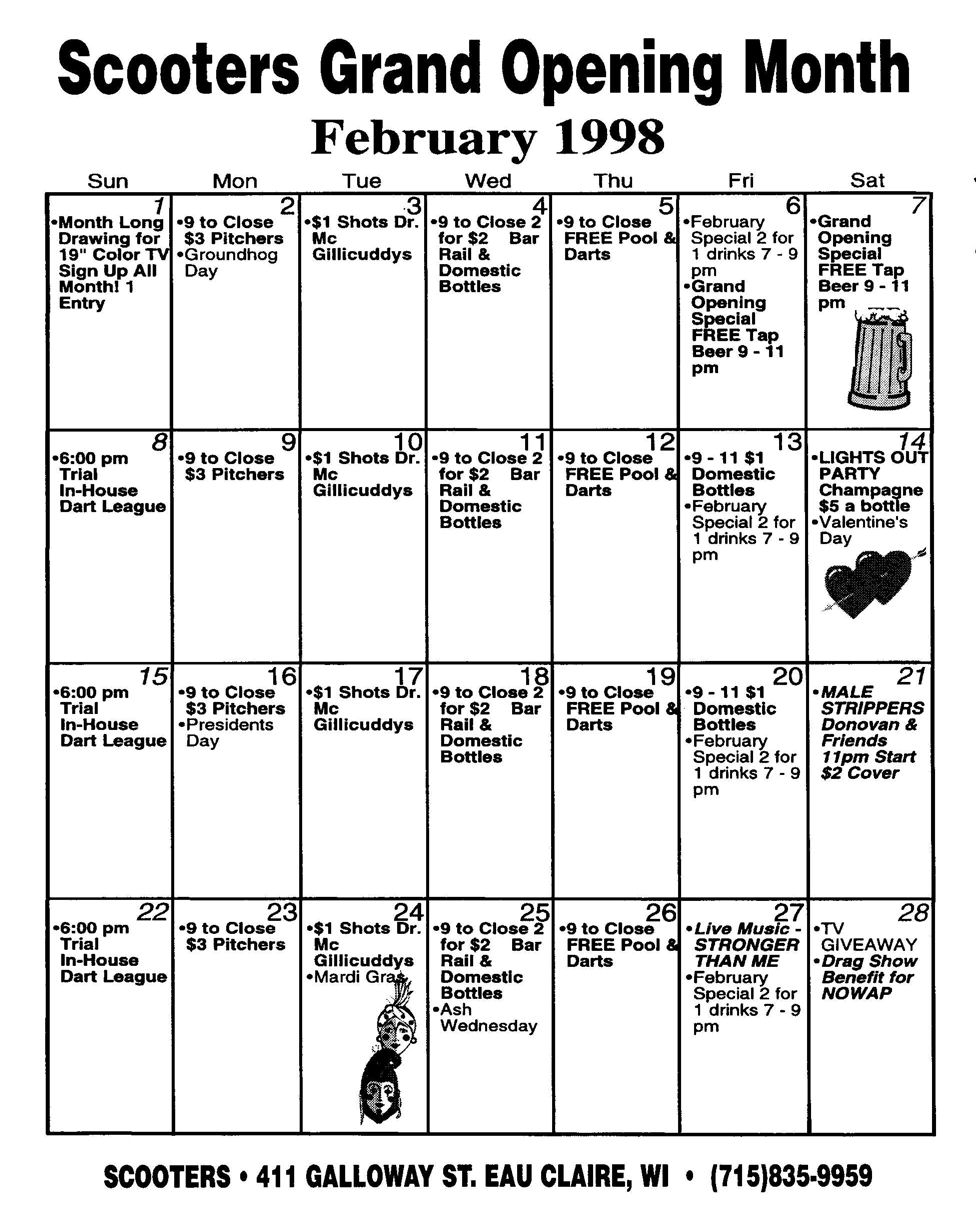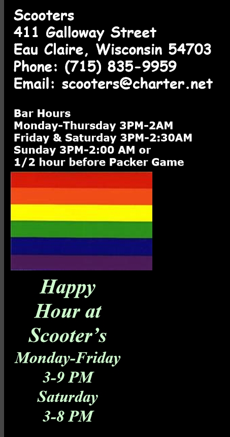 Scooters opened in Eau Claire on January 3, 1997, under the ownership of Wayne Marek, who was the owner of another operating LGBT bar a block away, Trading Company. The business location had previously been open first as nights-only gay bar The Back Door (1991-1992) and then Scruples (1992-1996). The first months of advertisements for 'Scooters' shared ad space with The Trading Company ads, in at least one case calling it a "sister bar". In December 1997, the bar had "new owners Jody & Dave", and ads no longer mentioned the Trading Company. The new owners held a Grand Opening on Friday February 6, 1998. Our understanding in mid-2022 is that Jody Kvapil and David Beranek are both still business partners in the bar as it celebrates 25 years in business serving the LGBT community-- one of the 8 oldest LGBT bars in the state.