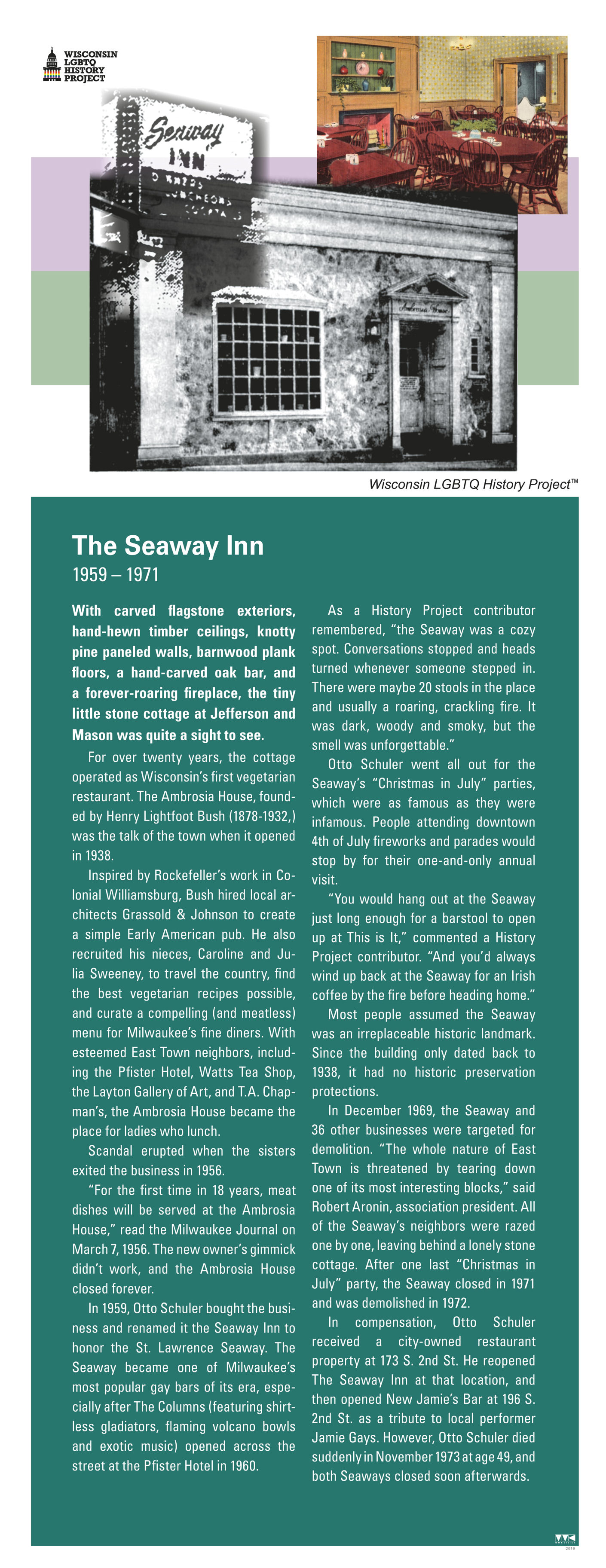 The Seaway Inn is remembered as a popular gay bar. According to one contributor (Keith/ CCK), it was "a very cozy little bar and rather good restaurant on the corner of Jefferson and Wells, right across from the Pfister Hotel with a parking lot growing around it later on. The little bar was in the front corner in a separate room from the restaurant which made it very cozy, especially on a winter evening. It had a 'Friends' kind of feeling about it where conversations would stop when anyone stepped in and someone would usually (call your name) and motion you over to one of maybe only 20 stools in the place. It was woody and smokey, something we didn't mind in those days. The lights and the smell was just right." A short article in the August 1972 issue of 'GPU News' says the Seaway Inn was forced to close in July 1972 (not 1971 as shown in the historical panel to right and below)). It reports that it relocated to two new sites: the restaurant to 173 S. 2nd as Seaway Restaurant (formerly the Knight Owl Restaurant), and the bar to 196 S. 2nd. as 'The New Seaway' known as Jamie's (formerly the Castaways South). (The following history of the Seaway Inn was written by Michail Takach, for an historical panel (see image to right) created by this project in 2019. The panel is on loan to the 'This Is It' bar in downtown Milwaukee.) With carved flagstone exteriors, hand-hewn timber ceilings, knotty pine paneled walls, barnwood plank floors, a hand-carved oak bar, and a forever-roaring fireplace, the tiny little stone cottage at Jefferson and Mason was quite a sight to see. For over twenty years, the cottage operated as Wisconsin's first vegetarian restaurant. The Ambrosia House, founded by Henry Lightfoot Bush (1878-1932,) was the talk of the town when it opened in 1938. Inspired by Rockefeller's work in Colonial Williamsburg, Bush hired local architects Grassold & Johnson to create a simple Early American pub. He also recruited his nieces, Caroline and Julia Sweeney, to travel the country, find the best vegetarian recipes possible, and curate a compelling (and meatless) menu for Milwaukee's fine diners. With esteemed East Town neighbors, including the Pfister Hotel, Watts Tea Shop, the Layton Gallery of Art, and T.A. Chapman's, the Ambrosia House became the place for ladies who lunch. Scandal erupted when the sisters exited the business in 1956. "For the first time in 18 years, meat dishes will be served at the Ambrosia House," read the Milwaukee Journal on March 7, 1956. The new owner's gimmick didn't work, and the Ambrosia House closed forever. In 1959, Otto Schuler bought the business and renamed it the Seaway Inn to honor the St. Lawrence Seaway. The Seaway became one of Milwaukee's most popular gay bars of its era, especially after The Columns (featuring shirtless gladiators, flaming volcano bowls and exotic music) opened across the street at the Pfister Hotel in 1960. As a History Project contributor remembered, "the Seaway was a cozy spot. Conversations stopped and heads turned whenever someone stepped in. There were maybe 20 stools in the place and usually a roaring, crackling fire. It was dark, woody and smoky, but the smell was unforgettable." Otto Schuler went all out for the Seaway's "Christmas in July" parties, which were as famous as they were infamous. People attending downtown 4th of July fireworks and parades would stop by for their one-and-only annual visit. "You would hang out at the Seaway just long enough for a barstool to open up at This is It," commented a History Project contributor. "And you'd always wind up back at the Seaway for an Irish coffee by the fire before heading home." Most people assumed the Seaway was an irreplaceable historic landmark. Since the building only dated back to 1938, it had no historic preservation protections. In December 1969, the Seaway and 36 other businesses were targeted for demolition. "The whole nature of East Town is threatened by tearing down one of its most interesting blocks," said Robert Aronin, association president. All of the Seaway's neighbors were razed one by one, leaving behind a lonely stone cottage. After one last "Christmas in July" party, the Seaway closed in 1971 and was demolished in 1972. In compensation, Otto Schuler received a city-owned restaurant property at 173 S. 2nd St. He reopened The Seaway Inn at that location, and then opened New Jamie's Bar at 196 S. 2nd St. as a tribute to local performer Jamie Gays. However, Otto Schuler died suddenly in November 1973 at age 49, and both Seaways closed soon afterwards. Michail Takach wrote an article for OnMilwaukee published August 31 2016, outlining the full history of building. The article, entitled "Milwaukee's first vegetarian restaurant", is focused on The Ambrosia House (1938-1956)-- which was in 1959 to become the Seaway Inn. In that article, he relates that "For a while, two very different Seaway Inns operated in Milwaukee. Imagine the hijinks that ensued when patrons accidentally visited the other Seaway Inn of the 1960s (525 S. Water St.) that served as the official headquarters for the Outlaws motorcycle club. That bar, deemed 'filthy' and 'obscene' by City of Milwaukee officials, lost its license in 1966, putting an end to any confusion."