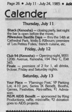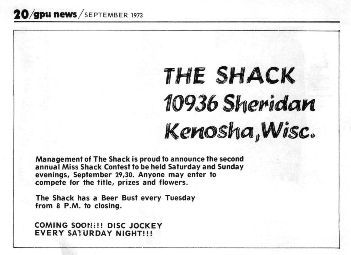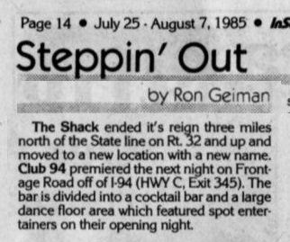 The Shack, south of Kenosha, was pretty much that: a somewhat rundown building with a low profile, tucked away on the west side of Highway 32, between Kenosha and the Illinois state line. The low whitewashed one-story building was non-descript in front, housing a dance bar area and another bar area to the rear. The bar advertised in the August 1972 issue of the GPU News that it would open on September 15 of that year, "newly remodeled, under new ownership, operated by gay management", listing Bob, Frank and Mark. At one point, future Milwaukee bar owner Al Thomas worked at the Shack. There were some holes and odd openings in the building in later years, and one recalls it was sometimes possible to see into the rest rooms from the outside. However the bar was very popular with residents of Racine, Kenosha and towns in north-eastern Illinois (such as Zion), largely because it was somewhat out of the way and therefore anonymous to go to and park at. The first ad for The Shack (in the August 1972 issue of GPU News) says "formerly Liddia's", but unsure if that was a gay bar... But then, the first known advertisement for Lydia's Bar in Racine (in the same issue of the GPU News) says "formerly in Kenosha"- so it was presumably at least gay-friendly. In 1985, with the widening acceptance of gay bars, the owner of the Shack closed this bar and opened Club 94, right off I-94. Club 94 became wildly popular in comparison, attracting all the same people as did The Shack, but also people from Milwaukee and northern Illinois. More information about this business is welcomed from anyone who can contribute it. |