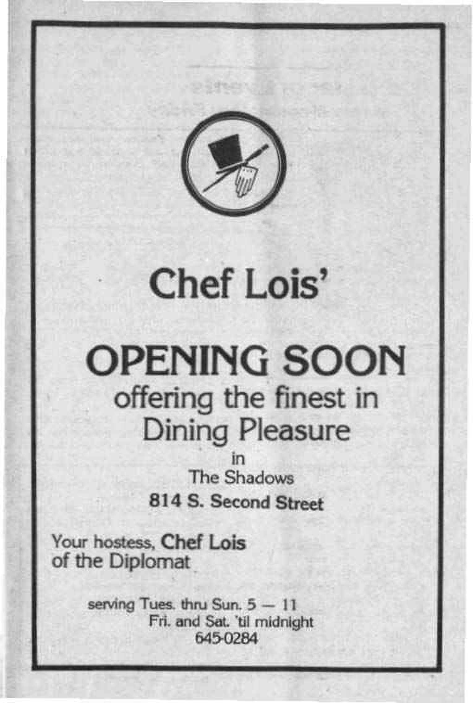 Ad: Chef Lois coming to Shadows