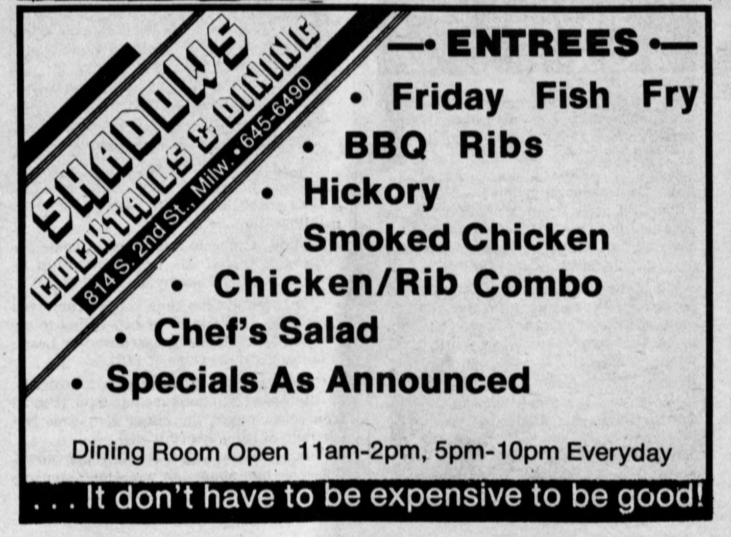 Ad: List of Entrees at Shadows Restaurant