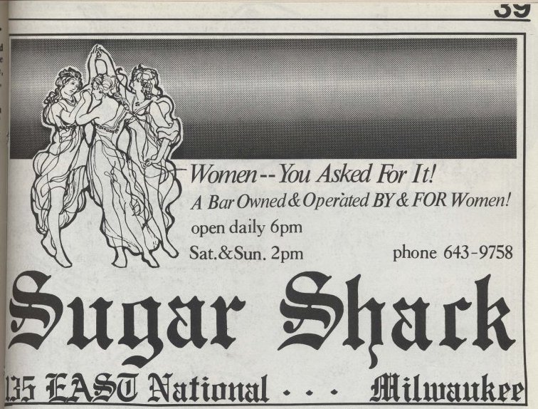 Tired of being "tolerated" by straight bars, and being exploited by gay bars with straight male owners, the lesbian bar Sugar Shack was opened in May 1975 by JoAnn Kilsdonk, with business partner Sharon Dixon (who later opened Fannies). Advertisements for The Sugar Shack (which first appeared in the July 1976 issue of the GPU News) advertised it as "A bar owned and operated BY and FOR women". Sugar Shack becomes incredibly popular-- attracting women from across the Tri-State Area who have nothing like this at home-- often to the point of exceeding the bar's 150-person capacity. "Women were thrilled to know their dollars were staying within the community, for the first time," said Sharon Dixon. "That meant a lot, back then." Cory Scott, the son of the owner, recalls working there as a boy, and attending Brewers games tailgate parties co-sponsored by Sugar Shack and the M & M Club (which opened within weeks of Sugar Shack). The August 1976 issue of the local "GLIB Guide" describes the business as follows: "Women, women, women! And lots of room to mingle. By and for gay women." The Sugar Shack was sold around 1985 to Dotie, who for a time reopened it as a lesbian bar named D.K.'s Tavern. But that was not to last long; the business was sold once more in late 1987 to Al Thomas, who eventually reopened it as a men's gay bar, The Triangle, which was to survive at least 20 years. In a rare interview Sharon gave to LGBT historian Michail Takach in 2017, she outlines much of the inside story and history of the Sugar Shack. Michail's article tells the story: Sharon and her partner Joann Kilsdonk opened the Sugar Shack (135 E. National Ave.) in 1975 with the full support of Alderwoman Mary Ann McNulty. The Sugar Shack was the first bar in Milwaukee history owned by lesbians for lesbians. And it was an immediate success. "It wasn't a big space, but we'd still have 150 women in there at a time," said Sharon. "The women would come from all over Wisconsin and northern Illinois, several days a week. They were just so happy to have a space of their own, and owners who knew what they wanted. They were giving their dollars to members of their own community for the first time." "Of course, guys would come and cause trouble for us. One night, we tried to throw out some rowdy men who refused to leave. They threatened to tear the bar apart. Joann and I got on the loudspeaker, cut off the jukebox and said 'Hey ladies, these guys want us to know what we're going to do if they won't leave.' "Suddenly, the women closed in around them, and the guys started backing out the door. The next thing I know, the guys are running west down National Avenue with this huge mob of women chasing them. One of them dropped their ID, and one of the local beat cops offered to take it home to him. "As it turned out, the guy's father was a police officer. When he got his son's ID back, he asked where the police found it. The officer said, 'we found it in a woman's gay bar, where he and buddies went to beat up the lesbians.' The father's face got tomato red, he ground his teeth and steam started coming out of his ears. We never did see his son or his buddies again!" In 1979, Sharon and Joann separated, and Joann kept the business running another two years. When Joann sold the Sugar Shack in 1981, Sharon decided it was time to open a new business (and she eventually opened Fannies in 1982 or 1983). Once-owner JoAnn Kilsdonk Lott passed away in November 2019. |