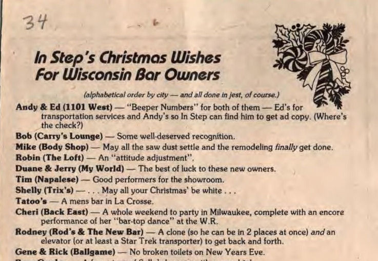 Tattoo's in La Crosse opened as primarily a lesbian bar. It is believed to have opened sometime in 1982, first being listed in 1983 national Gay Guides. It was then listed in the Bar Guide listings of 'In Step' magazine from that magazine's first issue in February 1983 until the bar closed on January 12, 1989. One thing of note is that the 1983 issue of 'Places of Interest' listed the bar as "primarily women", but the 1984 issue of the same guide listed it as "men and women". Other national gay guides also subsequently indicated the bar was for both men and women. However, throughout In Step's listings (Feb. 1983-Dec. 1988) it was listed as "Wm D", meaning "Primarily women but men welcome/ Dancing). The bar apparently changed its name from "Tatoo's" to "Tatoo's II" around November 1985 (IS v2-24), although we don't know the reason for the slight name change-- it may have been related to a conversion from primarily a women's bar, to one catering to both women and men. Unfortunately, we have not yet located any advertisements or photos. More information about this business is welcomed from anyone who can contribute it.
