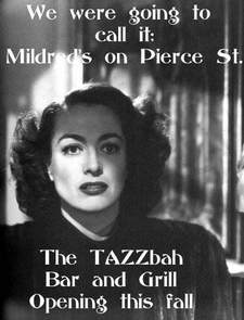 Prior to their Grand Opening party in January 2005, the bar's web site had a “What is TAZZbah?” contest, asking people to guess what the bar's name stood for. Contest entrants later got this reply: "The correct answer is... Well, there really is no word “Tazzbah”. The word is a combination of the name of one of our pets (‘Taz) and Casbah (as in 'Rock the Casbah'.)". The email was signed "The Tazzboys: Steve, Don, Tobin, Ed, Craig, and Jan". Much later one owner, Don Martinson, explained it as follows: "We had a cat named Mumtaz (the princess for whom the Taj Mahal was build), but we usually called her 'Tazz'. Then for one reason or another, the subject of the Casbah (older, native Arab quarter) came up and we combined the two into Tazzbah. Pretty much serendipity."