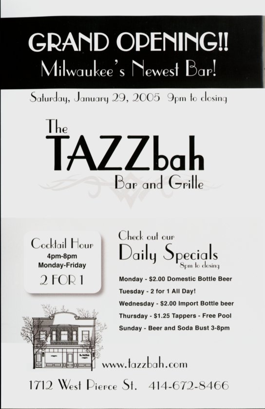 "There is no one reason why the Tazzbah wasn’t a success, but I often tell folks that if the bar were located someplace down on 2nd St., we would have a better chance. Location, location, location. We scoured the Walker’s Point area for some time and even made an offer on a location in WP (Walkers Point) that was advertised in InStep. But the owner changed their mind, so we were forced to look further afield. The location at 17th and Pierce St. was a dive, but ripe for rehab. I think most folks would agree that the rehab was a success, but other factors made us see that it would never catch on, located where it was. Steve had been in the service industry, including several of most popular bars at the time. I had experience in property rehab. We figured that a combination of our talents would have a reasonable chance of success. We agonized over whether to aim for a gay crowd or try to build our own, neighborhood clientele, but we had more experience in the former and were able to attract a loyal, but unfortunately, a bit too small clientele, and we had watched while others went into bankruptcy in an attempt to keep their businesses open despite the financial writing on the wall. Nonetheless, we figured no guts, no glory. So in the end, we were able to say “well we tried” rather than “if only we’d tried” and were to be able to accept the consequences and get on with our lives. The silver lining was that we made a host of good friends. Thanks to all who supported us!"
