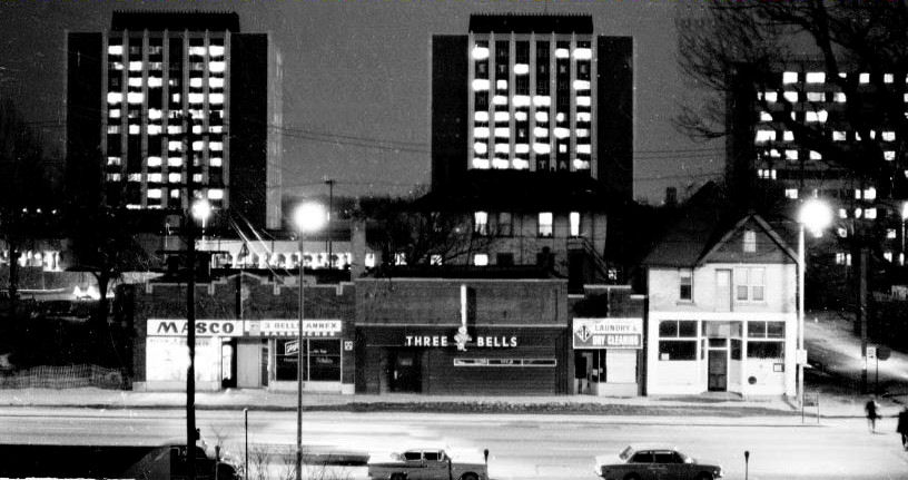 Three Bells was a mixed bar that combined gay "fly boys" from Truax Field airport, butch lesbians, and straight college men, all under one roof. Female students were encouraged to stay far, far away, especially once the modern "southeast dorms" opened in the mid-1960s. Owned by Melvin Andre, later the founder of Park Bank, and managed by Ken Burns, the bar was very popular with former servicemen after World War II. Throughout the 1950s, there were often lines of men out the door, many of them in their sailor uniforms. Mel was remembered as a former Navy man who chain-smoked cigars in the bar day and night. The name "Three Bells" is a naval reference to the signal on a ship’s bell indicating that 90 minutes of a 'watch' (standing watch) has passed. Despite a memorable neon sign of "Three Bells" lighting up, the bar had a long-time reputation for being both "tough" and "townie." Beer was sold by the pitcher and fights broke out almost nightly. (The 1969 International Guild Guide listing included the note "popular with construction workers".) In response, Andre hired the biggest, toughest Badger football players to serve as bouncers. In 1965, the UW Board of Regents launched a five-year battle to seize, raze, and develop the 700 and 800 blocks of University Avenue. Three Bells, and its neighbors, were seen as vice-ridden, blighted, and not aligned with university values. By 1969, construction had begun on the "Murray Mall" project which ultimately built University Square and the Humanities Building. Today, the Fluno Center sits on the footprint of yesterday’s Three Bells.