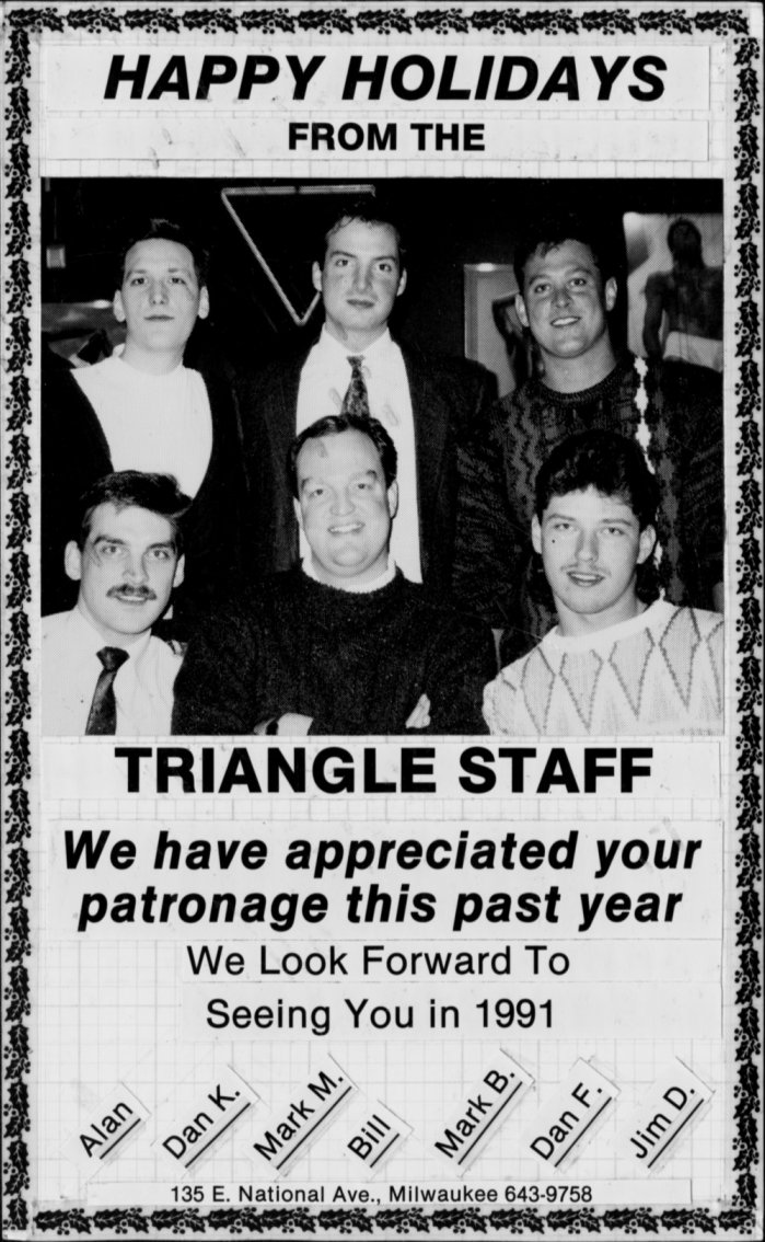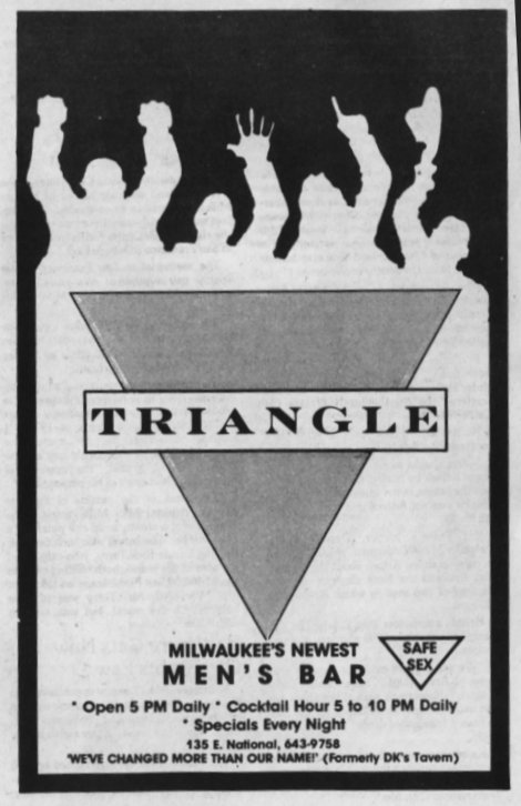 Late in 1987, Al Thomas was looking for a location for a new gay bar. He saw an ad that D.K.'s Bar, a lesbian bar, was for sale, and decided it might be a good location for gay bar- perhaps lesbian, perhaps gay. Meanwhile, the location was in the area fast becoming the primary concentration of LGBT bars in the city. (These are documented in the "Milwaukee Bars Region 2" page.) All of these other LGBT bars in the area during this time meant there would always be new, younger people discovering his new bar as it was that close to other bars. On December 5, 1987, Dotie held a farewell party for customers and staff of D.K.'s Tavern. On the very next night, the bar re-opened, and new owner Alan Thomas (formerly a resident of Kenosha who had bought the business and moved up to Milwaukee) declared it was "still a women's bar" and would retain the same staff and name. But within a few months business had shown that a change was needed; Al renamed the business The Triangle in June 1988 and reopened as a gay bar. (IS SO 4-20) On its opening, Triangle was extremely popular as "the" place to start a Friday or Saturday prior to migrating to La Cage (the popular nearby dance club), and Triangle typically picked up in business again close to closing time as a last stop. Over time, Triangle became popular for occasional shows and other events (including annual holiday parties), and added an outdoor patio. It was also a relatively early bar, often times the best place to be for people wanting a few drinks or to socialize right after work (4:00-6:00pm). The Triangle has had its share of ups and downs in business, but survived through several changes in ownership and customer base. At one point (in 1998) two popular bartenders left, opening their own gay nightspot Fluid (located closer to La Cage), and taking a good number of customers with them. The final chapter however began some years later, in March 2011, when James (James Marr, aka Lana St. James) died suddenly. Ownership passed to a family member, but the bar was already suffering from a severe drop in popularity- partly due to the economy, as well as a failure to keep current and attract new clientele. The bar was closed briefly in February 2012 for an ownership change and licensing issue, but then held its Final Party on Friday, April 27, 2012. A last bash private party was held on Saturday afternoon, April 28, with free drinks and an excellent buffet catered by the La Meranda restaurant (next door)-- after which Triangle closed its doors for good. Owners of the Triangle bar were: Recollections: The following are recollections of others who have been kind enough to submit their personal memories to the webmaster. You are welcome to do the same! (Recollections collected and organized by Jamie Taylor.) "The bar is currently owned by James (aka Lana St. James) This bar has seen it's changes over the years. James added more video screens, removed some of the built in tables to make room for dart machines and a stage. The stage and video center/magazine rack was built by a very talented carpenter... me.. lol. The place had the strangest men's bathroom. When you walked in, you had to walk past the toilet to get to the urinal. Imagine having to do more than just pee there. That has since been changed. Lots of time and money went into improving the patio for patrons to enjoy cocktails a huge video image and fresh air." ![]() |
