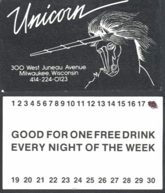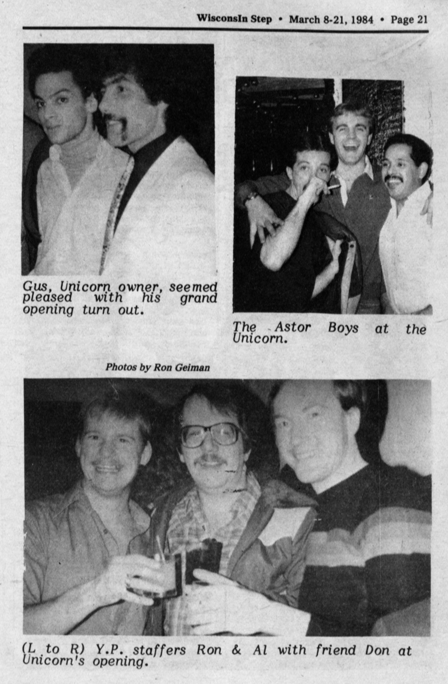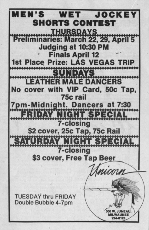 The Unicorn was short-lived as a true 'gay' bar. It opened in February 1984 in the basement of the colorful Sidney HiH building, with its Grand Opening in March. (In the LGBT periodical 'In Step' (vol 1-02) advertisement at right, mentioning the upcoming Grand Opening with "leather male dancers" on Sundays, note the small icon in the lower left corner, reading "Come In.. the Rear Door"-- referring to a single windowless entry door in the dark rear/ north side of the building, just feet away from a towering freeway overhead (see photos to right). The double entendre can't be accidental!) The bar was owned by Gus Hosseini, who also owned Gus' Mexican Cantini and managed the Sidney HiH bulding, in the basement of which The Unicorn operated. (It is reported that Gus immigrated to the United States from Iran as a young man in the 1970s.) The Unicorn itself was preceeded by another short-lived gay bar in the same space. Called the Goldenshaft (or 'Golden Shaft'), it was a disco primarily frequented by gay men. According to an OnMilwaukee article, Golden Shaft was eventually owned by Gus Hosseini; but "when the disco scene started to wane, he knew it was time for a fresh concept. In preparation for the venue change, Hosseini remodeled the space and cut into the walls so the cave-like performance rooms were connected. He painted most of the space black, and one of the rooms he painted blood red.-- and he then reopened it as the Unicorn." By September 1984 the Unicorn had closed as a 'gay' bar, and quickly reopened as an almost 'underground' bar (punk and alternative). It was to become famous for hosting many punk/ alternative bands. According the above 'OnMilwaukee' article, "The Unicorn went on to host many bands when they were on the cusp of fame, including the aforementioned Smashing Pumpkins, Soundgarden and Nirvana." (An article from "OnMilwaukee.com" dated November 2005 recalls "Milwaukee's Best Bars of Yesteryear", which includes The Unicorn bar. It reads: "Remember the dingy cave in the basement of the Sidney-HiH building? The Unicorn opened in 1984 and became Milwaukee's premiere underground venue as the '90s dawned. The dank club -- with numerous rooms -- offered incredible underground shows, including Nine Inch Nails before they got famous (anyone else at this show?) and Brand New Heavies.") In 1997, the space took on a third life in the gay community, as the Milwaukee Eagle, a levi/ leather bar. That bar had a better go of it (third time's the charm?), wildly popular for over two years. More information about The Unicorn is welcomed from anyone who can contribute it. |