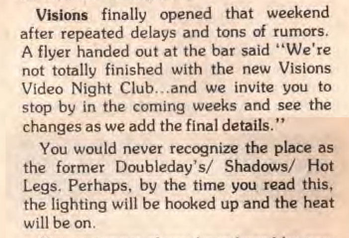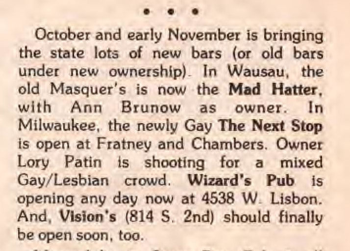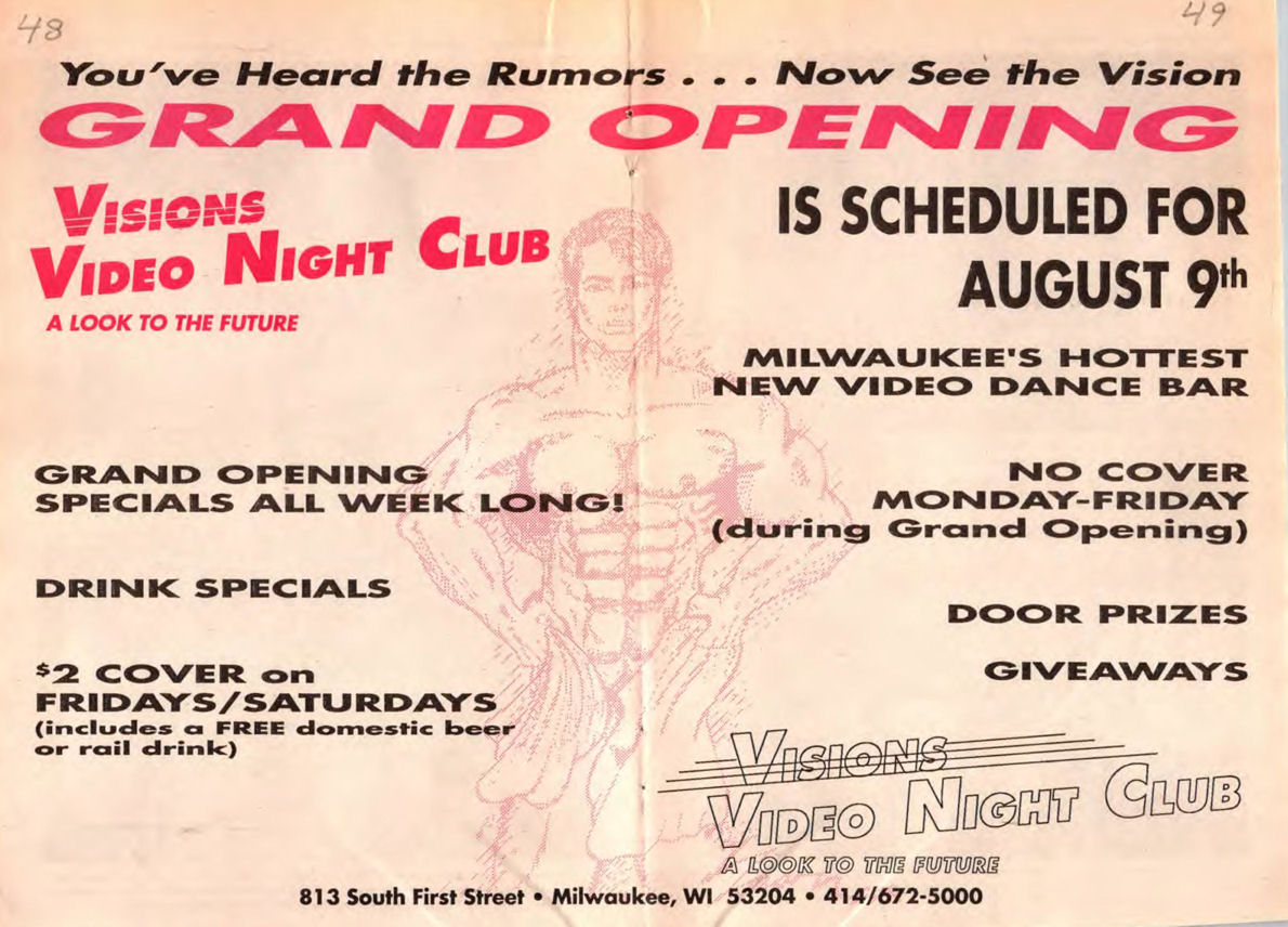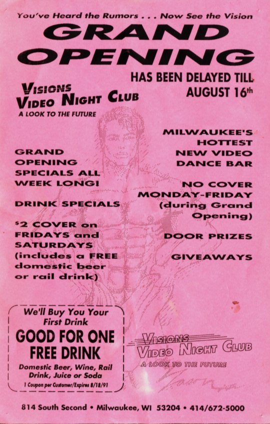 Visions Video Night Club was one of Milwaukee's shortest-lived LGBT bars. It was originally advertised in August 1991, but after several delays, didn't open until November 23, 1991. Even then, a flyer handed out at the bar opening weekend said "We're not totally finished with the new Visions Video Night Club... and we invite you to stop by in the coming weeks and see the changes as we add the final details." The article in 'In Step' magazine's December 5-18, 1991 issue added "Perhaps, by the time you read this, the lighting will be hooked up and the heat will be on." But that is the last issue in which the bar is mentioned, or listed in the Bar Guide. So presumably the bar closed after just a week or two. One has to wonder whether that location had a jinx on it. It had previously held other LGBT businesses; the first few lasted several years, but the previous LGBT business here was also short-lived. They include: