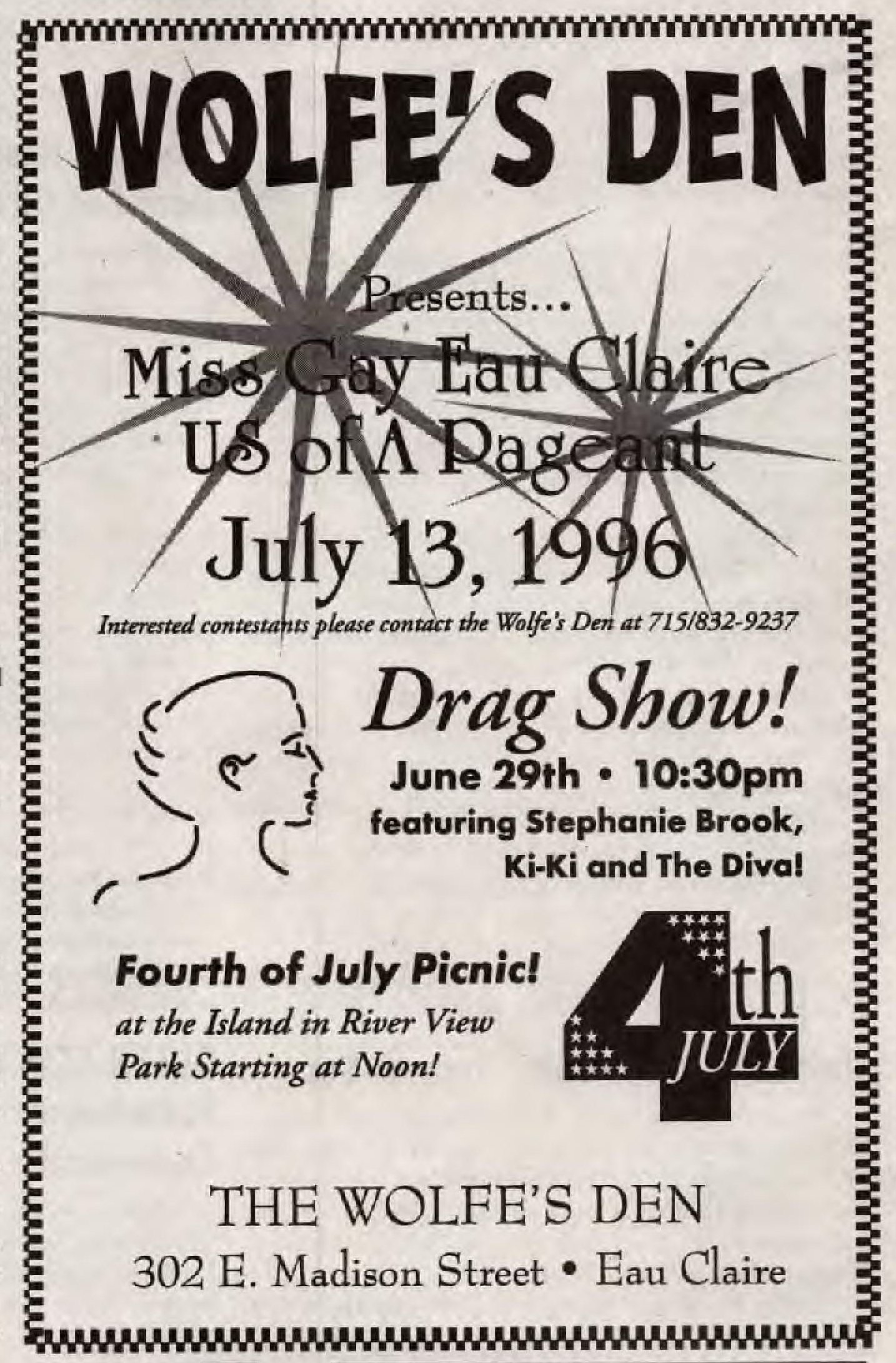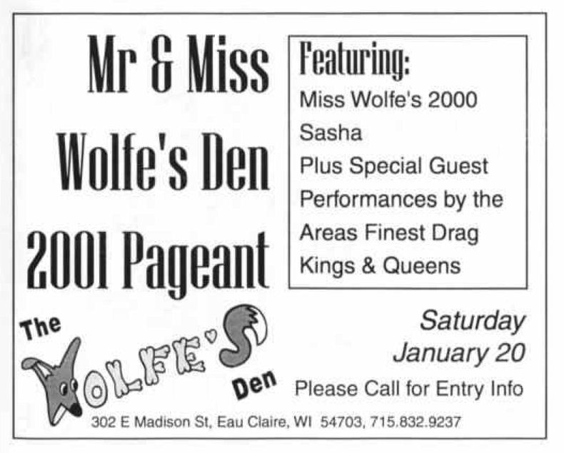 The Wolfe's Den (aka Wolfie's) had been a neighborhood bar since the early 1980's or possibly before. The owner John Wolfe was gay, and word of that got out around 1990; as a result, he lost most of his 'straight' clientele. Meanwhile, most of the remaining customers were the gay regulars, but the owner didn't advertise as a gay bar until The Trading Company opened in 1995, giving him the confidence to advertise more openly. John Wolfe the owner passed away in 2005, and the bar became incorporated with a neighboring restaurant. (It is no longer gay.) More information about this business is welcome from anyone who can contribute same.