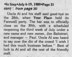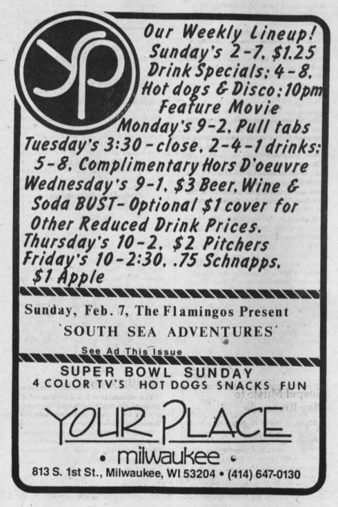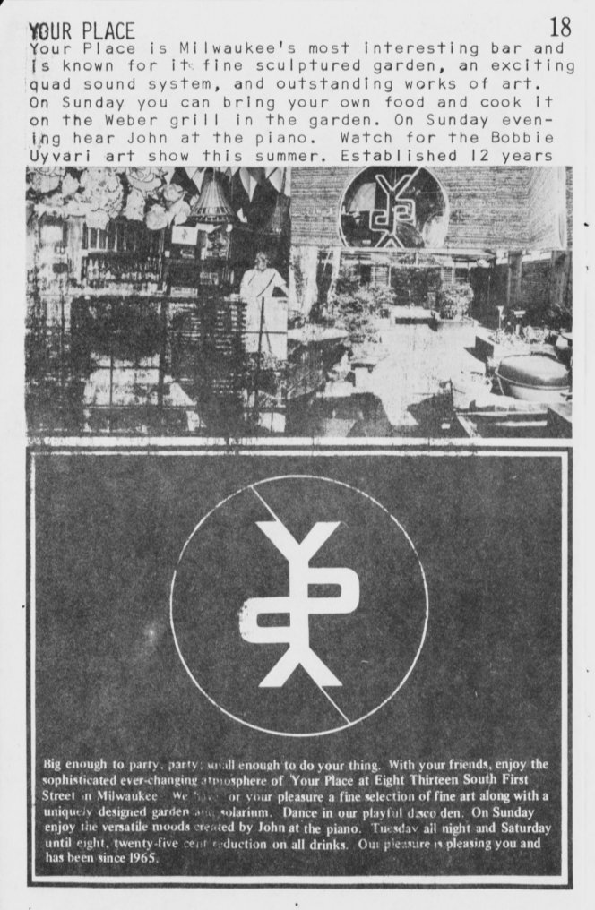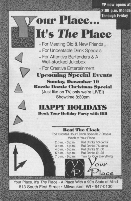 Recollections: The following are recollections of others who have been kind enough to submit their personal memories to the webmaster. You are welcome to do the same! "Your Place - The first bar I would hit when I headed out to the bars and sometimes the bar I stop at on my way home. Had the long bar up front, the tiny dance floor mid bar, the pool table and a little piano bar out back before they added the patio." "In my early years “out” in Milwaukee, one of the first bars I was taken to was YOUR PLACE. When I first heard the name, it was in a context where I thought I was being asked to go to my own home for an “encounter”, but learned that it was the name of a club, and my “friend” simply wanted to go there. In any event, in those days at Christmas time, part of the holiday décor at YOUR PLACE was a painting by Bob Uyvari... The painting had a group of what I can best describe as “altar boys” or “choir boys” apparently singing what I would assume to be holiday melodies. The not so hidden fun part of that painting was that one of the “choir boys” had his hand on the crotch of one of the other “choir boys”. The painting was classical in motif, and at first glance that element would not be noticed. I have to wonder whatever happened to that great piece of art." "In the years I went there the big draw for me was the pool table and hot guys. When it changed to Partners the manager saw some of my 'artistic' photos (they were black & white industrial style photos). He asked me if I would loan them to the bar. I did and as a result, I sold a few copies of those photos. "After the bar was sold it was turned into a 'Gentleman's Club'. I happened to know one of the girls there and went to see her. She knew I was gay and she was all over me, pissing off the rest of the crowd because I was getting all the attention. It was fun."- Jamie Taylor