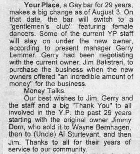 Your Place, also known as "The Y.P.", was an extremely popular bar in Milwaukee throughout the 1970's and 80's. It was opened by Jim Dorn and his partner Jerry Bentley, with his parents' assistance; kind of a family-operated gay bar. The bar is significant especially because it was the FIRST gay bar in what would later become the primary 'gayborhood'. Jim Dorn's story and how he came to open one of Milwaaukee's iconic "gay" bars is recounted in a 2016 story on the OnMilwaukee website (written by Michail Takach, Curator of this Wisconsin LGBT History Project). In it, Dorn's niece Kim S. recounts what the bar meant when it was opened: "For many years, Your Place operated without a sign out front. It was only recognized by the blue light bulbs next to the entrance door. The name 'Your Place' was deliberately chosen so that men could openly make social plans without anyone knowing they were going to a gay bar. I don’t remember any backlash from the neighborhood. For a time (before it was a gay bar), the next-door neighbor would complain about noise. So when the building came up for sale, my grandparents bought it! "'Your Place' was really ahead of its time. It was the first gay bar in Milwaukee with a light-up dance floor. It was also the first gay bar in Milwaukee to have a landscaped back patio, with live entertainment, tropical gardens, sculptures and barbecue grills. Guests were invited to bring their own food and grill out. If they didn’t have any food, the bar would make sure they got fed. It was really a close-knit, caring community." Dorn's niece, Kim S., shared some of Dorn's background on the Milwaukee LGBT History Facebook discussion page in 2016: "My uncle was dishonorably discharged from the Navy in the early 1960's. I still have many of the letters he wrote to my grandmother when he first took to sea with his fellow sailors. He was moved to tears by the male voices in the Navy choir and so encouraged to be a part of something larger than himself. "After the Navy wouldn't have him for reasons he could not control he returned to Milwaukee, met the love of his life and opened one of the first (openly) gay bars in the city. He called it Your Place so men making plans within earshot of their coworkers would not be ashamed to discuss the location where they would meet. The bar had no sign out front, just two blue lights beside the entrance. In later years it was known simply as YP and provided a safe haven for more young men than I could ever count. He was known as Mother Dorn to many generations of boys seeking only to live a life without persecution or fear." The bar long featured original art work, and was especially known for a round ceiling mural by local gay arts Robert Uyvari (see below). It is perhaps best known as probably the first gay bar in Milwaukee with a large outdoor patio. The patio was used for summer barbecues virtually every weekend, and was well landscaped with lights, plants, paths, benches and a stage for shows. This was also one of the favorite smaller dance bars in town, although in later years the dance area held a pool table. Between the main building and the patio was an enclosed porch, with a small bar service area and large windows facing the patio; this was a favorite spot to sit and talk or enjoy drinks separate from the main bar area. (An advertisement in the September 1976 issue of GPU News encourages patrons to "come in and see our garden and lighted dance floor".) The August 7, 1976 issue of the local "GLIB Guide" describes the business as follows: "Popular multi-purpose bar. Cruising, socializing, or for an outing with your lover. Dancing, pool table, garden." The August 28, 1976 issue of "GLIB News" made this mention of the business: "An outdoor carnival with food, drinks and games will be held in the parking lots of Your Place and the Black Forest Inn on Labor Day, Sept. 6." And the Spartacus American Bicentennial Gay Guide (1976) described it as "Piano bar, shows, dancing, plus a nice crowd." At some point, the bar was sold by Dorn to Wayne Bernhagen, who from 1972 to his death owned the iconic "Wreck Room" bar. Bernhagen then sold the bar to "Uncle" Al Sturtevant around 1981. On June 28, 1989, 'Uncle Al' closed the YP after his 7-and-a-half year reign as owner, and sold it to Jim Balistreri, who reopened it late in July as "Partners" under the management of Paul. The large round painting of a male nude angel, by local artist Robert Uyvari, which had long hung over the front bar, was auctioned off at a "Make A Promise" Dinner in April 1990 as a benefit for the ARCW. (There are slightly conflicting accounts about the chain of ownerships and dates. For example, some accounts call 'Uncle Al' the second owner, and do not mention a period of Wayne Bernhagen's ownership. Other accounts mention a 1988 transfer to 'Uncle Al' and his sale to Jim Balistreri as 2 years later rather than the 7 mentioned in other accounts.) The bar as "Partners" had lost much of its popularity however. In May 1993 the bar had a party celebrating 28 years since it had opened as "Your Place", and was renamed back to "Your Place" in an attempt to recapture its former glory. Then-manager Gerry Lemmer began negotiating with the owner (Jim Balistreri) to buy the business to continue operating it as a gay bar, but a significantly higher offer from outside proved impossible for Gerry to match. The bar was bought and converted into a "gentleman's club" with female dancers in August 1994. ![]() ![]() Artwork "Fallen Angel" at auction in 1990 shown with David Clarenbach and Tim Carpenter