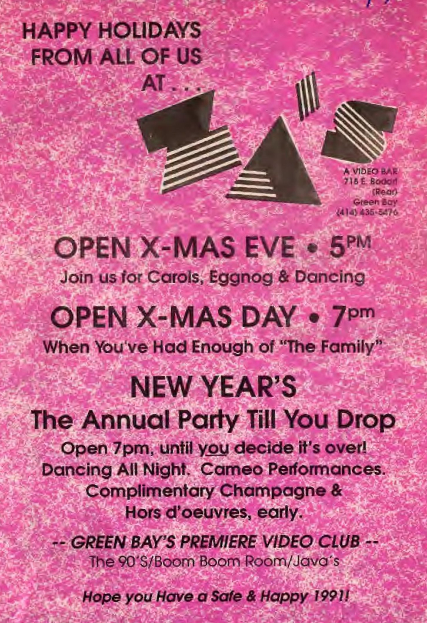 ZA's Videobar opened on Thursday, July 20 1989, by Mark 'Za' Mariucci (who went on to open several other bars as well, and also founded and ran 'Quest' magazine, a Wisconsin LGBT periodical for 25 years), along with Ken Kujava. The bar in that location had formerly been known as Who's bar. Ads often showed an address of 718 Bodart Way (the rear entrance). Just after celebrating their second anniversary, the bar was moved to 1106 Main Street, and called simply Za's. The history of LGBT bars in Northeastern Wisconsin was the subject of an excellent article in the Green Bay Press Gazette in 2020. |