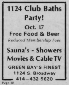 We have almost no information about 1124 Club Baths in Green Bay. The business has an advertisement in the second issue of "Our Horizons" magazine in October 1981, and it was listed in the Business Guide of that magazine's third issue a few weeks later. But the magazine apparently ceased publishing after that issue, and the business has not been found listed in any other LGBTQ periodicals in that time frame. The existing ad mentions a party on October 17, 1981 with "Free Food & Beer" and "Reduced Membership Fees". The ad mentions the business as "Green Bay's Finest" with Saunas, Showers, Movies and Cable TV. However, the listed address is in a residential area, and the building itself (which appears to have been demolished sometime between October 2007 and July 2012, according to Google Map images) was a 2-story house. More information about this supposed business is welcomed. |
