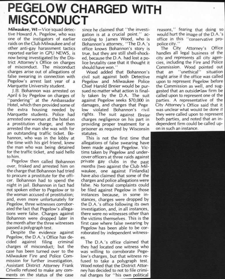 Police officer Vice Squad Detective Howard Pegelow, who instigated raids on Club Baths and other anti-gay harassment, being investigated for misconduct