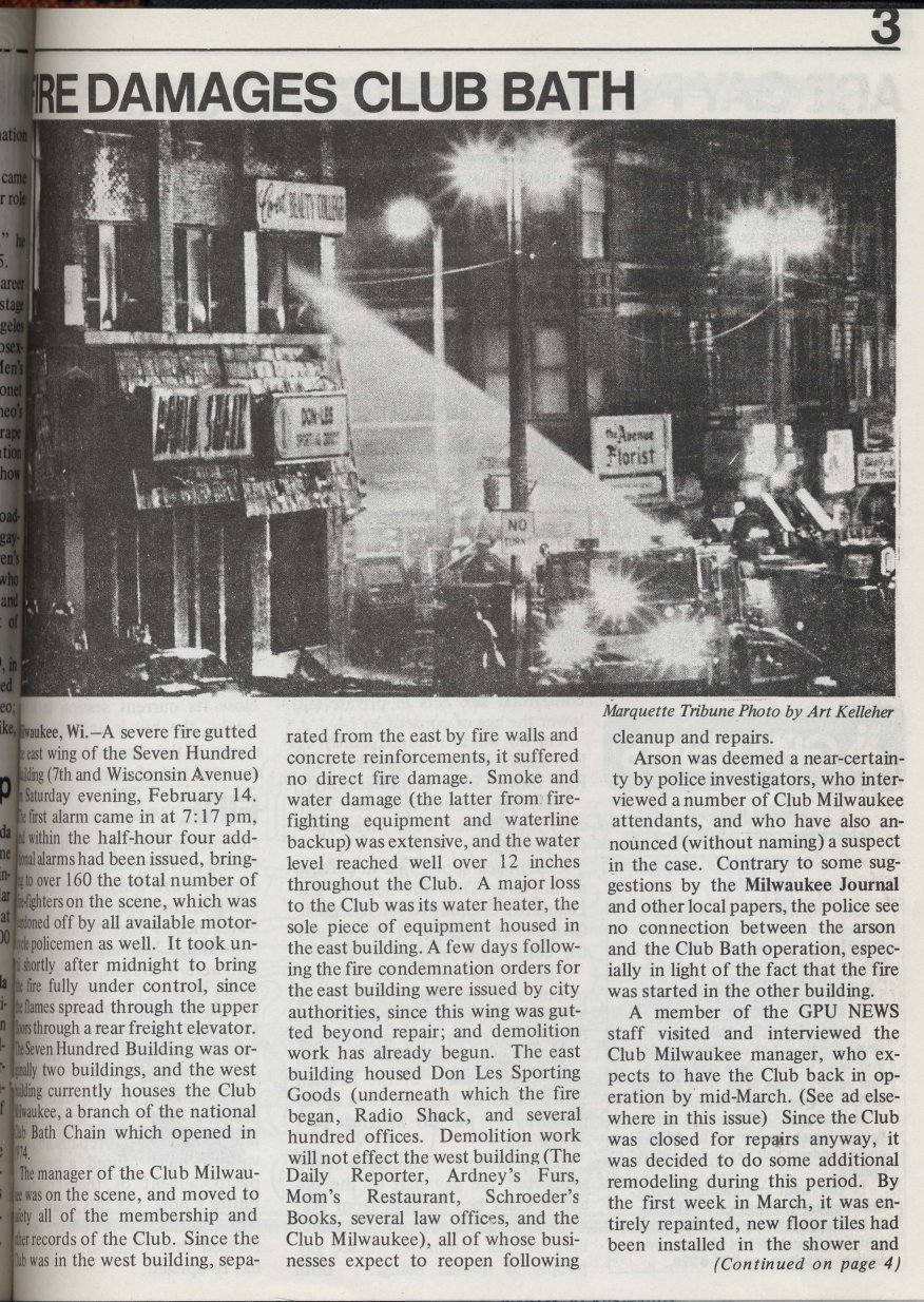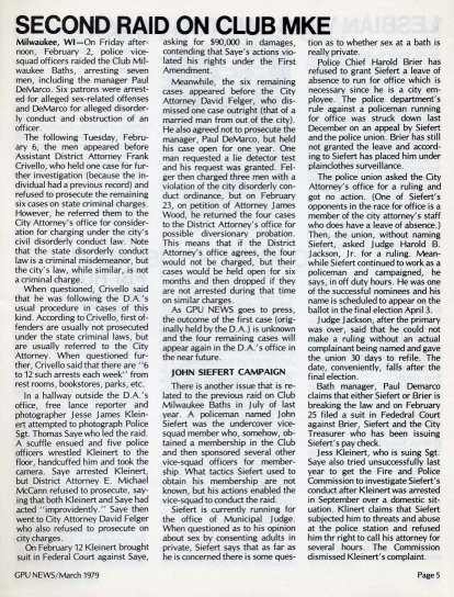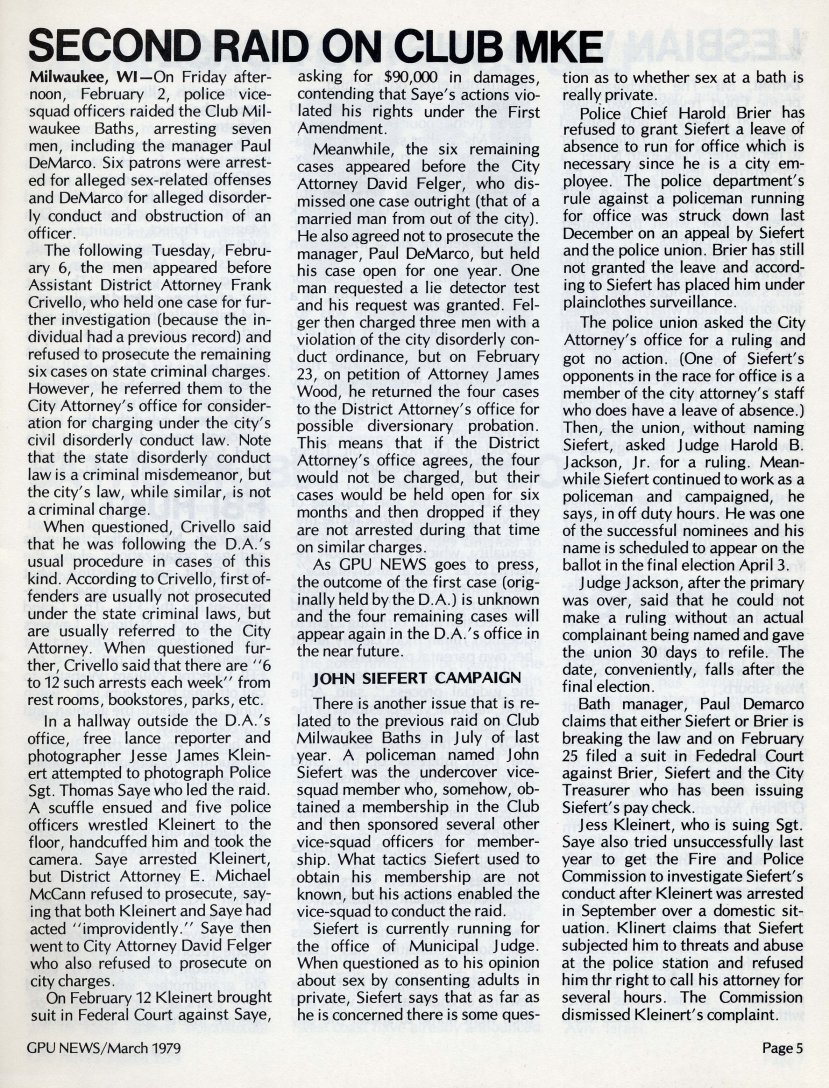 Second Police Raid Club Bath, February 2 1979: seven men arrested, all but one charge eventually dismissed. Also, followup news to the previous raid in July 1978.