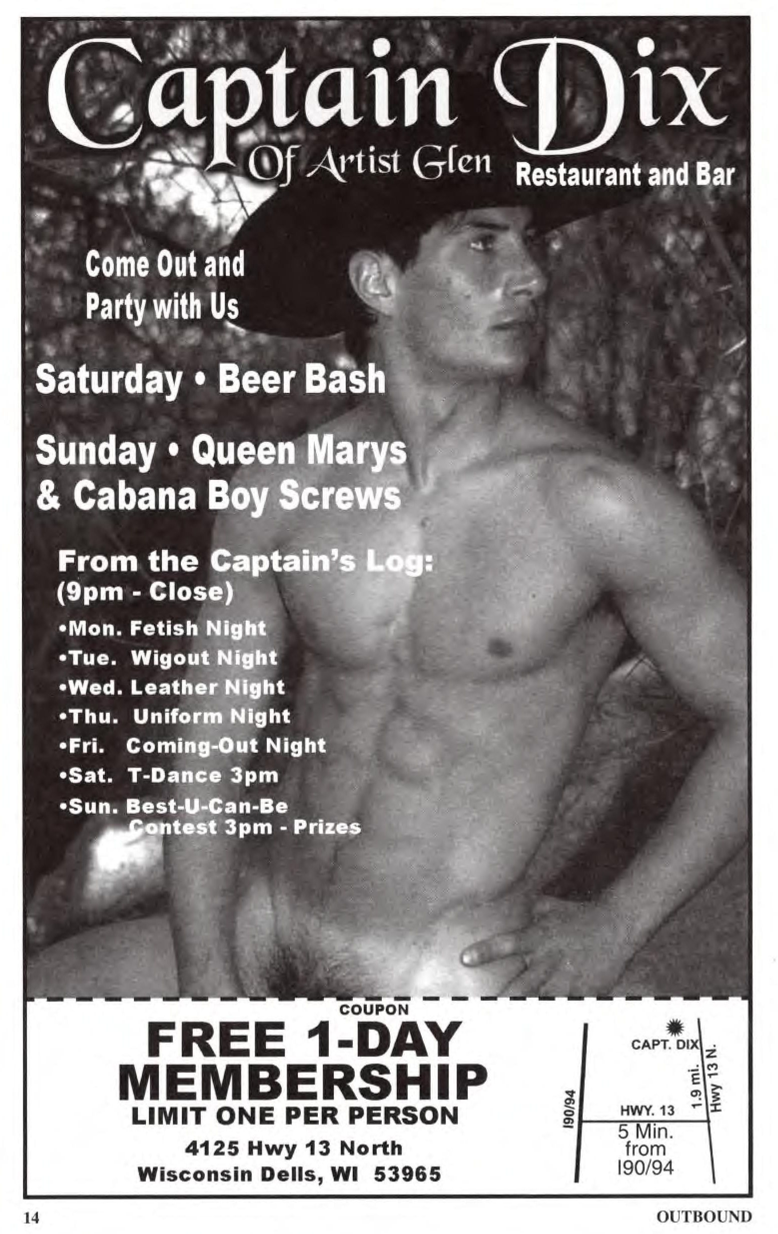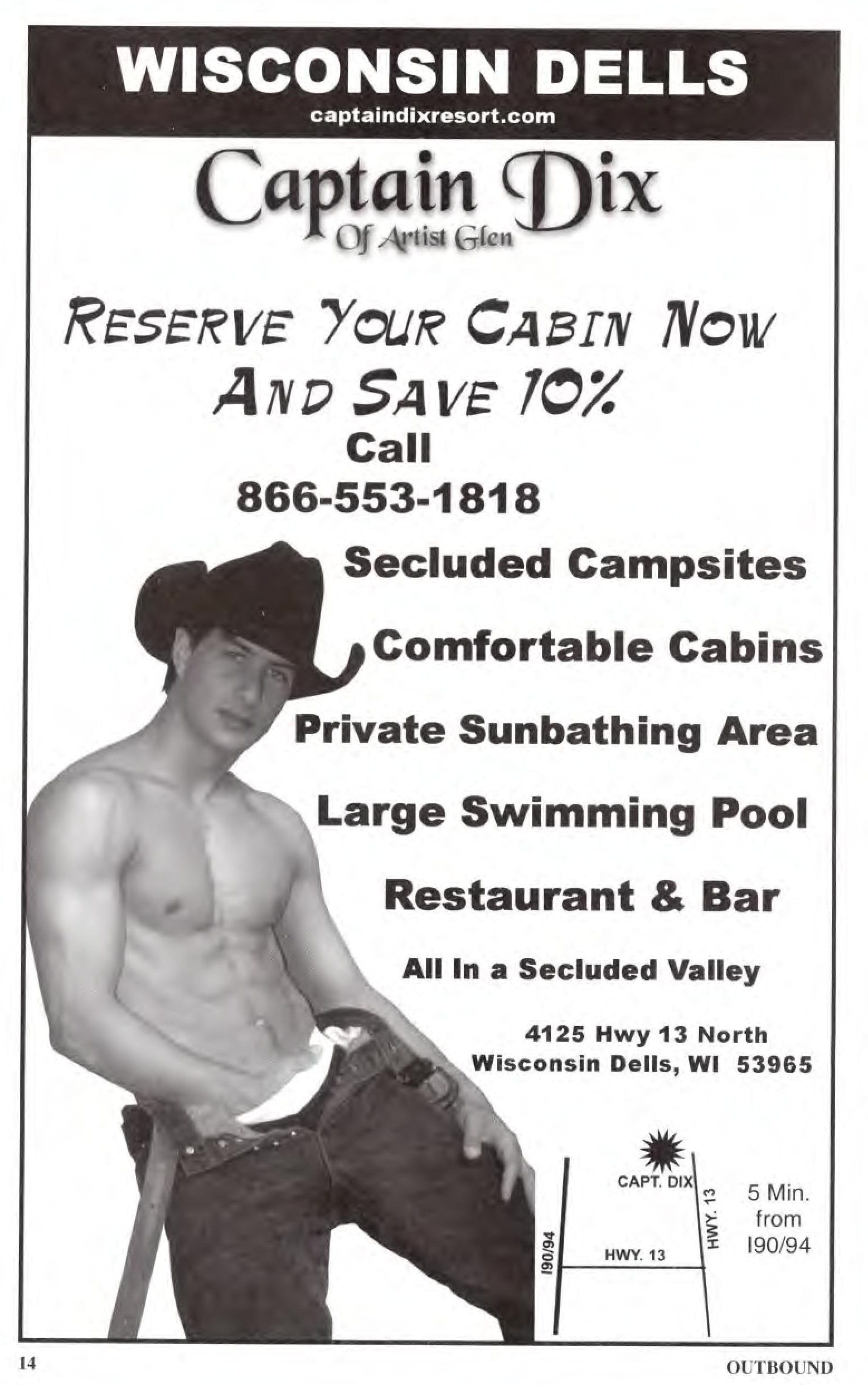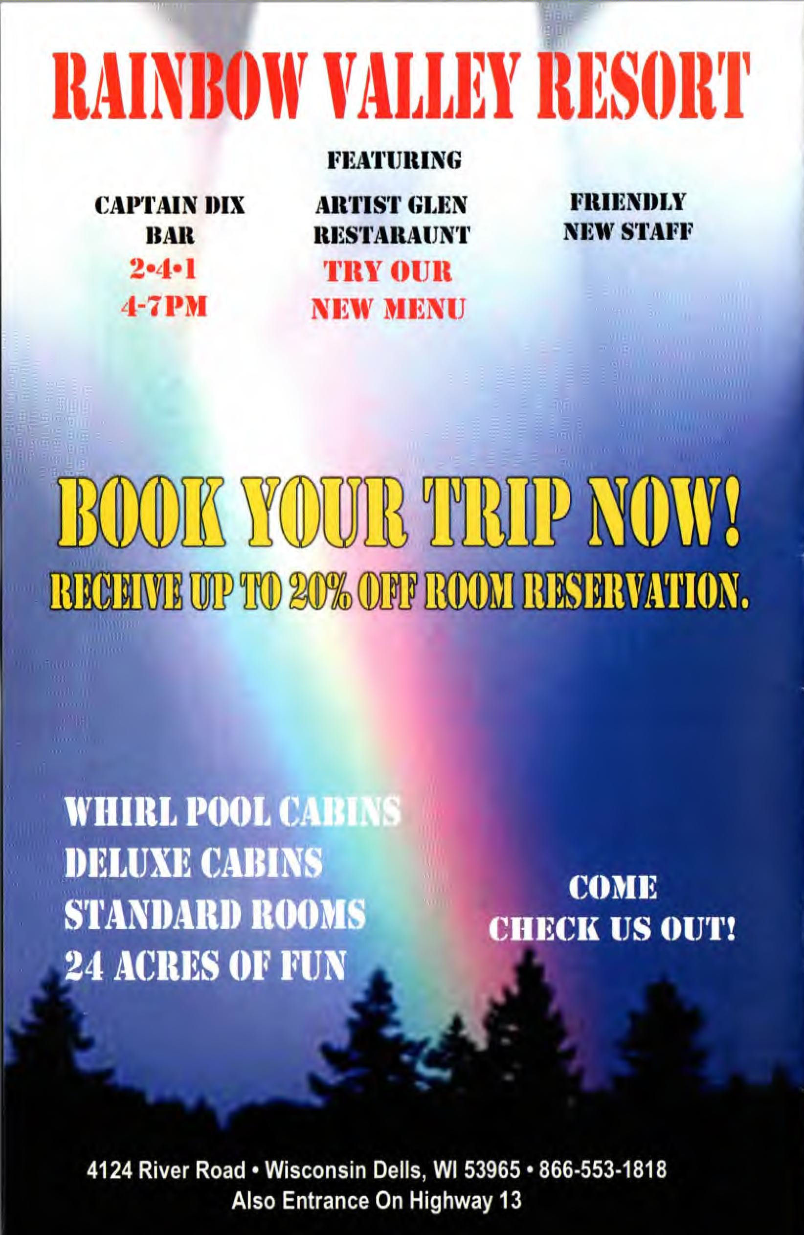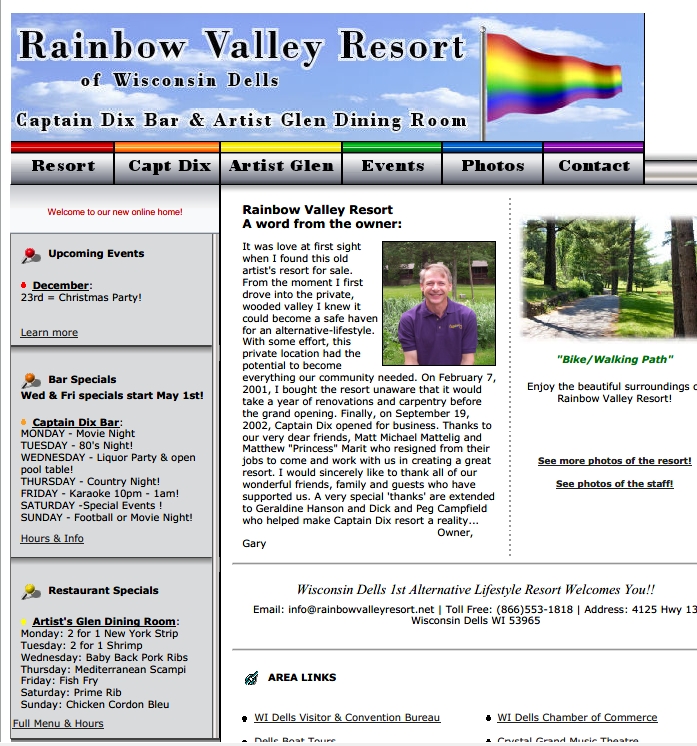 The Dells is home to Rainbow Valley Resort www.rainbowvalleyresort.net (formerly Captain Dix Resort) one of the few gay resorts in the Midwest. The resort is a few miles north of the Dells but has the only gay bar and restaurant in the Dells area (you don't have to be a resort guest to eat or drink).