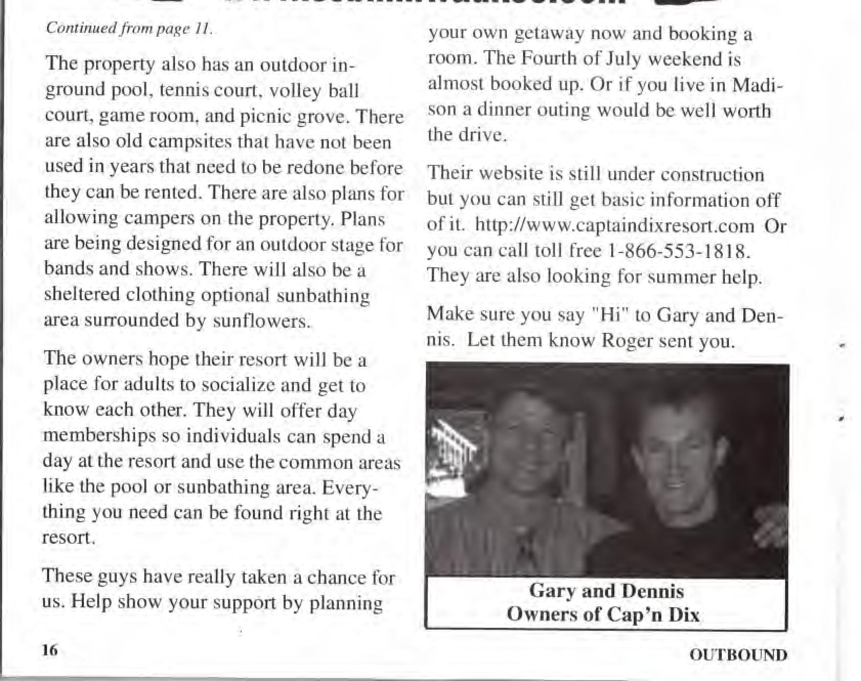 For several years, it was a popular place for the more adventerous gay man from Madison, Milwaukee and around the state. Attractions included nude sunbathing (in a designated area), but also rumors aplenty of 'sex in the woods' type scenes-- although this was not officially sanctioned. For those not spending the day at the resort/ campground, day-passes were available to use the pool and sunbathing areas, and the bar and restaurant welcomed the general public.