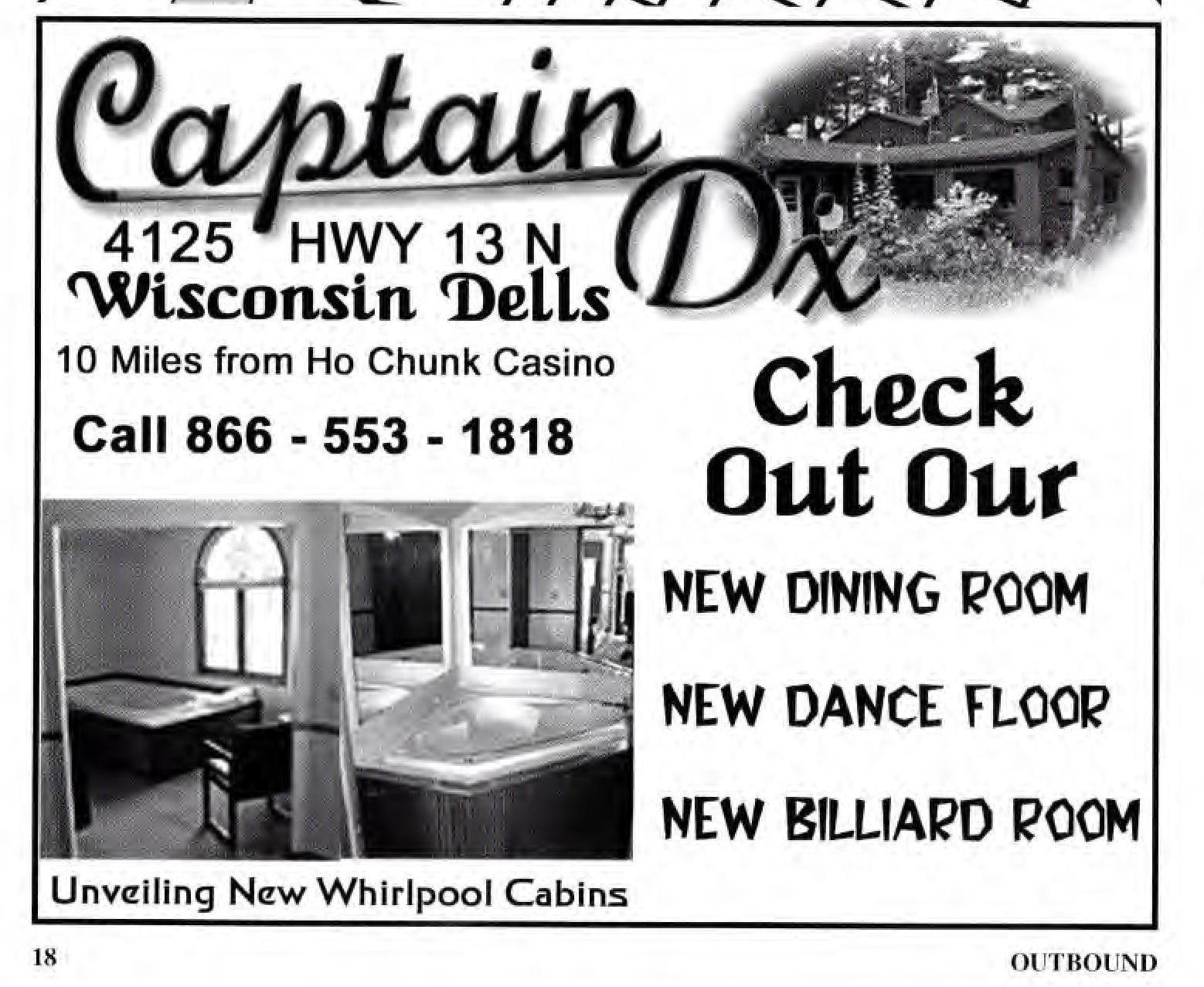 This Wisconsin Dells resort and bar opened in March 2003 and closed in 2016. While it was offically called the 'Rainbow Valley Resort', with the bar being dubbed 'Captain Dix' and the restraurant 'Artist Glen Restaurant', everyone called the entire complex simply 'Captain Dix'. (Even their web site was registered with the domain name "captaindexresort.com).