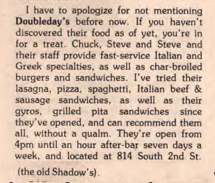 Doubledays was yet another attempt to bring an LGBT restaurant into this space. But it was apparently extremely short-lived. Doubledays is first listed in the Bar Guide of 'In Step' magazine in the November 9-22, 1989 issue. It is then mentioned in the February 1990 issue as follows: "Chuck, Steve and Steve and their staff provide fast-service Italian and Greek specialties, as well as char-broiled burgers and sandwiches. I've tried their lasagna, pizza, spaghetti, Italian beef & sausage sandwiches, as well as their gyros, grilled pita sandwiches since they've opened, and can recommend them all without a qualm.". The only advertisement we have located is in the April 1990 issue of 'In Step'-- and that issue (vol. 7-07) is also the last time it is listed in the magazine's Bar Guide. We have not located any other advertisements or mentions of the business. This was one of several restaurants/bars to operate in this same building in the 1970s to 1990s. One has to wonder if the location was jinxed, as of the 8 businesses, half closed within a year of opening: