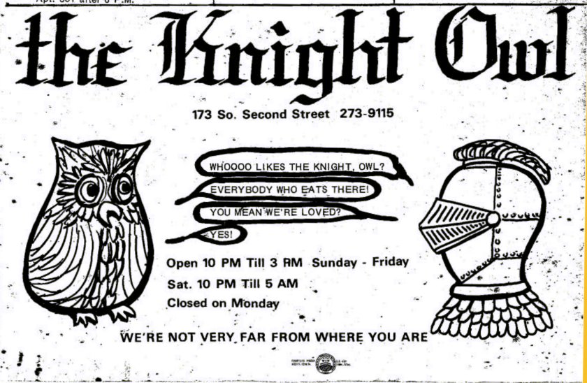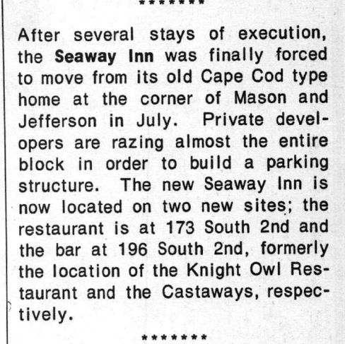 The Knight Owl Restaurant apparently operated briefly as a gay restaurant. They advertised in the new publication GPU News starting with its first issue in October 1971. That first ad reads: "Whoooo likes the Knight, Owl? / Everybody who eats there!/ You mean we're loved? / Yes!. The Knight Owl held at least one event in cooperation with the Castaways South bar across the street. Both businesses advertised in November 1971 a "Food and Flick" for November 8, 1971 with Buffet Dinner and the movie "Bye, Bye, Birdie", in cooperation with the other. In the December 1971 issue of GPU News, their ad read "Ask about our special Christmas Food & Flick" for December 19, and offered holiday greetings as: "Tom & Ron wish you a Merry Christmas / A Happy New Year". This is our best clue as to who may have owned and operated the business. After having half-page ads in the October, November, and December 1971 issues of GPU News, their last ad was in the January 1972 issue. We know nothing of its demise. The building was listed as "city owned" when the restaurant portion of the Seaway Inn moved into this space in July 1972. It's unclear what the new business was named; we believe it was named simply The Seaway Restaurant. (The old Seaway Inn on Jefferson Street and surrounding businesses were slated for demolition by the city. The bar portion of the Seaway Inn relocated across the street from here, first as 'The New Seaway' but quickly renamed as Jamie's.) More information about this business is welcomed from anyone who can contribute it. |