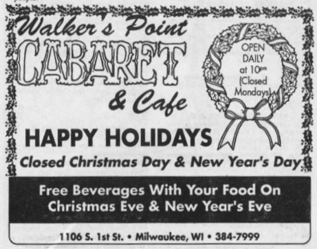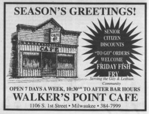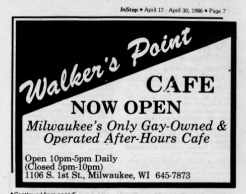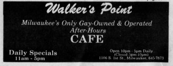 For some years, the Walker's Point Cafe was extremely popular after bar time, when many people, slightly tipsy, would converge and take in the atmosphere. It was opened by Michael Roberts (aka "Miss M.") where the Ski Glow Cafe had previously been for about 14 years. Miss M. closed the Cafe in May 1987, but it reopened in mid-June under new management, Roberto and Kimann, who pledged 24-hour service "no ifs, ands, or buts". The business briefly (in 1991) advertised it as "Walkers Point Cabaret.. and Cafe". George Kreuzer bought the business in September 1992, and owned and operated it until he closed it June 26th, 1998 (he moved to Portland Oregon shortly after). Historian Michail Takach wrote the following about the Cafe's final months: