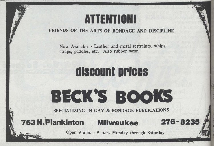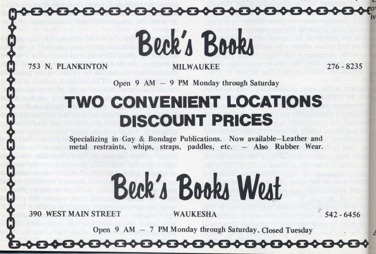 Beck's Books and Beck's Books West advertised "Specializing in Gay & Bondage publications. Now available- Leather and metal restraints, whips, straps, paddles, etc. Also Rubber Wear". Any further information about this businesses is welcome. |