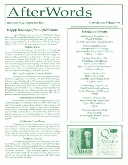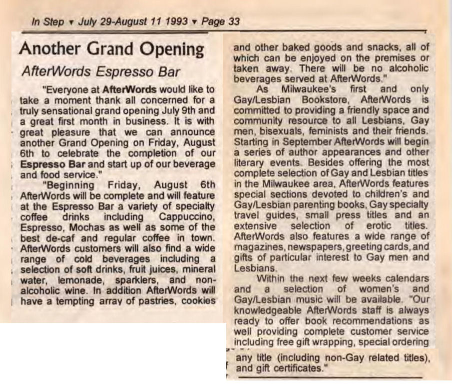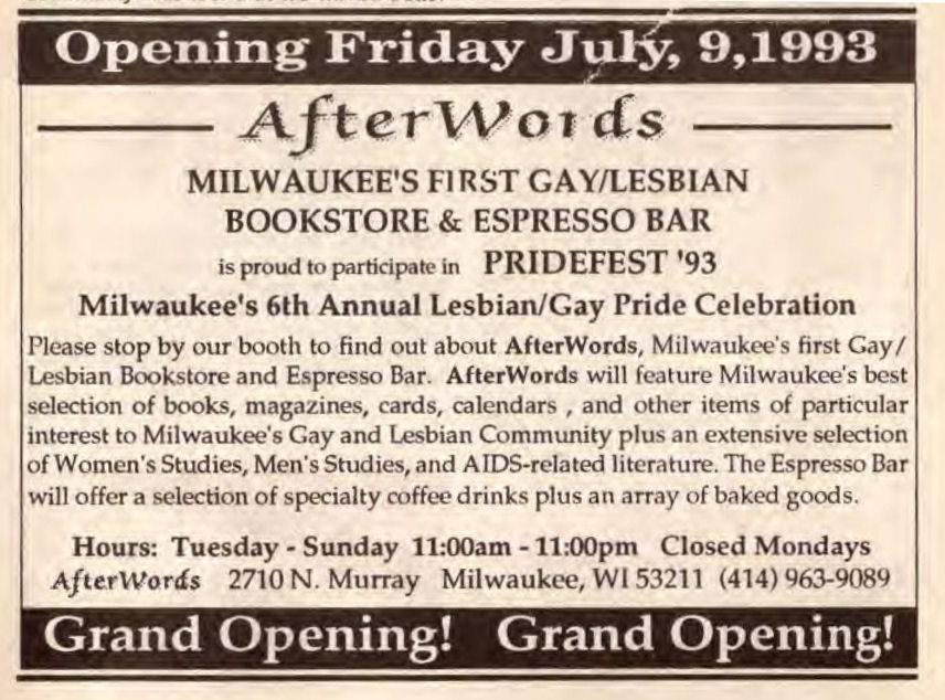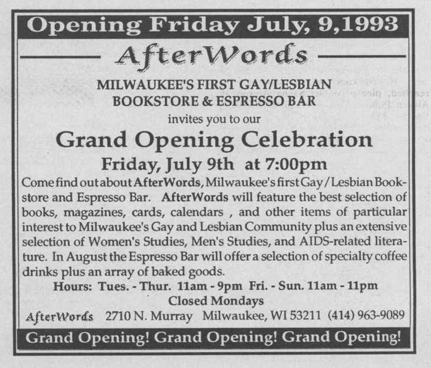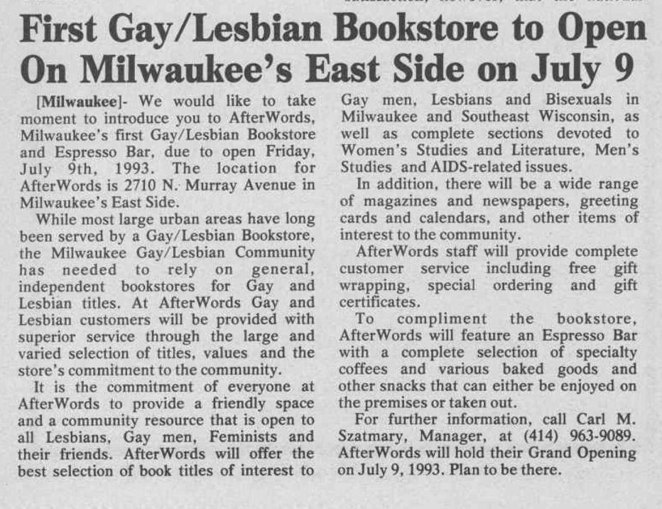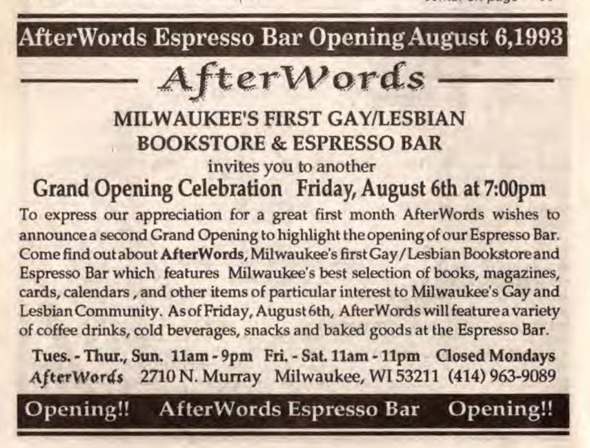 Outwords Books, Gifts & Coffee was opened on July 9, 1993 by Carl M. Szatmary. It was a natural for Szatmary, who had been writing book reviews for both In Step magazine and Wisconsin Light newspaper for years. Originally named "AfterWords Bookstore & Espresso Bar", it was located just north of Park Place on N. Murray, on Milwaukee's fashionable East Side. Just weeks after the store opened, another Grand Opening was held for its Cafe business, off to one side of the store. From the outset, the business hosted such events as author talks and readings, and regular book club sessions. In addition to frequent advertising in local LGBT periodicals, they also published Best Books lists each month, around the holidays and at year-end, and even printed a semi-regular newsletter for patrons. The business was forced to change its name to "OutWords Books, Gifts & Coffee" in 2001 due to a trademark issue with another "Afterwords" bookstore in Washington D.C. The business continued to thrive however, and continues to operate in 2023. |