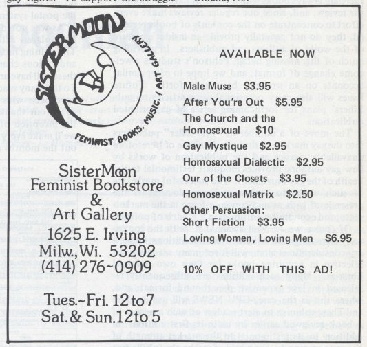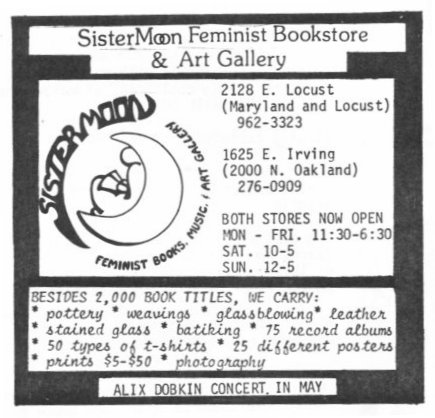 Sister Moon Feminist Bookstore & Art Gallery in 1977 had one store, at 1625 E. Irving, later advertising (approx. 1978) listed a second location at 2128 E. Locust in Milwaukee. At that time, their ad indicated that, "Besides 2,000 book titles, we carry: pottery, weavings, glassblowing, leahter, stained glass, batiking, record albums, t-shirts, posters, prints, photography". Any further information about this businesses is welcome. |