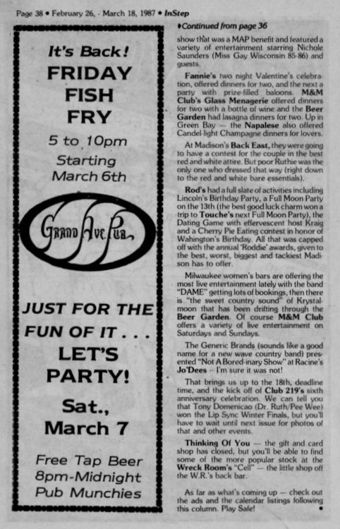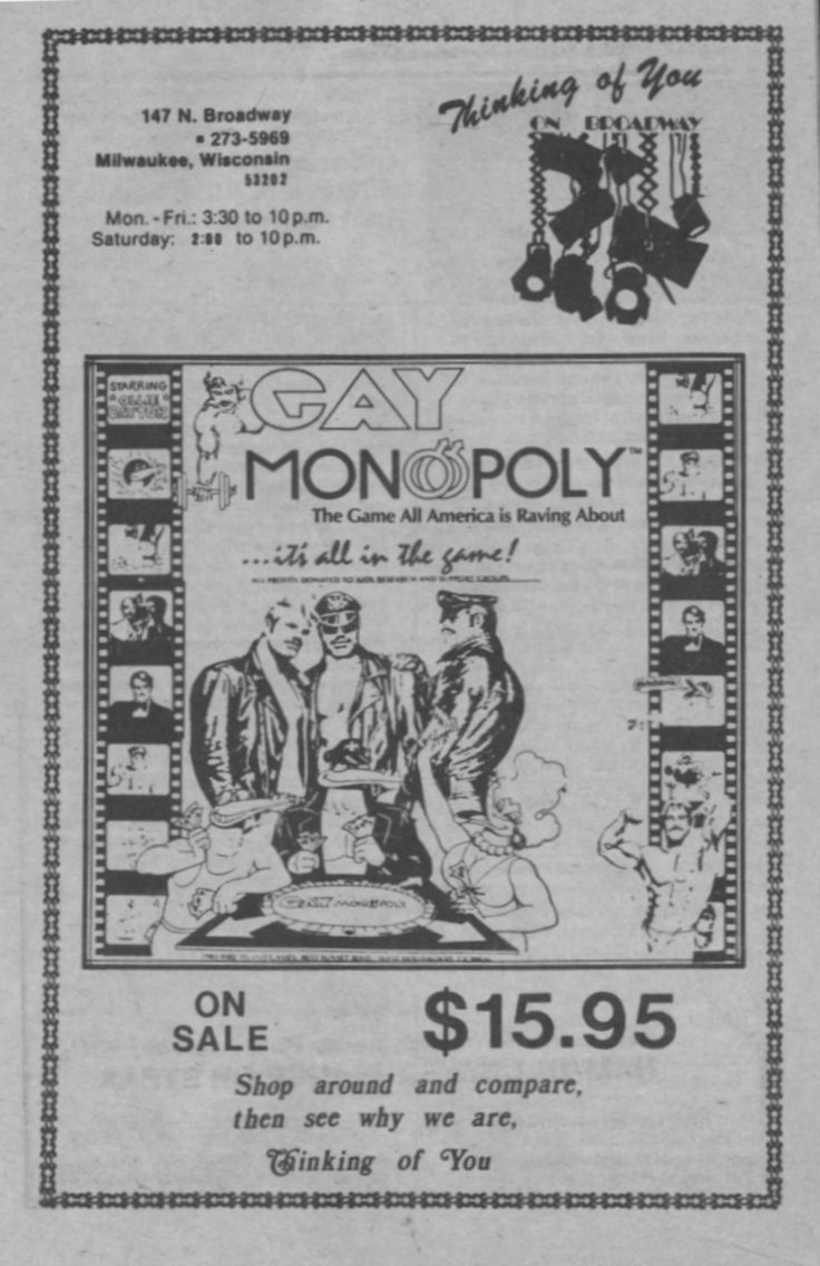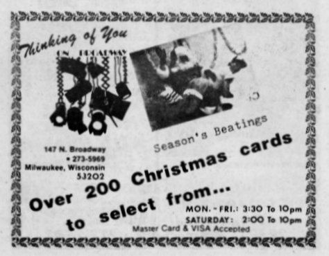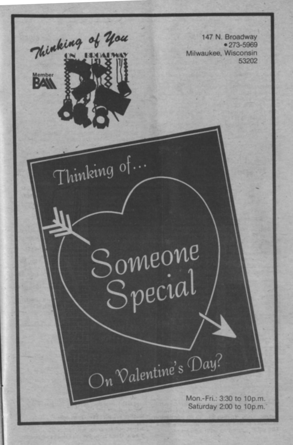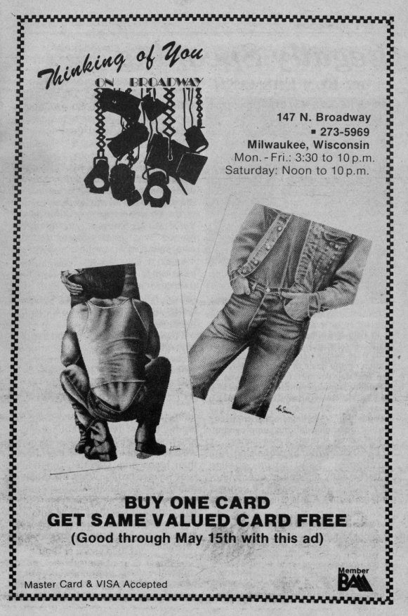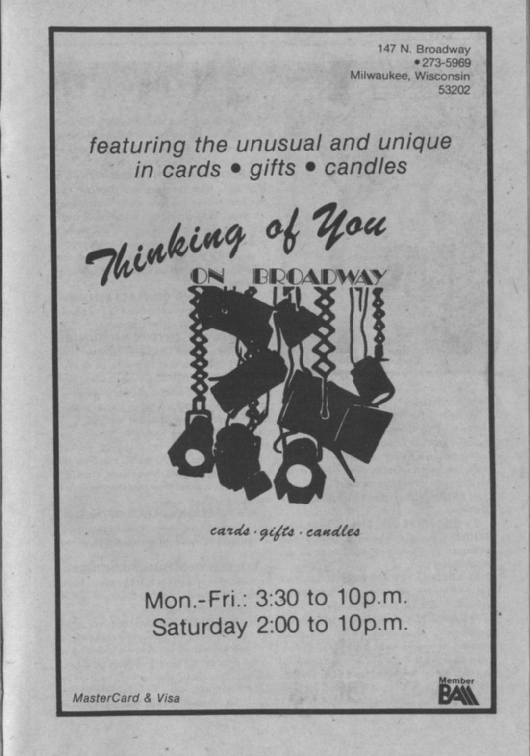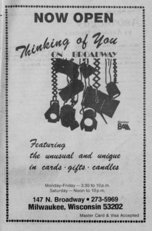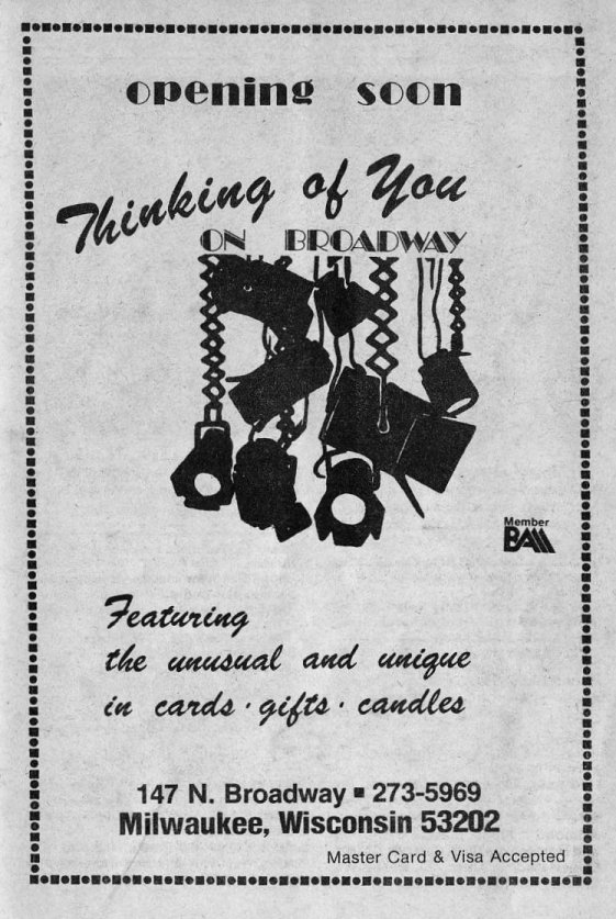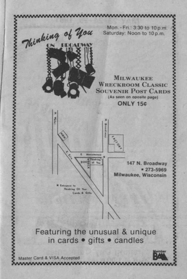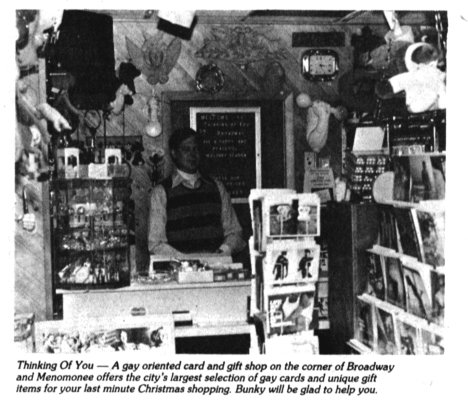 Thinking of You, On Broadway occupied the building just north of the Wreck Room bar. The corner presence with large windows featured miscellaneous gifts (candles, cards, etc.) After the store closed, much of the merchandise was sold in the Wreck Room Pub store, but it's unknown whether it had had the same owner as the bar. More information about this business is welcomed from anyone who can contribute it.