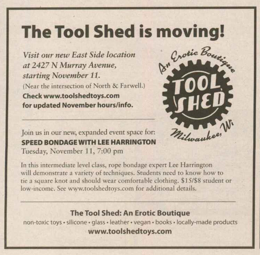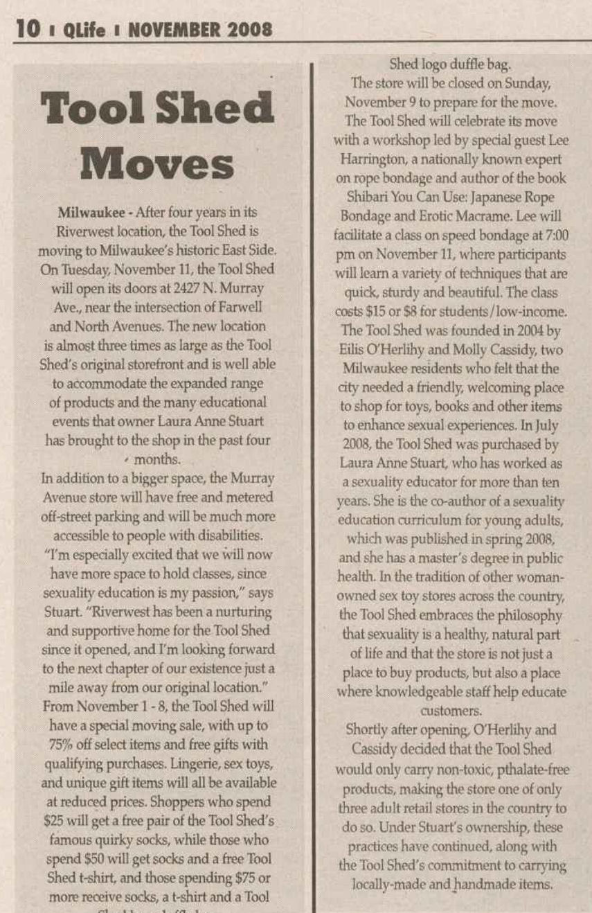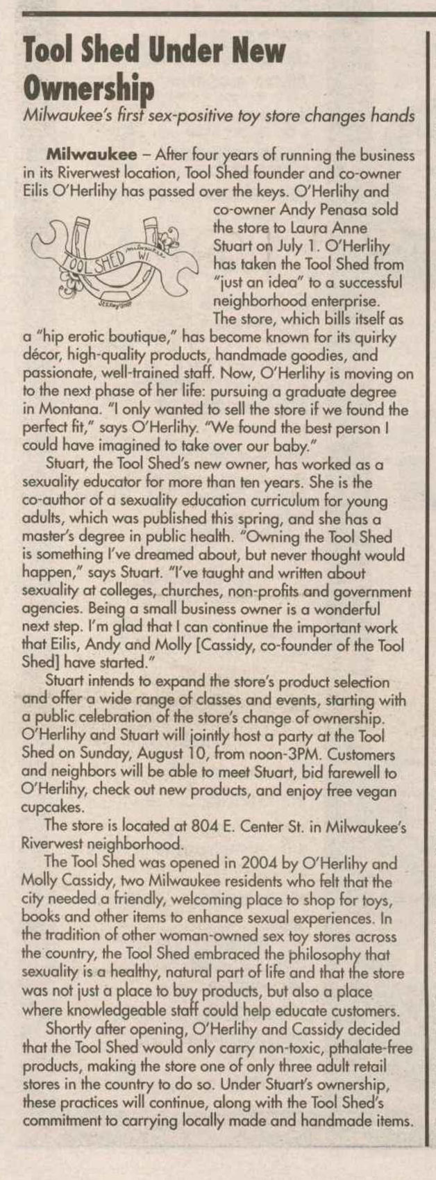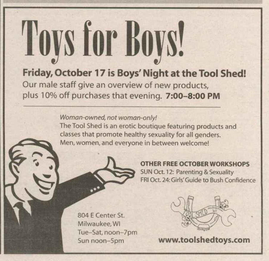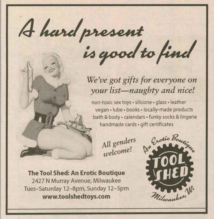The store's website in early 2023 describes the history of the store: During the fall of 2003, an idea was born... How's about opening a sex-positive sex toy store in Milwaukee with a comfortable atmosphere? The gals that opened the Tool Shed felt that their city was in desperate need of a place that not only epitomized their beliefs about what a sex-positive, gender-positive, healthy and inviting sex toy store should be, but they also really wanted to educate and empower people by breaking taboos around talking honestly about sex and sexuality. In 2004, after over a year of preparation, the Tool Shed's doors opened in Milwaukee's Riverwest neighborhood. In July of 2008, the reins of the Tool Shed were passed to Laura Anne Haave. Laura has been a sexuality educator, sexual violence survivor advocate, and LGBTQA activist for more than twenty years. She has a master’s degree in health behavior and health education. In addition to her work at the Tool Shed, Laura is a teacher, trainer, and curriculum developer for Our Whole Lives (OWL), a comprehensive sexuality education curricula. She also authored a weekly a sex advice column called "Sexpress" for Milwaukee’s local free weekly paper, the Shepherd Express, for five years. Since 2008, the Tool Shed has gone through a lot of exciting changes. We moved from our original storefront in Riverwest to a larger, wheelchair accessible location on Milwaukee's East Side. We have grown our product selection to over 3,500 different items sourced from over one hundred unique manufacturers and suppliers. Our extensive book selection contains over 450 titles. Our ongoing events series has offered classes and workshops by some of today's leading sexuality experts, including Jiz Lee, Joan Price, Reid Mihalko, Twanna Hines, Robin Mandell, Buck Angel, Midori, Lee Harrington, Madison Young, Tristan Taormino, Dan Savage, Sinclair Sexsmith, Ducky Doolittle, Dr. Ruth Neustifter, Helen Boyd, and others. And in April 2016, we hosted Milwaukee SHARE, a week-long series of community events focused on adult sex education and healthy relationships, including a day-long special conference for health care providers. The Tool Shed has been voted Milwaukee's Best Adult Retail Store from 2010-2018, and was named the Best Adult Boutique in the nation by AVN in 2014. |