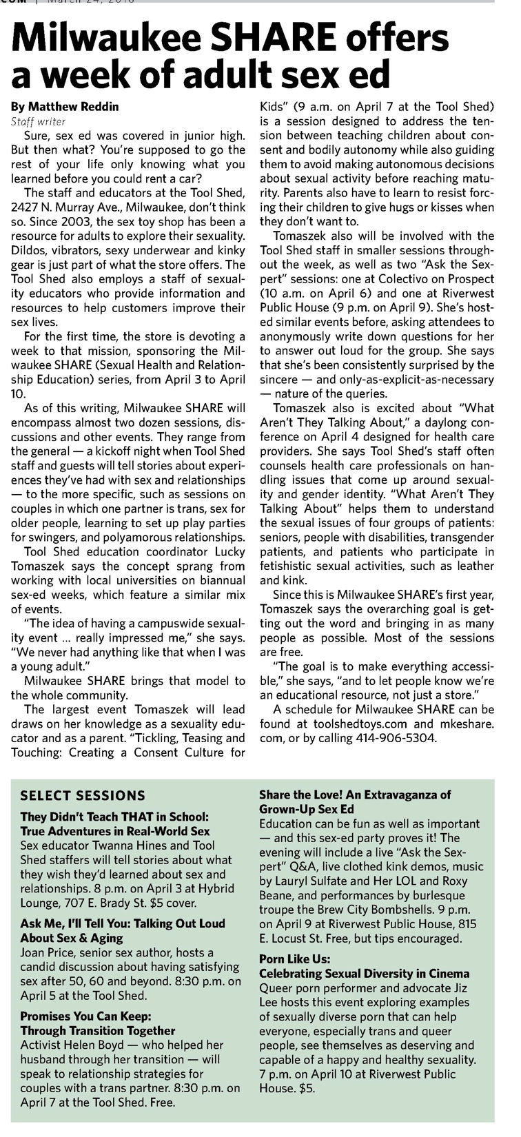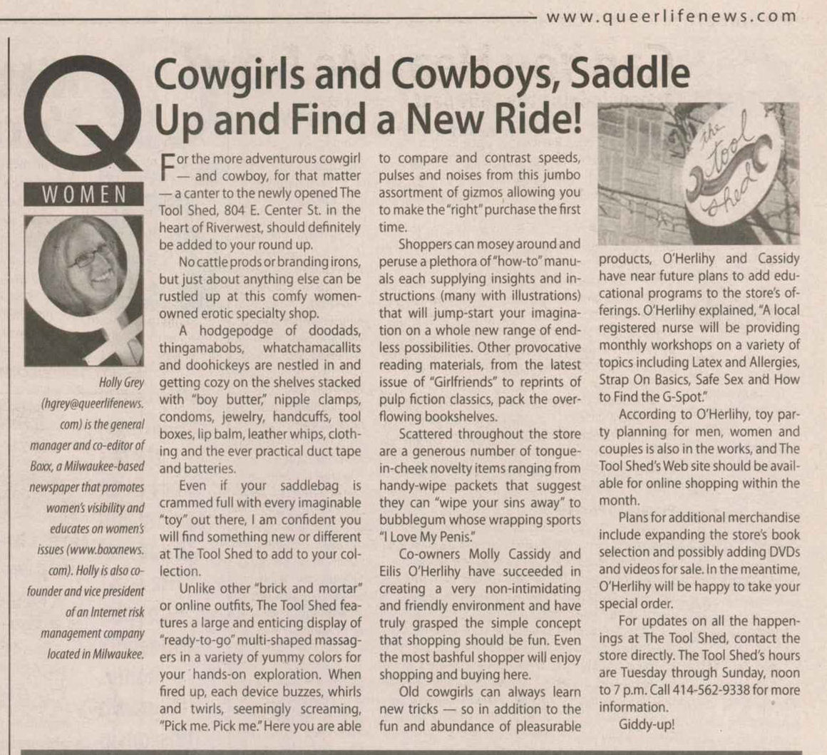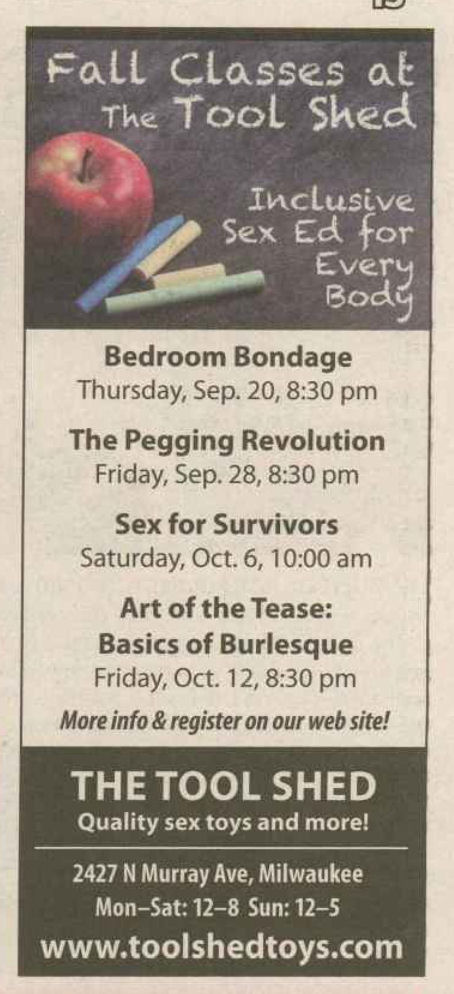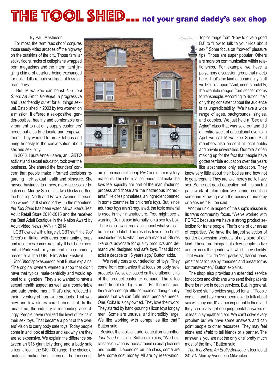 The store's website in early 2023 describes the history of the store: During the fall of 2003, an idea was born... How's about opening a sex-positive sex toy store in Milwaukee with a comfortable atmosphere? The gals that opened the Tool Shed felt that their city was in desperate need of a place that not only epitomized their beliefs about what a sex-positive, gender-positive, healthy and inviting sex toy store should be, but they also really wanted to educate and empower people by breaking taboos around talking honestly about sex and sexuality. In 2004, after over a year of preparation, the Tool Shed's doors opened in Milwaukee's Riverwest neighborhood. In July of 2008, the reins of the Tool Shed were passed to Laura Anne Haave. Laura has been a sexuality educator, sexual violence survivor advocate, and LGBTQA activist for more than twenty years. She has a master’s degree in health behavior and health education. In addition to her work at the Tool Shed, Laura is a teacher, trainer, and curriculum developer for Our Whole Lives (OWL), a comprehensive sexuality education curricula. She also authored a weekly a sex advice column called "Sexpress" for Milwaukee’s local free weekly paper, the Shepherd Express, for five years. Since 2008, the Tool Shed has gone through a lot of exciting changes. We moved from our original storefront in Riverwest to a larger, wheelchair accessible location on Milwaukee's East Side. We have grown our product selection to over 3,500 different items sourced from over one hundred unique manufacturers and suppliers. Our extensive book selection contains over 450 titles. Our ongoing events series has offered classes and workshops by some of today's leading sexuality experts, including Jiz Lee, Joan Price, Reid Mihalko, Twanna Hines, Robin Mandell, Buck Angel, Midori, Lee Harrington, Madison Young, Tristan Taormino, Dan Savage, Sinclair Sexsmith, Ducky Doolittle, Dr. Ruth Neustifter, Helen Boyd, and others. And in April 2016, we hosted Milwaukee SHARE, a week-long series of community events focused on adult sex education and healthy relationships, including a day-long special conference for health care providers. The Tool Shed has been voted Milwaukee's Best Adult Retail Store from 2010-2018, and was named the Best Adult Boutique in the nation by AVN in 2014. |