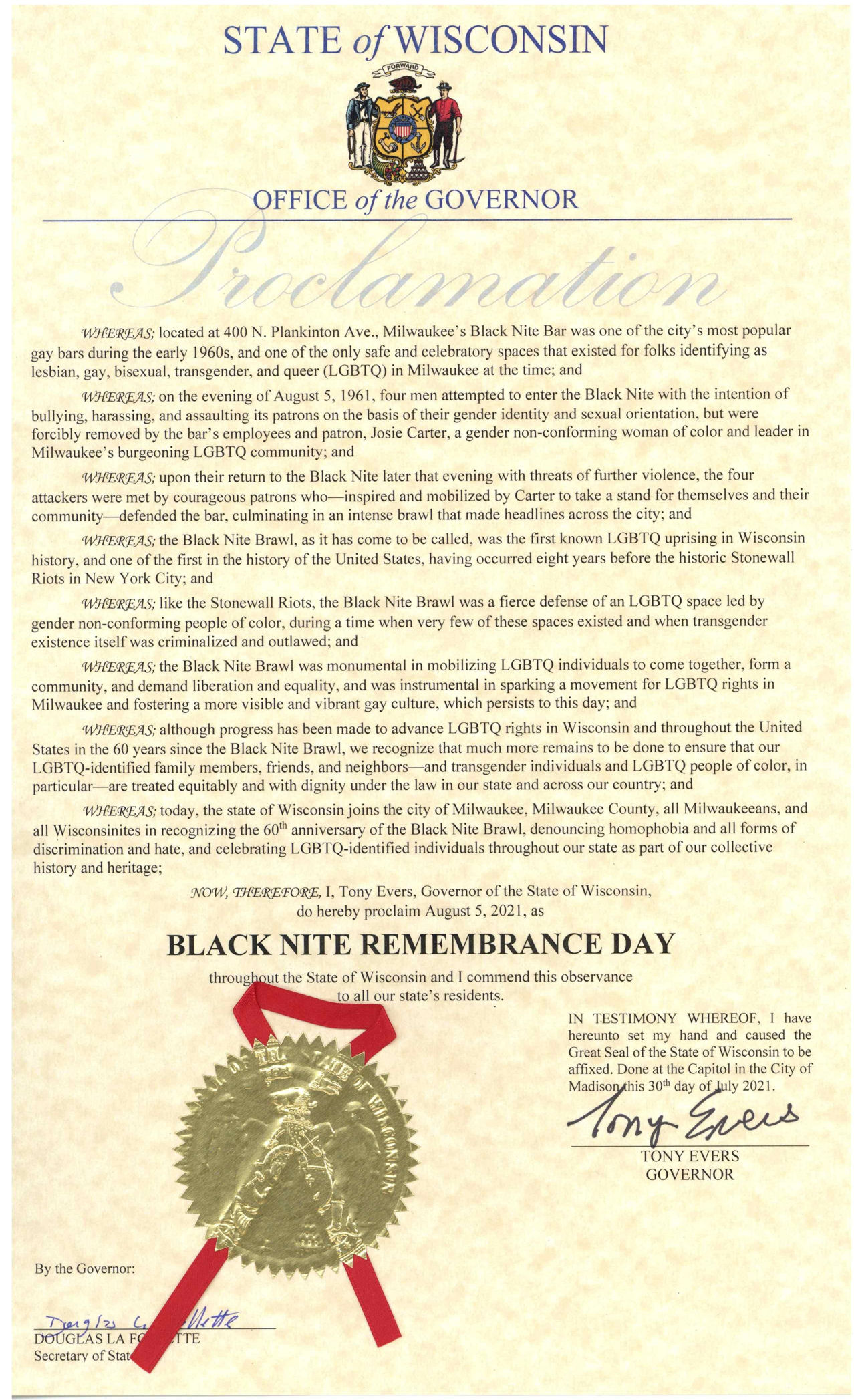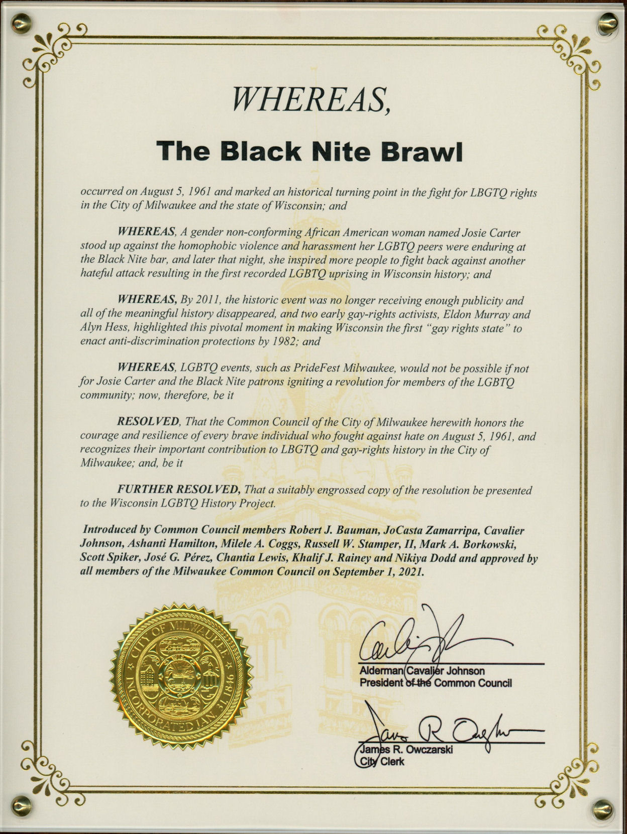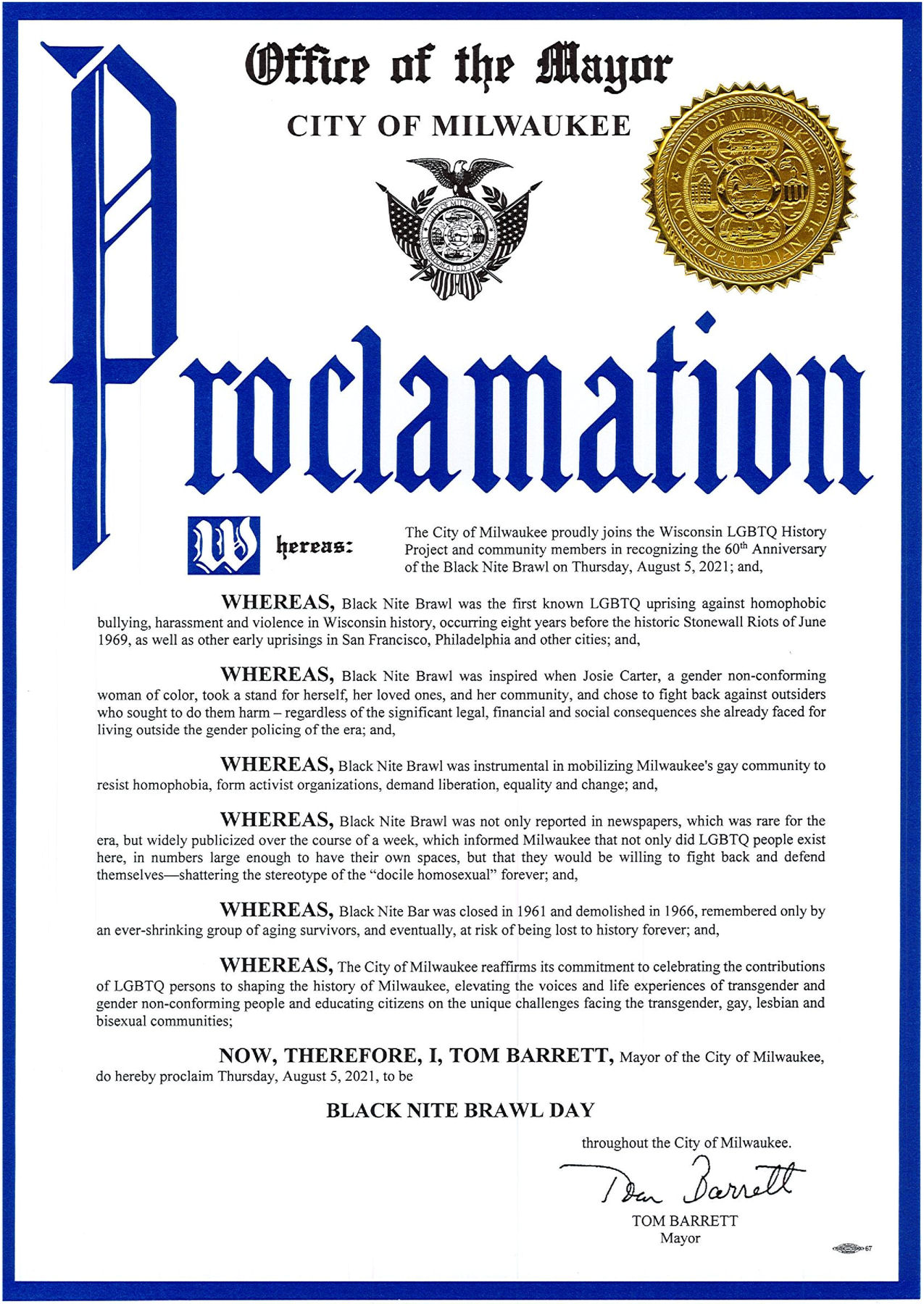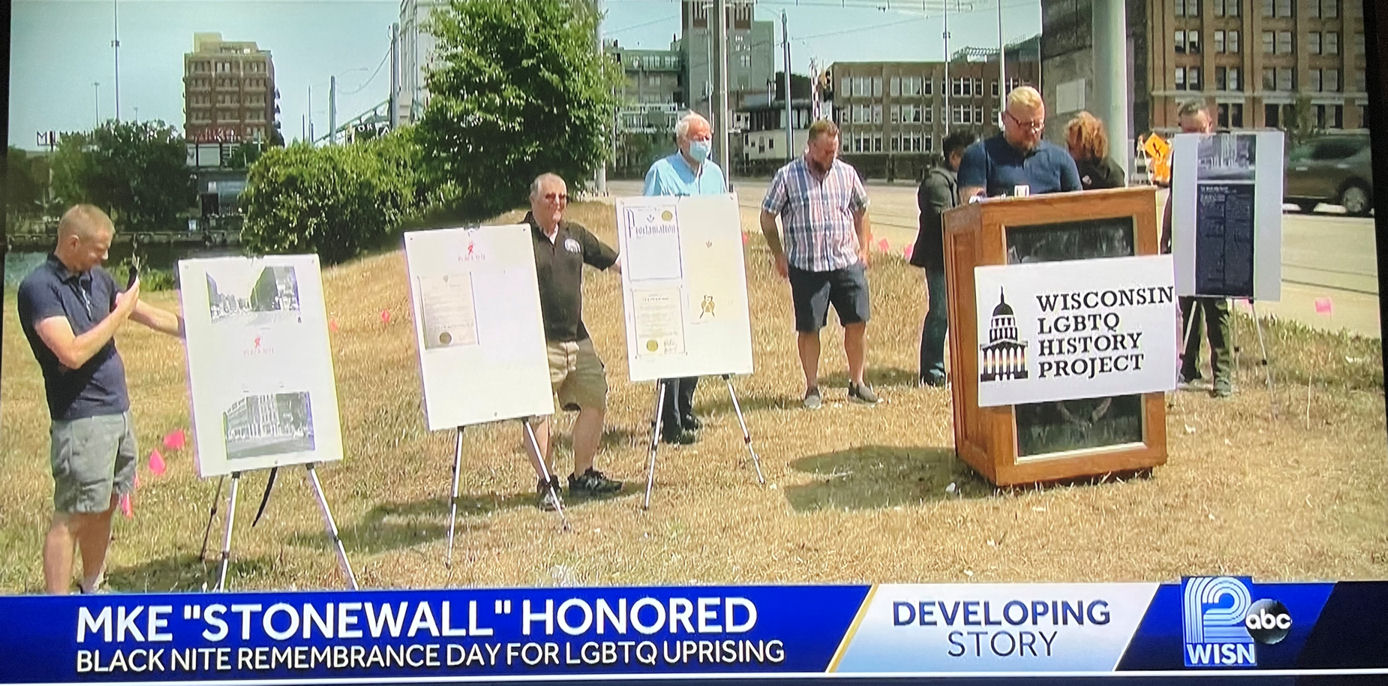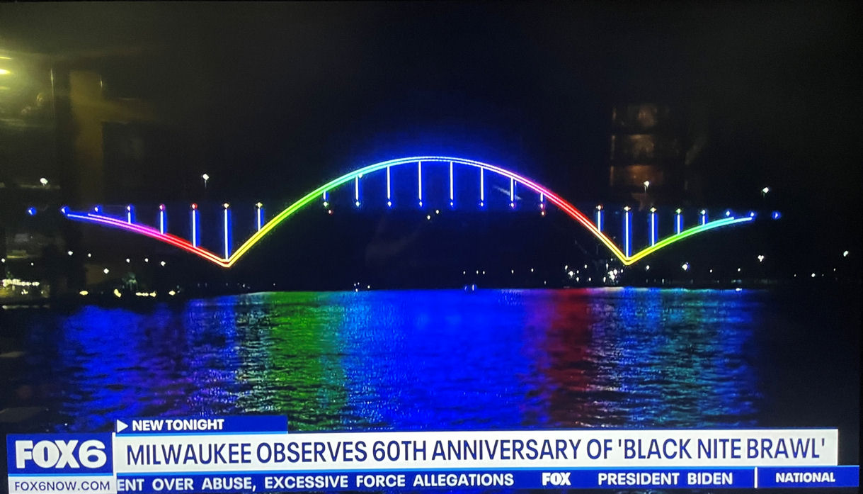 In 2021, the Curator of the Wisconsin LGBTQ History Project (Michail Takach) had the idea of commemorating the Brawl by holding a press conference on the 60th anniversary of the event. The idea was to increase community knowledge of the event and what it meant for the future of the LGBTQ rights movement in Wisconsin. The anniversary was ultimately recognized in several ways: Takach and the Founder of the Wisconsin LGBTQ History Project, Don Schwamb, worked with Bjorn Nasett and others in the community to pull together the anniversary commemoration event. Part of the impetus was that, in the wake of the COVID-19 pandemic of 2020 and 2021, there had been no Milwaukee Pride celebration in either 2020 or 2021, so this was seen as a way to bolster LGBT Pride. The first problem was funding: there would be costs associated with having the Hoan Bridge lit up. A "GoFundMe" campaign was set up to raise the money needed to light the bridge. Takach had previously written a book "LGBT Milwaukee" and was already writing articles for local web sites as well as Madison's LGBT magazine, 'Our Lives'. He proceeded to write several articles for the media to remind the community of what the Black Nite bar was and its significance. (The story had almost been lost to history and had only been rediscovered from oral interviews done in 2011 and since.) Then it was time to approach the political leaders of the time. Luckily, the anniversary was seen by politicians as an opportunity to recognize what the Brawl had meant to Wisconsin's early LGBTQ movement. With Proclamations and Resolutions in hand, a Press Conference was organized for the date. Late on the morning of Thursday, August 5, 2021, Schwamb, Joshua Sukkert, and Takach arrived on the site and began setting up a podium and display boards for the presentation and press conference. Pink surveyor flags were placed along the approximate outline of where the building housing the Black Nite Bar had stood 60 years before. (The site had been a vacant lot for the past 55 years.) Speakers at the press conference included: Milwaukee Mayor Tom Barrett; Milwaukee Common Council Alderwoman JoCasta Zamarripa; a representative from the County Board; Dr. Brice Smith, coordinator of the Wisconsin Transgender Oral History Project; Elle Halo, transgender rights activist; Don Schwamb, founder of the Wisconsin LGBTQ History Project; and Michail Takach, the Project's curator. The event was covered by camera crews from WITI-TV6, WISN-TV12, and Spectrum News One. At dusk that evening, the city's Hoan Bridge was illuminated in the colors of the LGBTQ+ Pride Flag and the Transexual Pride flag, alternating every hour until 2 a.m. Historical Context: What was being commemorated? On Saturday night, Aug. 5, 1961, four troublemakers got more trouble than they bargained for at the Black Nite (400 N. Plankinton Ave.,) one of Milwaukee's most popular gay bars of the time. After partying at a Kane Place tavern, four 20-year-old servicemen decided to check out the Black Nite on a dare. Despite being asked several times, they refused to show any identification to the bouncer and wound up being forcibly removed. One of the servicemen would later claim that he was grabbed, punched and hit on the head with a bottle for no reason. But that's not exactly what happened. The servicemen fled the bar, took their injured friend to the County Emergency Hospital and went back to the Kane Place tavern. They rounded up a dozen men and decided to go back Downtown and "clean up the Black Nite." Bar owner Wally Whetham later reported that "this gang came in and started tearing the bar apart, and the bar fought back." Earlier that night, the servicemen had found a nearly empty bar and a 4-1 fight against the bouncer. This time, they found a packed bar of 75 patrons ready and willing to defend their turf by any means necessary. The battle didn't last long, but it was intense: One patron suffered extreme lacerations when he was thrown through a broken window; another patron experienced a brain concussion when he was hit in the head with a barstool. He would remain in critical condition for weeks after the brawl. In the end, over $2,000 in damages were reported, including the bar's entire bottled liquor inventory, an electric organ, a jukebox and all the bar's windows. While Whetham and his patrons cleaned up the carnage, the four servicemen were charged with disorderly conduct. Unfortunately, the notoriously homophobic Judge Christ T. Seraphim later dismissed their charges due to "lack of evidence." View more details about the Black Nite Brawl. View the Black Nite bar web page. |