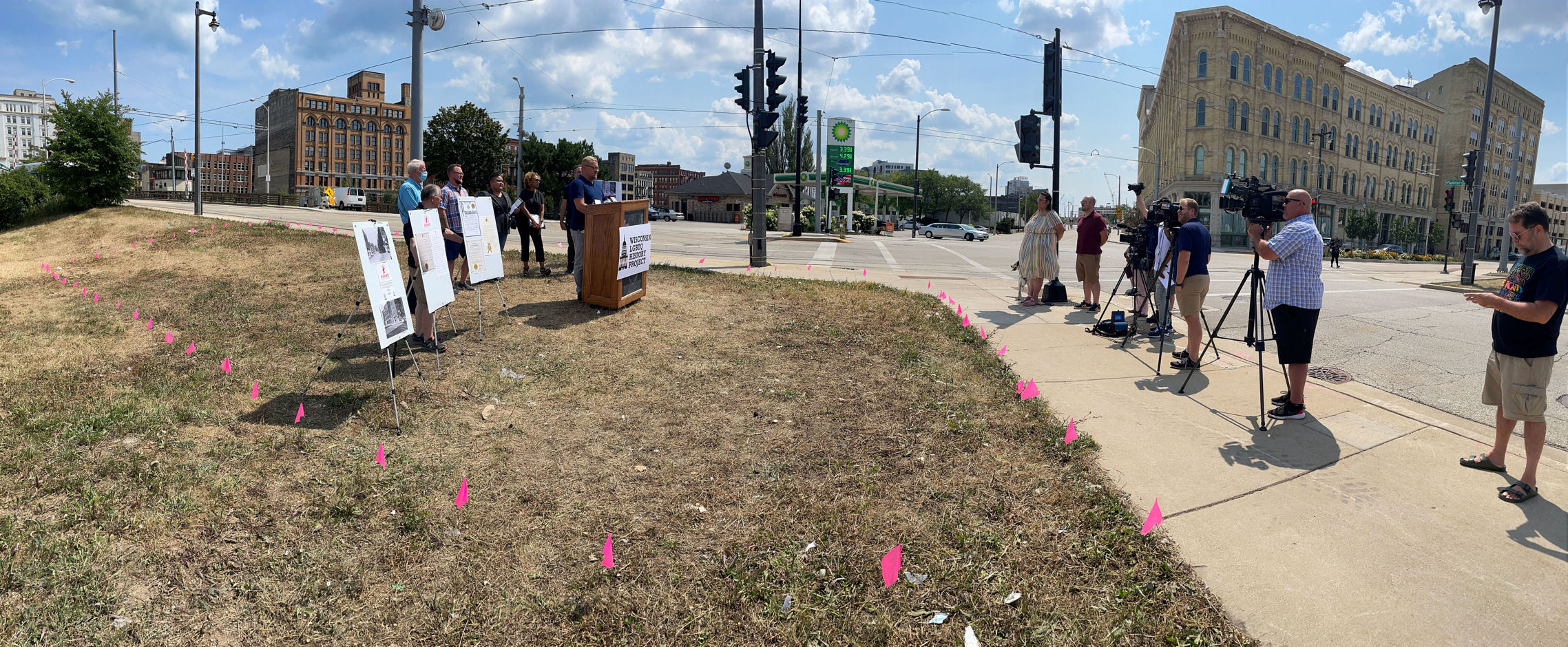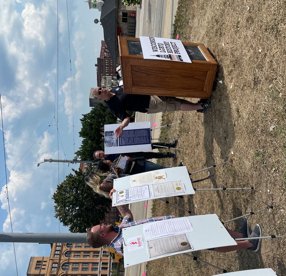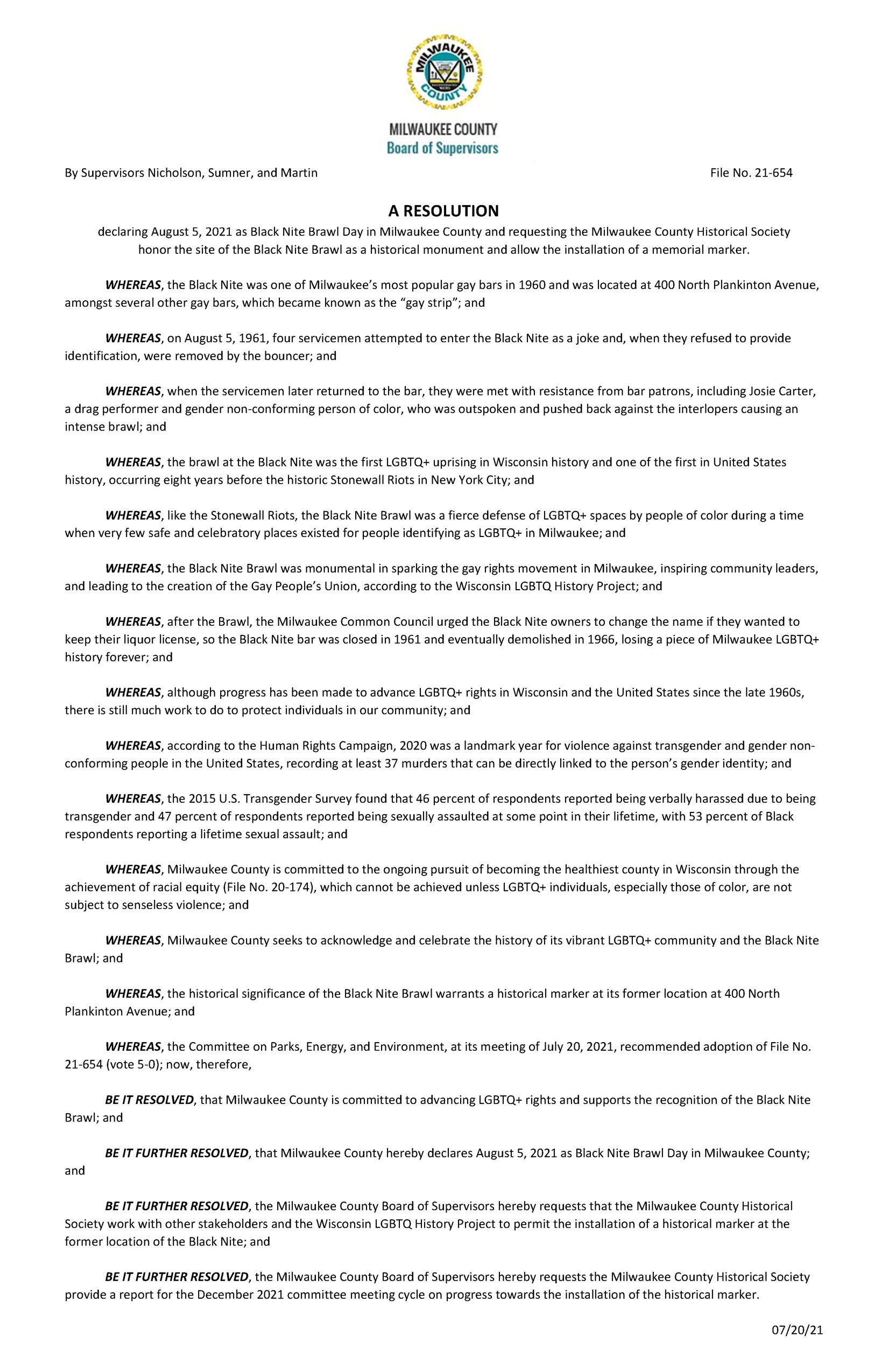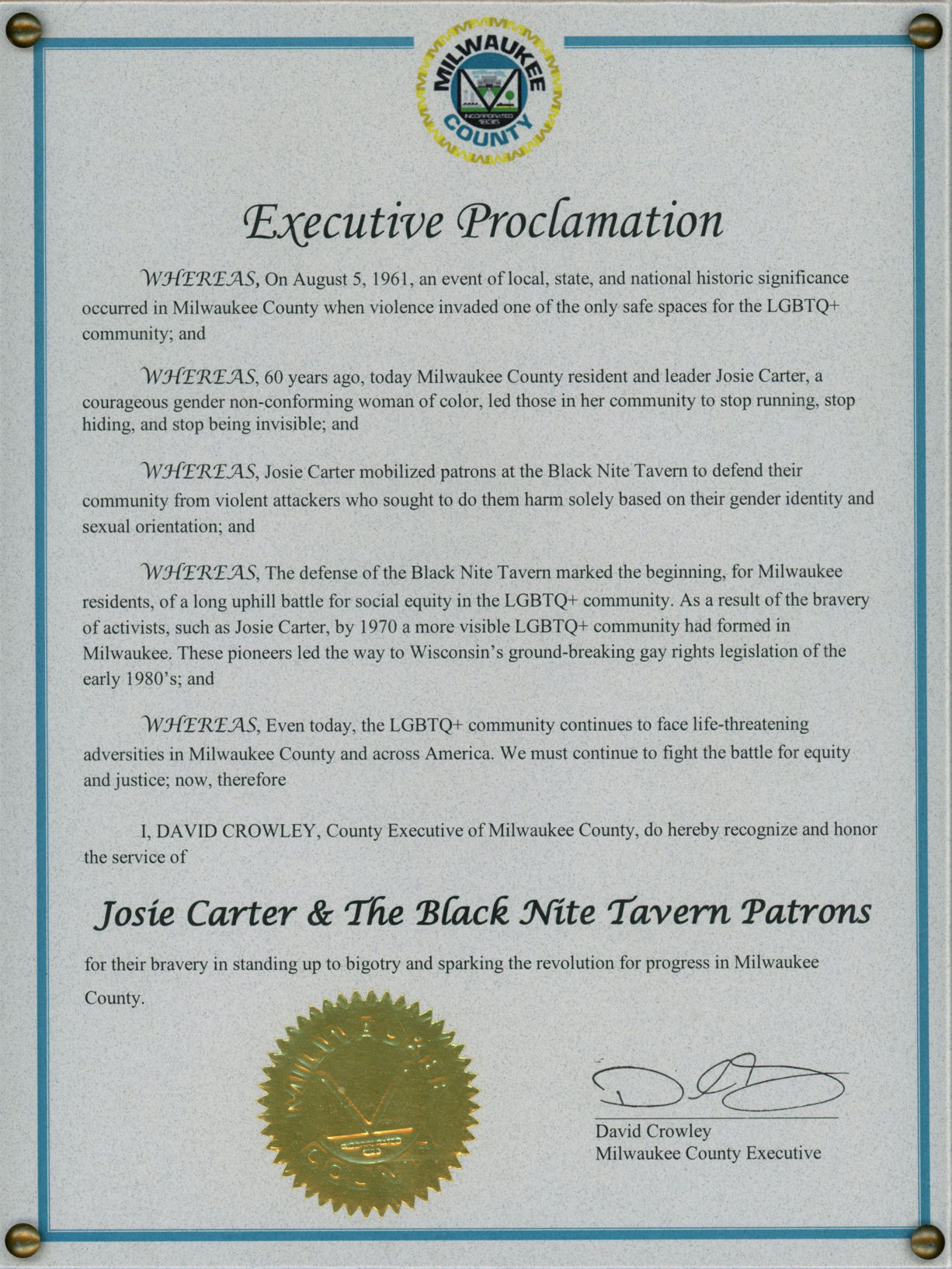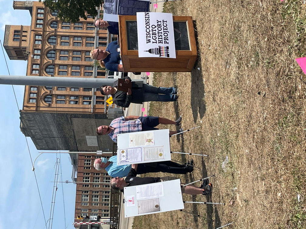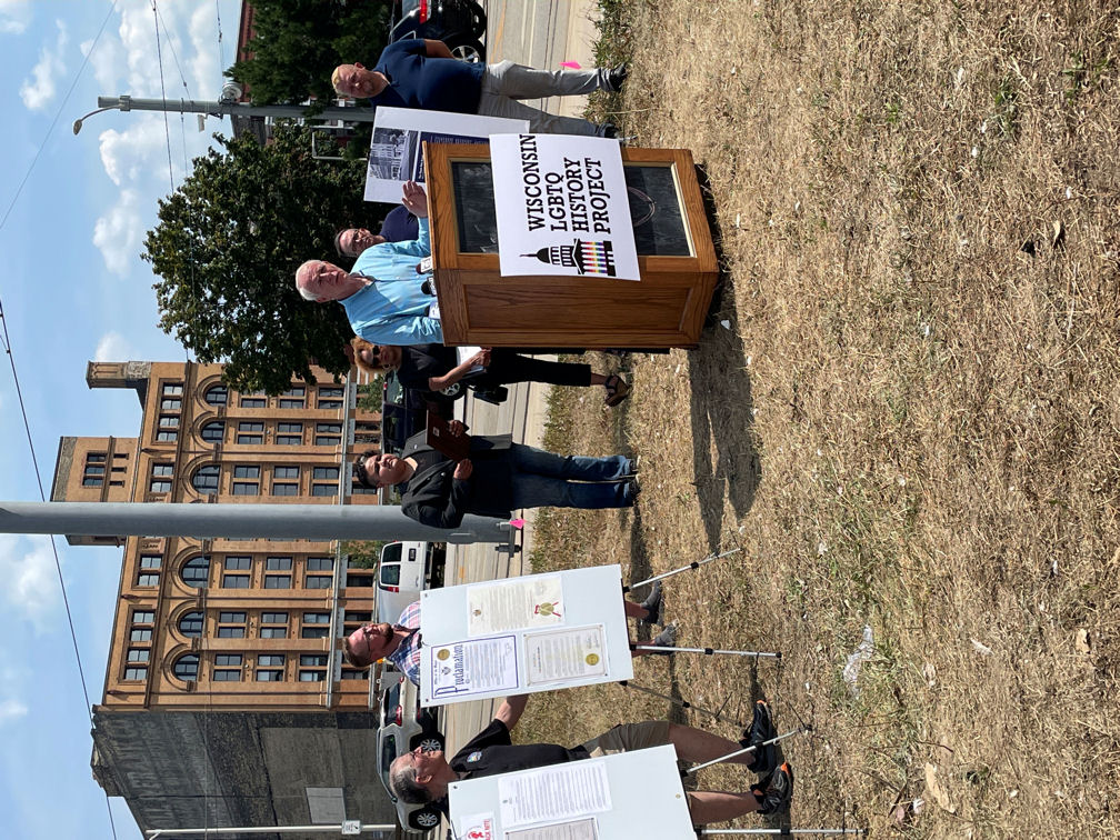 In 2021, the Curator of the Wisconsin LGBTQ History Project (Michail Takach) had the idea of commemorating the Brawl by holding a press conference on the 60th anniversary of the event. The idea was to increase community knowledge of the event and what it meant for the future of the LGBTQ rights movement in Wisconsin. The anniversary was ultimately recognized in several ways: Takach and the Founder of the Wisconsin LGBTQ History Project, Don Schwamb, worked with Bjorn Nasett and others in the community to pull together the anniversary commemoration event. Part of the impetus was that, in the wake of the COVID-19 pandemic of 2020 and 2021, there had been no Milwaukee Pride celebration in either 2020 or 2021, so this was seen as a way to bolster LGBT Pride. The first problem was funding: there would be costs associated with having the Hoan Bridge lit up. A "GoFundMe" campaign was set up to raise the money needed to light the bridge. Takach had previously written a book "LGBT Milwaukee" and was already writing articles for local web sites as well as Madison's LGBT magazine, 'Our Lives'. He proceeded to write several articles for the media to remind the community of what the Black Nite bar was and its significance. (The story had almost been lost to history and had only been rediscovered from oral interviews done in 2011 and since.) Then it was time to approach the political leaders of the time. Luckily, the anniversary was seen by politicians as an opportunity to recognize what the Brawl had meant to Wisconsin's early LGBTQ movement. With Proclamations and Resolutions in hand, a Press Conference was organized for the date. Late on the morning of Thursday, August 5, 2021, Schwamb, Joshua Sukkert, and Takach arrived on the site and began setting up a podium and display boards for the presentation and press conference. Pink surveyor flags were placed along the approximate outline of where the building housing the Black Nite Bar had stood 60 years before. (The site had been a vacant lot for the past 55 years.) Speakers at the press conference included: Milwaukee Mayor Tom Barrett; Milwaukee Common Council Alderwoman JoCasta Zamarripa; a representative from the County Board; Dr. Brice Smith, coordinator of the Wisconsin Transgender Oral History Project; Elle Halo, transgender rights activist; Don Schwamb, founder of the Wisconsin LGBTQ History Project; and Michail Takach, the Project's curator. The event was covered by camera crews from WITI-TV6, WISN-TV12, and Spectrum News One. At dusk that evening, the city's Hoan Bridge was illuminated in the colors of the LGBTQ+ Pride Flag and the Transexual Pride flag, alternating every hour until 2 a.m. Historical Context: What was being commemorated? On Saturday night, Aug. 5, 1961, four troublemakers got more trouble than they bargained for at the Black Nite (400 N. Plankinton Ave.,) one of Milwaukee's most popular gay bars of the time. After partying at a Kane Place tavern, four 20-year-old servicemen decided to check out the Black Nite on a dare. Despite being asked several times, they refused to show any identification to the bouncer and wound up being forcibly removed. One of the servicemen would later claim that he was grabbed, punched and hit on the head with a bottle for no reason. But that's not exactly what happened. The servicemen fled the bar, took their injured friend to the County Emergency Hospital and went back to the Kane Place tavern. They rounded up a dozen men and decided to go back Downtown and "clean up the Black Nite." Bar owner Wally Whetham later reported that "this gang came in and started tearing the bar apart, and the bar fought back." Earlier that night, the servicemen had found a nearly empty bar and a 4-1 fight against the bouncer. This time, they found a packed bar of 75 patrons ready and willing to defend their turf by any means necessary. The battle didn't last long, but it was intense: One patron suffered extreme lacerations when he was thrown through a broken window; another patron experienced a brain concussion when he was hit in the head with a barstool. He would remain in critical condition for weeks after the brawl. In the end, over $2,000 in damages were reported, including the bar's entire bottled liquor inventory, an electric organ, a jukebox and all the bar's windows. While Whetham and his patrons cleaned up the carnage, the four servicemen were charged with disorderly conduct. Unfortunately, the notoriously homophobic Judge Christ T. Seraphim later dismissed their charges due to "lack of evidence." View more details about the Black Nite Brawl. View the Black Nite bar web page. |