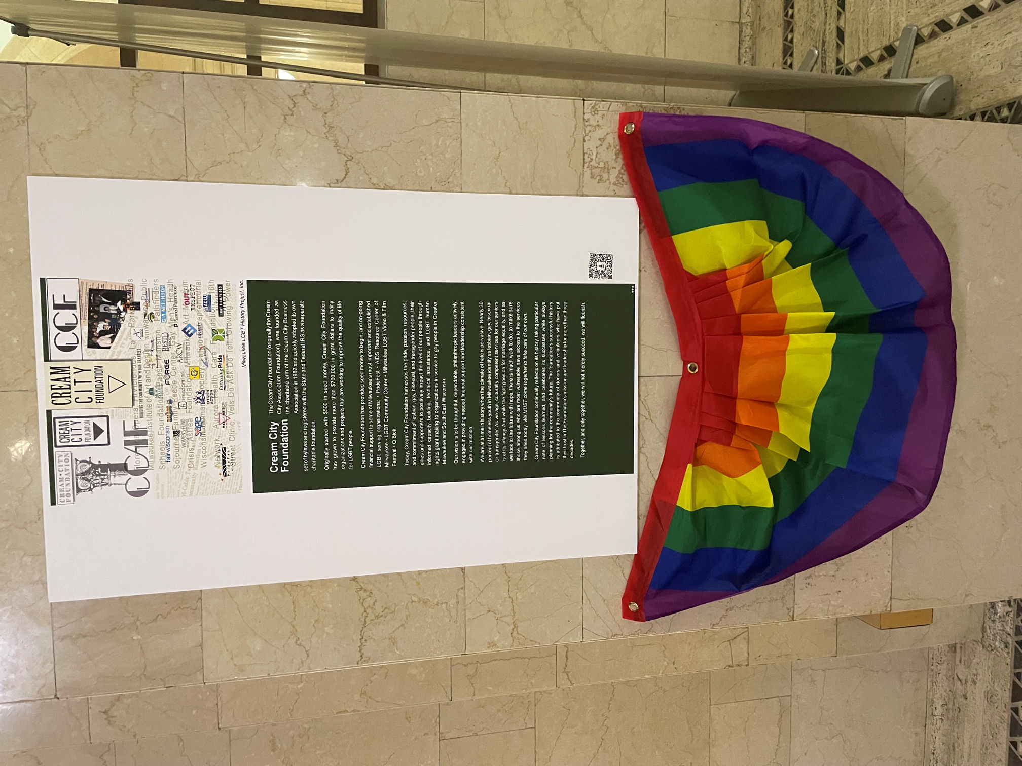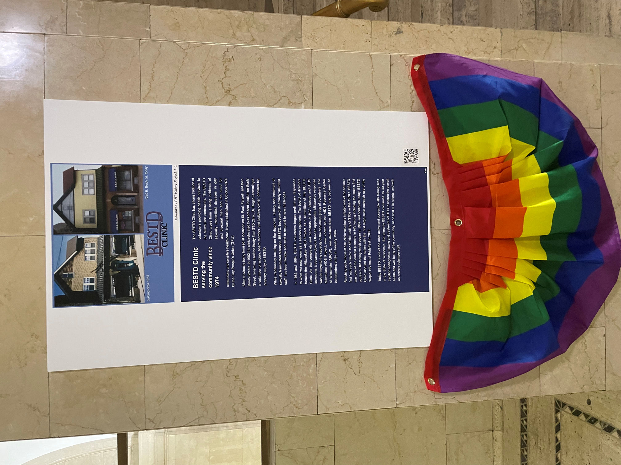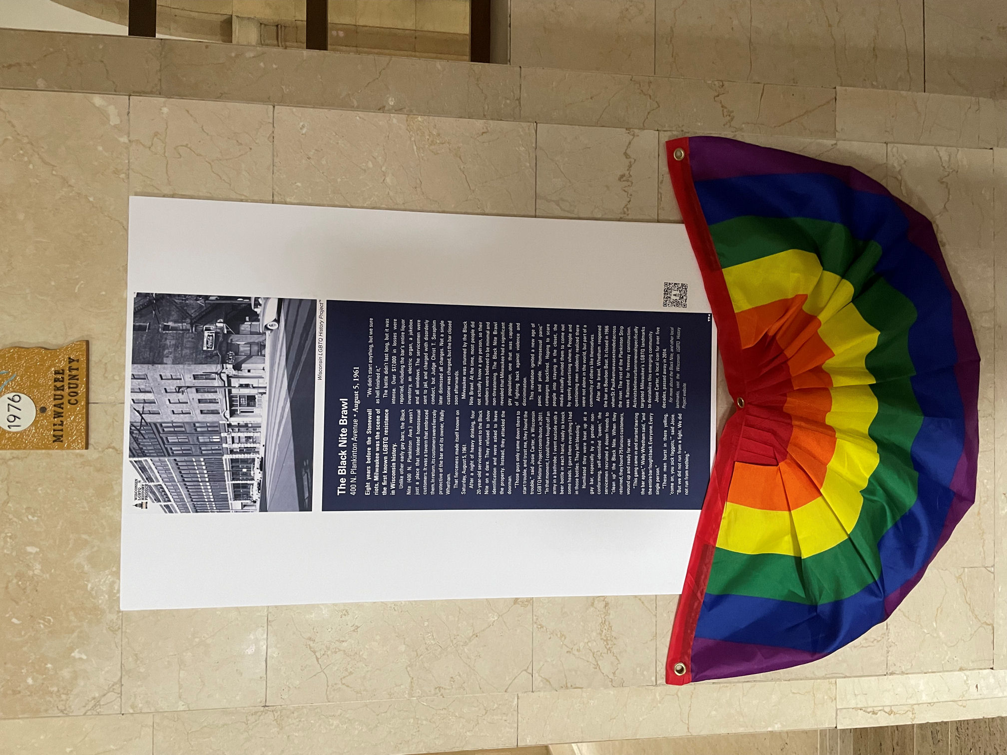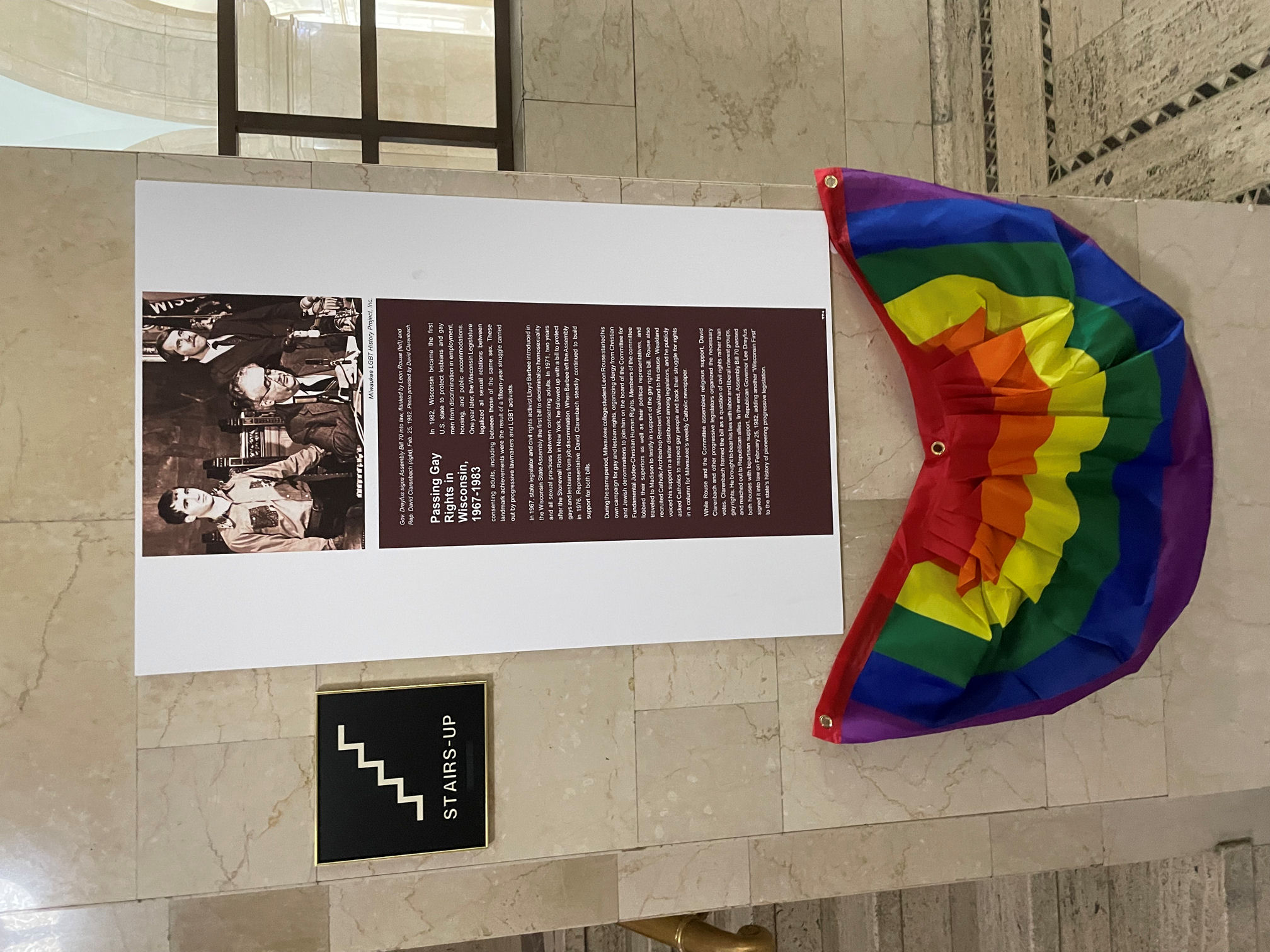 In May 2023, the Wisconsin LGBTQ History Project was approached by the staff of the County Board of Supervisors about creating an historical diplay in the main rotunda of the Milwaukee County Courthouse. We were honored to be asked and pleased to create a display. The Milwaukee County Courthouse is a huge building, and although the display featured 10 different historical panels, along with accompanying Pride-colored 'fan flags' below each panel, the display was noticeable but still somewhat swallowed up in the expanse of the building. However the display will hopefully lead to future displays by the Project at other locations. (The only permanent location for History Project panels is in 'This Is It' bar downtown Milwaukee.) The display in the Court House was made possible by a grant from the Cream City Foundation, a gift from 'This Is It' bar, and a donation by Supervisor Peter Burgelis. The following panels were displayed in the Courthouse: