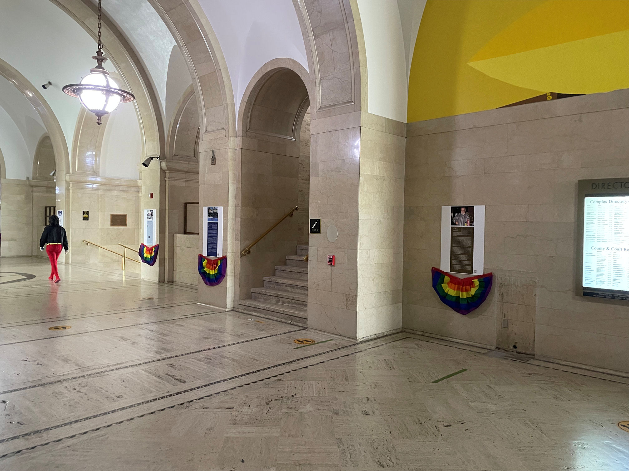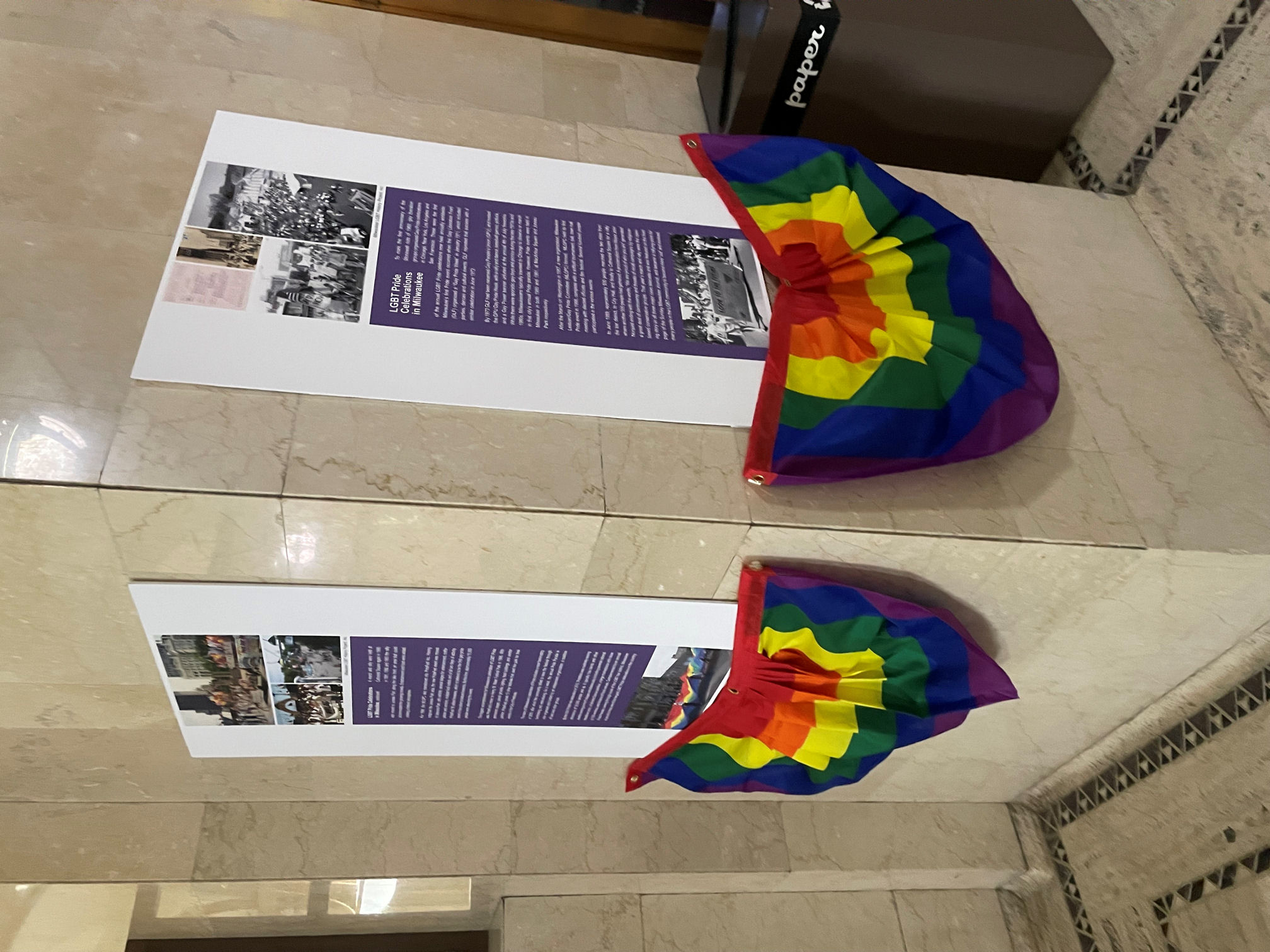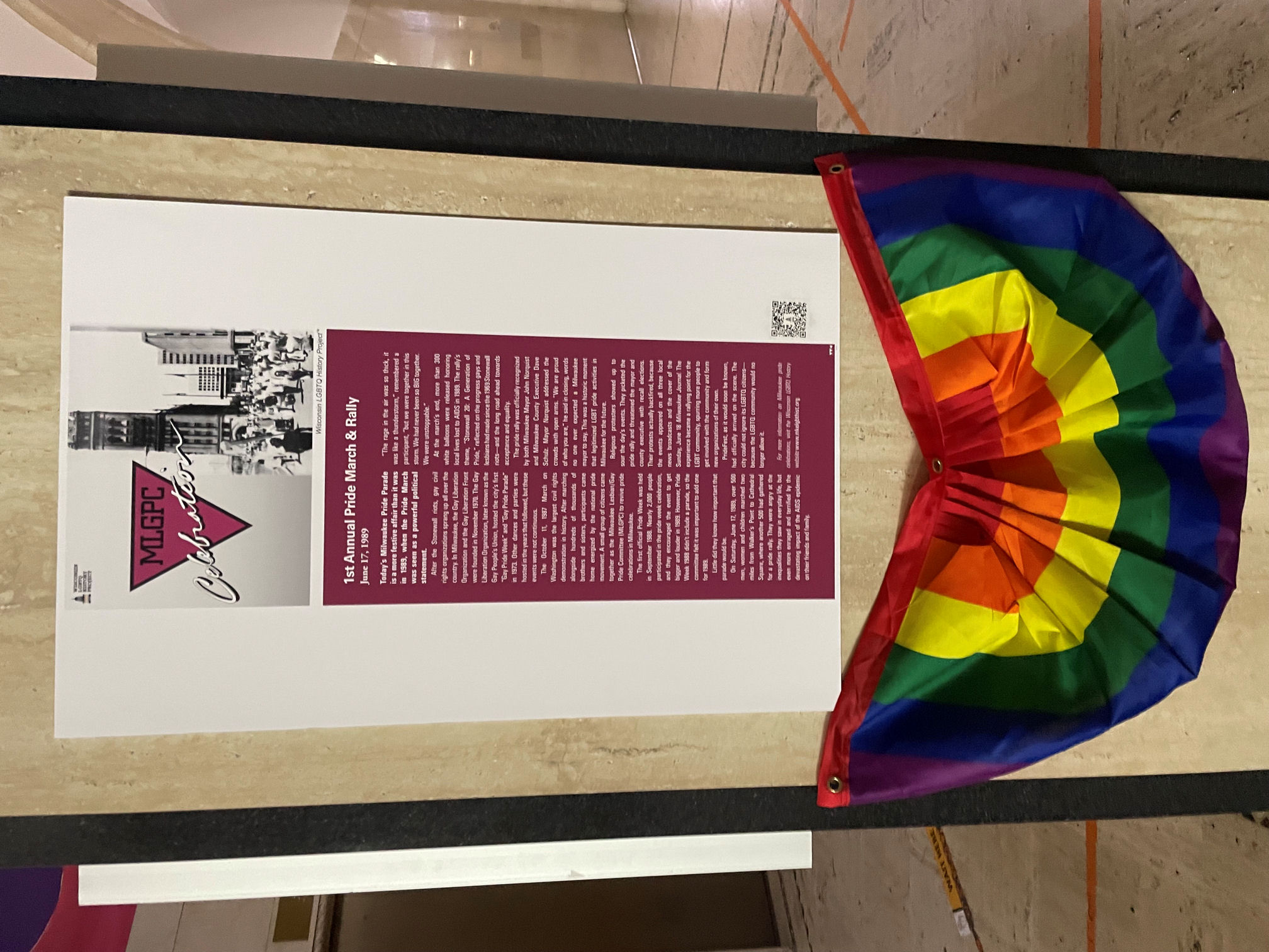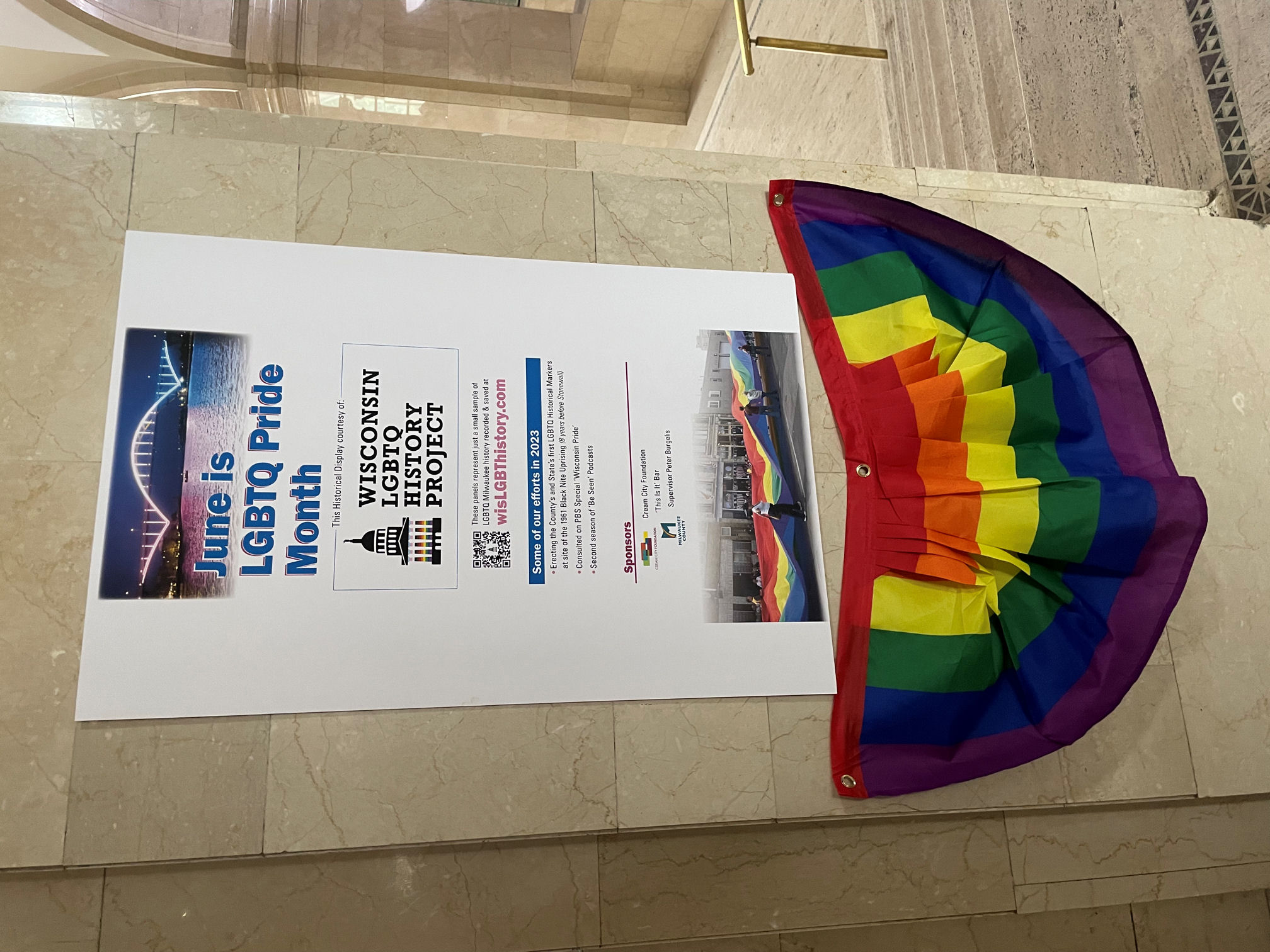 In May 2023, the Wisconsin LGBTQ History Project was approached by the staff of the County Board of Supervisors about creating an historical diplay in the main rotunda of the Milwaukee County Courthouse. We were honored to be asked and pleased to create a display. The Milwaukee County Courthouse is a huge building, and although the display featured 10 different historical panels, along with accompanying Pride-colored 'fan flags' below each panel, the display was noticeable but still somewhat swallowed up in the expanse of the building. However the display will hopefully lead to future displays by the Project at other locations. (The only permanent location for History Project panels is in 'This Is It' bar downtown Milwaukee.) The display in the Court House was made possible by a grant from the Cream City Foundation, a gift from 'This Is It' bar, and a donation by Supervisor Peter Burgelis. The following panels were displayed in the Courthouse: