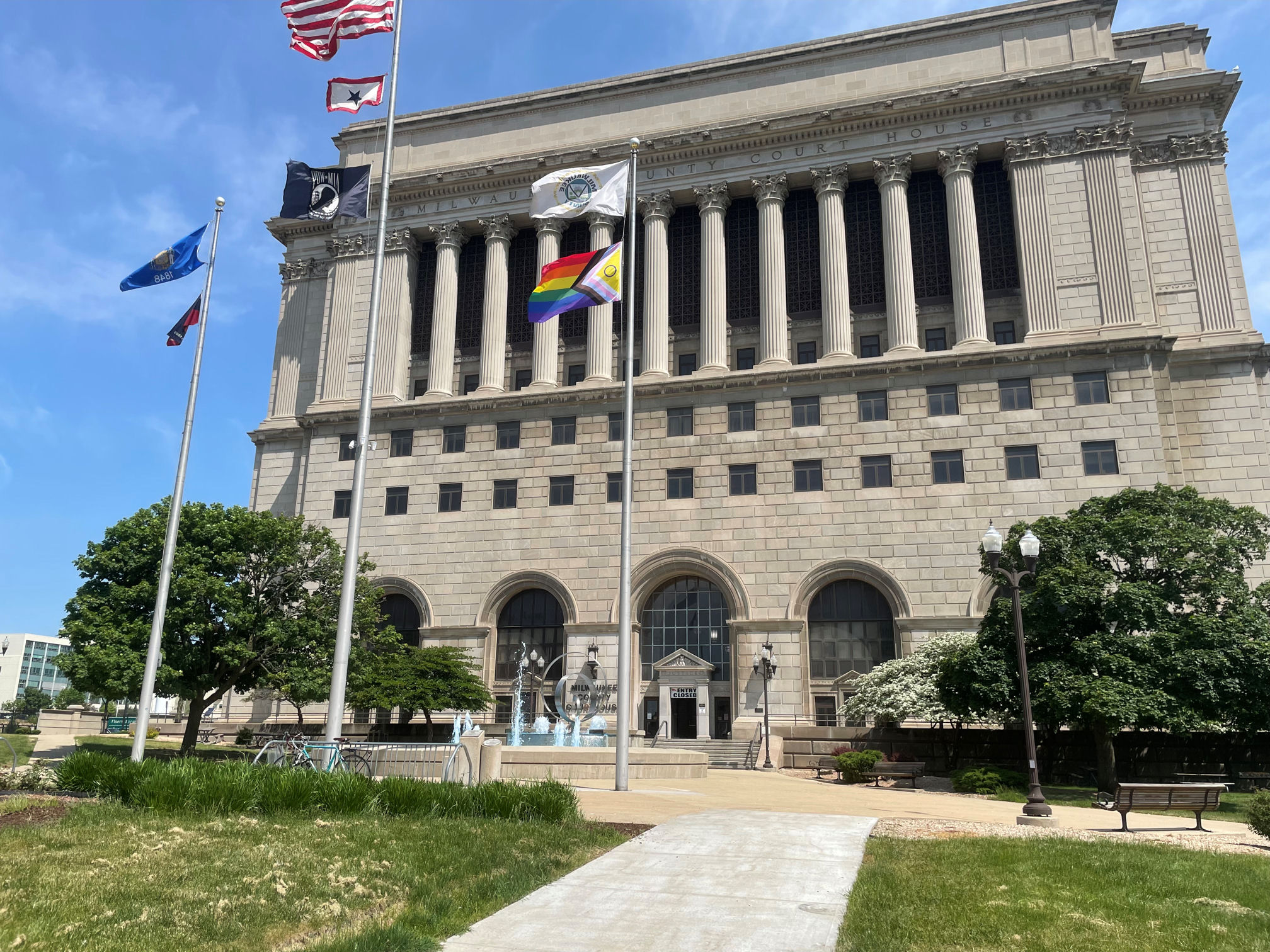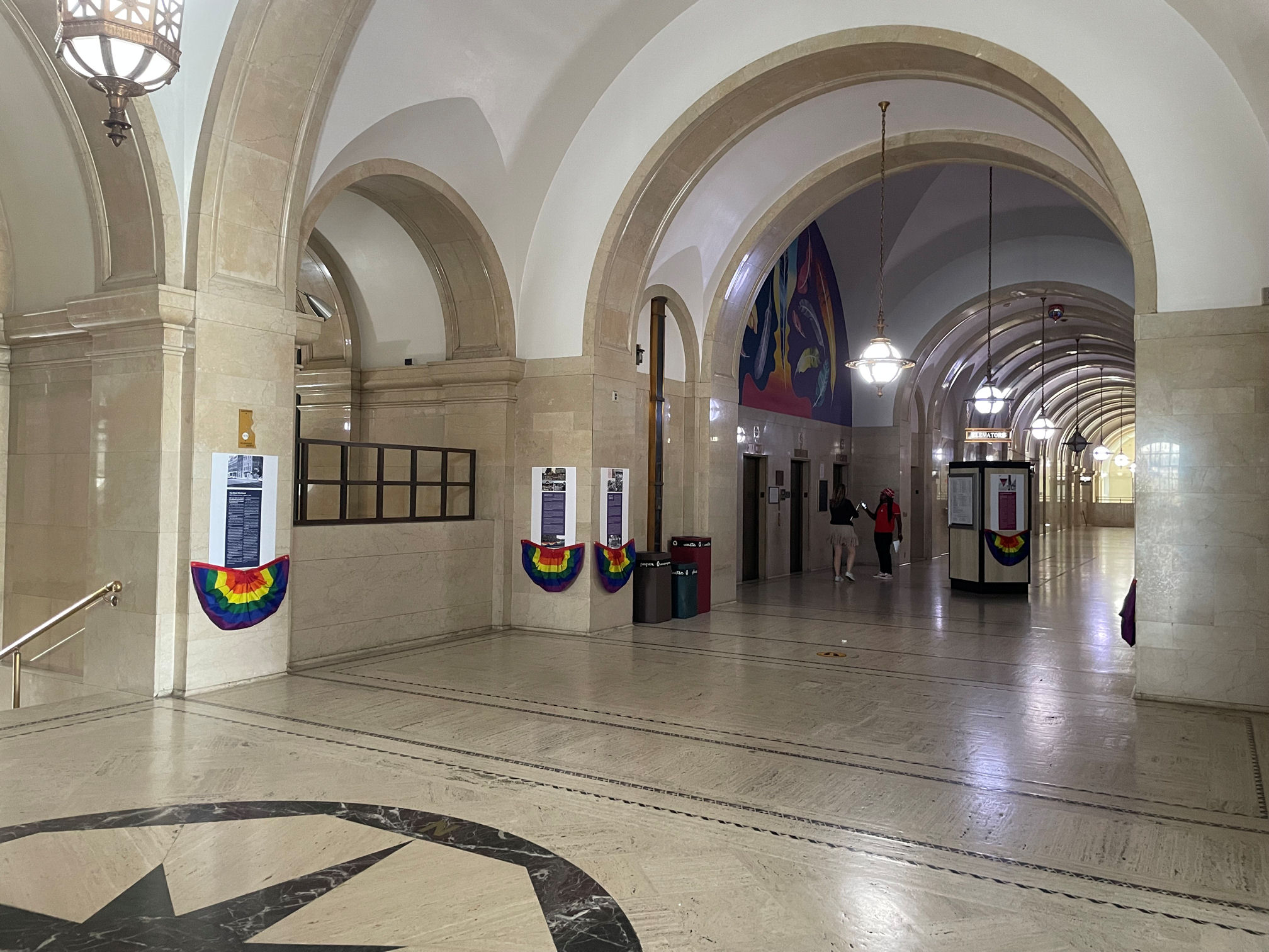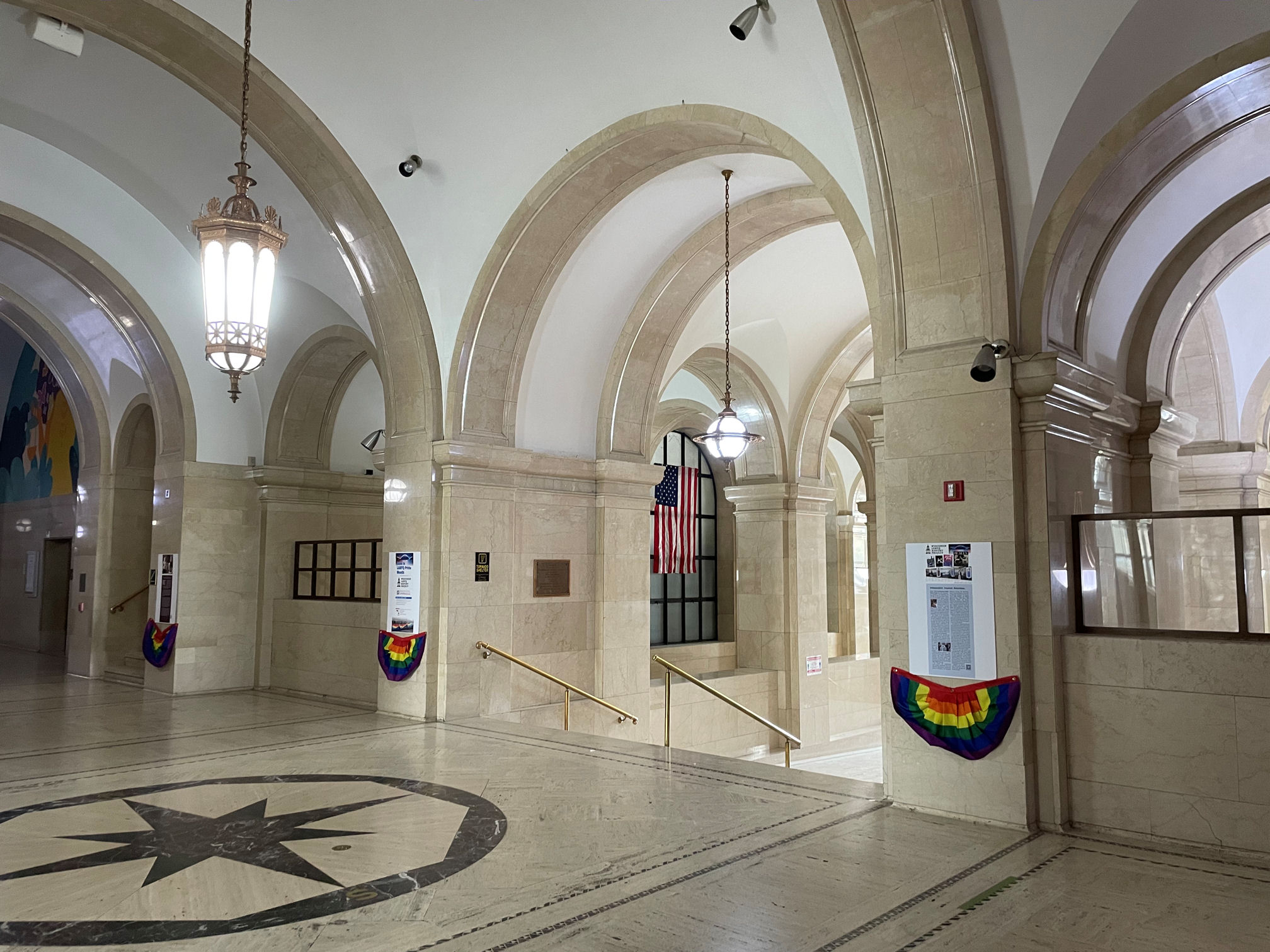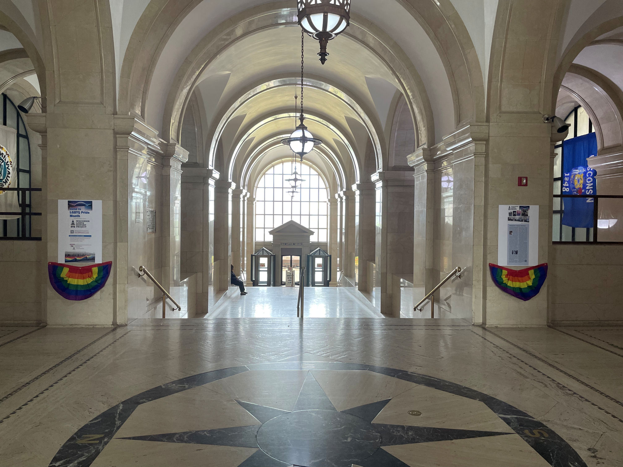 In May 2023, the Wisconsin LGBTQ History Project was approached by the staff of the County Board of Supervisors about creating an historical diplay in the main rotunda of the Milwaukee County Courthouse. We were honored to be asked and pleased to create a display. The Milwaukee County Courthouse is a huge building, and although the display featured 10 different historical panels, along with accompanying Pride-colored 'fan flags' below each panel, the display was noticeable but still somewhat swallowed up in the expanse of the building. However the display will hopefully lead to future displays by the Project at other locations. (The only permanent location for History Project panels is in 'This Is It' bar downtown Milwaukee.) The display in the Court House was made possible by a grant from the Cream City Foundation, a gift from 'This Is It' bar, and a donation by Supervisor Peter Burgelis. The following panels were displayed in the Courthouse: