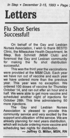 Flu Vaccination shots began to be offered annually to members of the LGBT community in approximately 1990, by the Gay and Lesbian Nurses Association, usually in cooperation with the BESTD Clinic and the Milwaukee Health Department, with local LGBT media providing free advertising. The effort was begun to target the especially at-risk population of the gay and lesbian community after the AIDS outbreak. The cryptospridium contamination tragedy of early 1993 was also a wake-up call to better watch the overall health of the community. Vaccinations are typically offered free of charge (donation requested) over several evenings in October of each year. For many people this is the easiest and last expensive way to get a flu shot, as this is often prior to when most employers, clinics, and pharmacies would have the vaccine widely available. Even in years of shortage of the vaccine, the Nurses Association has typically been able to acquire adequate supplies for this event. For its first 16 years the vaccinations were given in the upstairs at the M&M Club, thanks to M&M Club owner Bob Schmidt's generosity. When the M&M Club closed early in 2006, the Nurses Association began the search for a new location for its 17th year. |