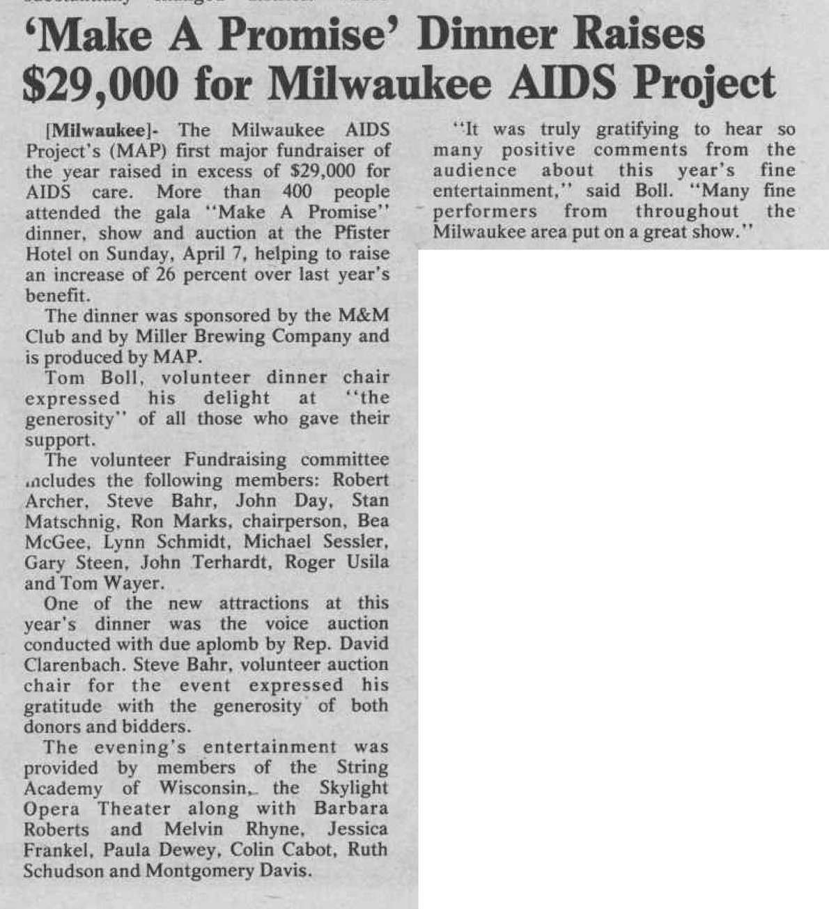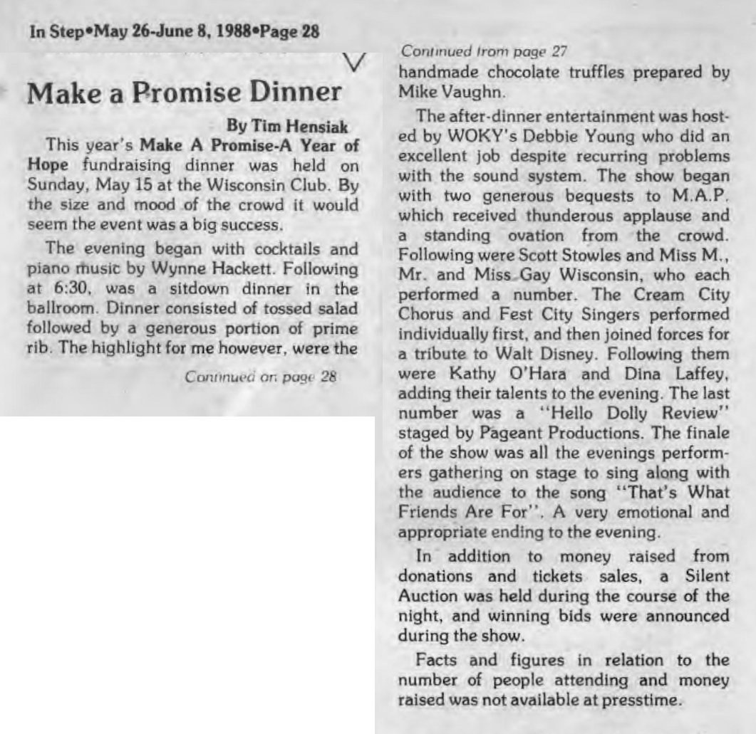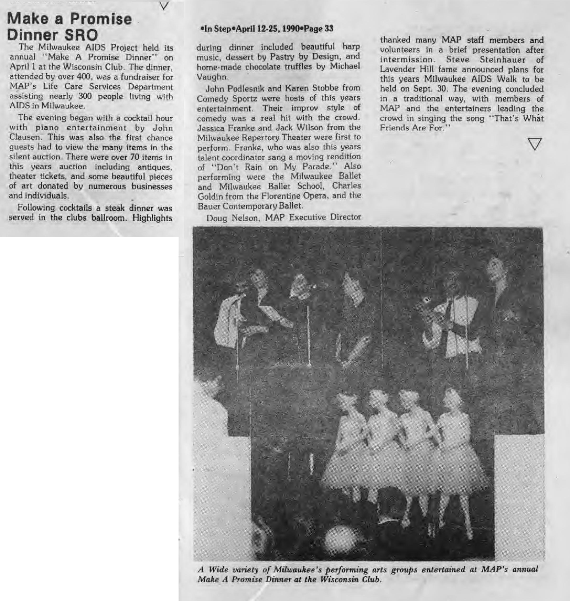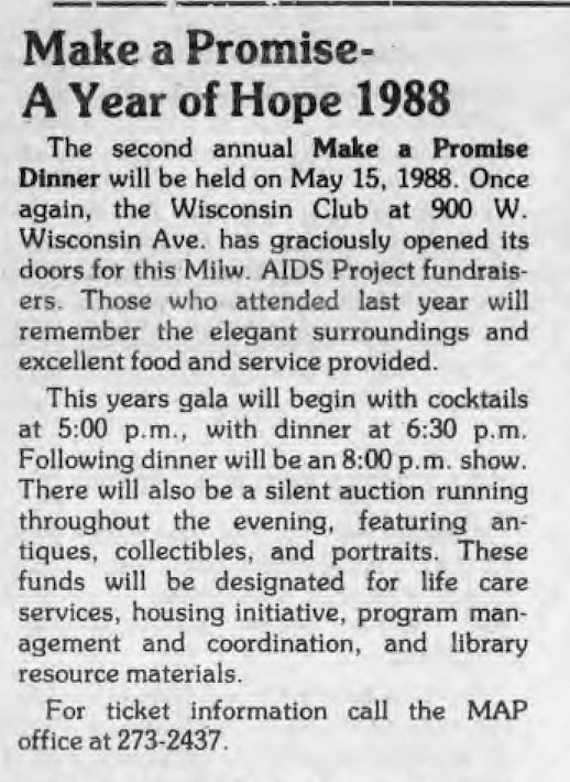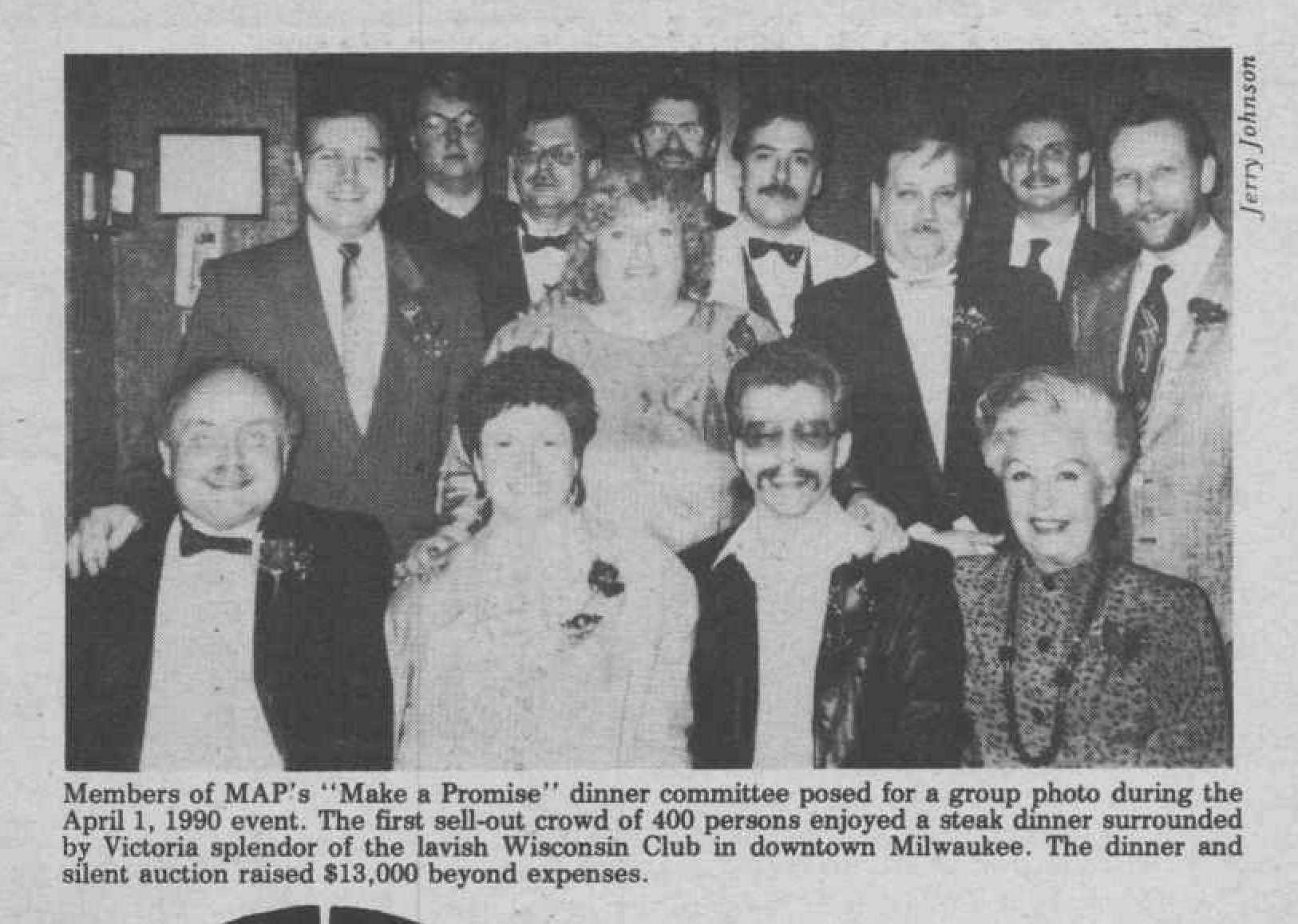 Later in 1986, there was a planning meeting around the big dining room table at the MAP office, including (by some recollections) Tom Boll, Steve Bahr, likely Steve Steinhauer and John Luedtke, and probably a few others. It was decided to hold a formal dinner and fundraiser called 'Make a Promise', to share the 'MAP' acronym of the parent agency, the 'Milwaukee AIDS Project'. The planning meetings resulted in a dinner and show held at the Wisconsin Club, which is what is referred to as the first annual event called "Make a Promise". (Articles in 1991 and 1992 state that "Tom Boll... created the concept of Make A Promise".)