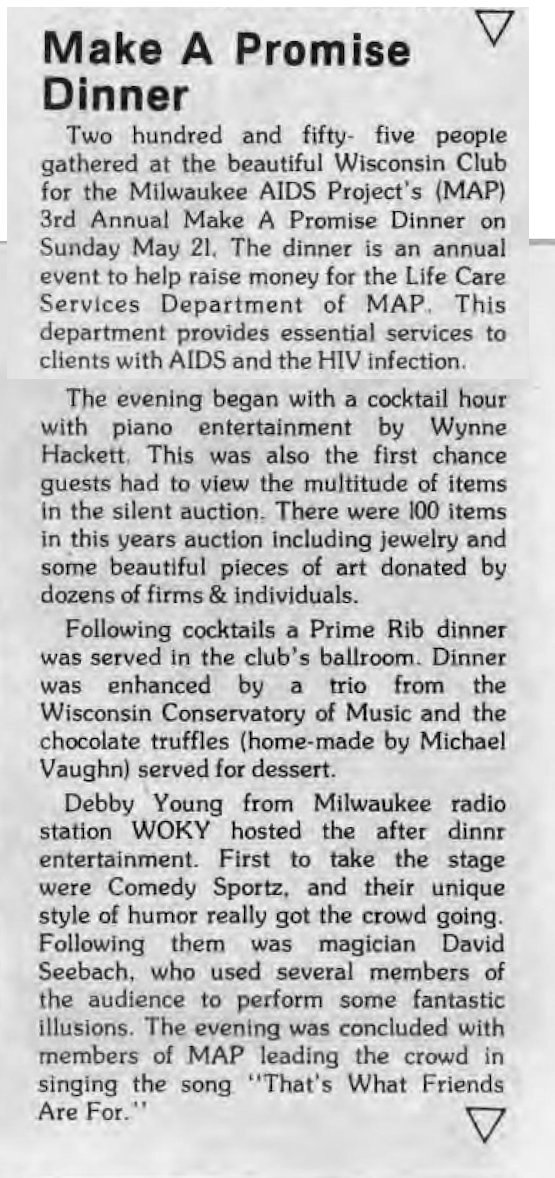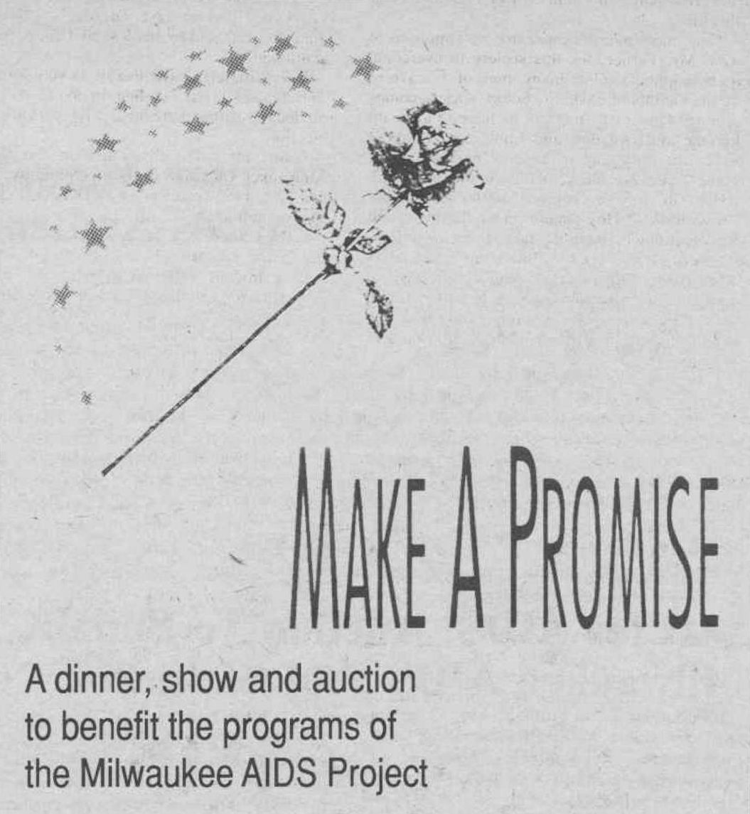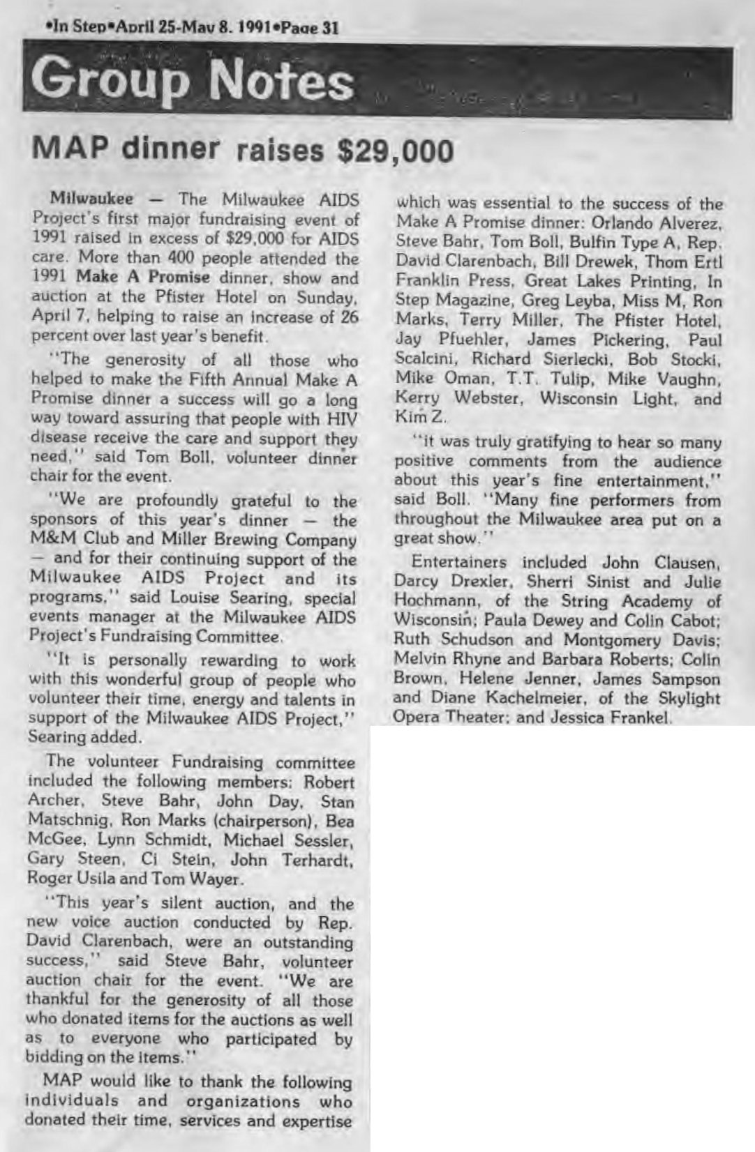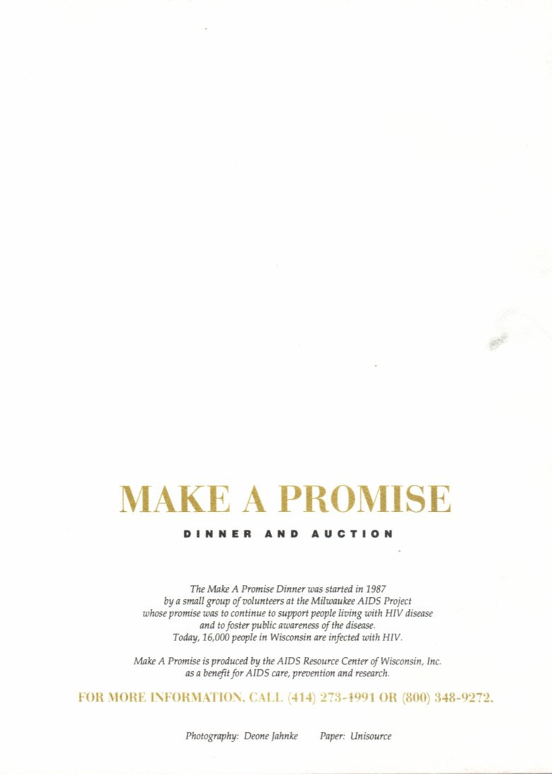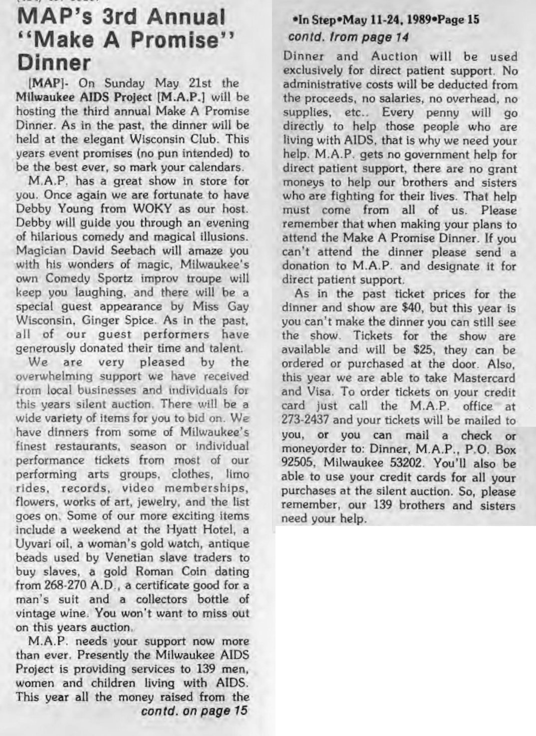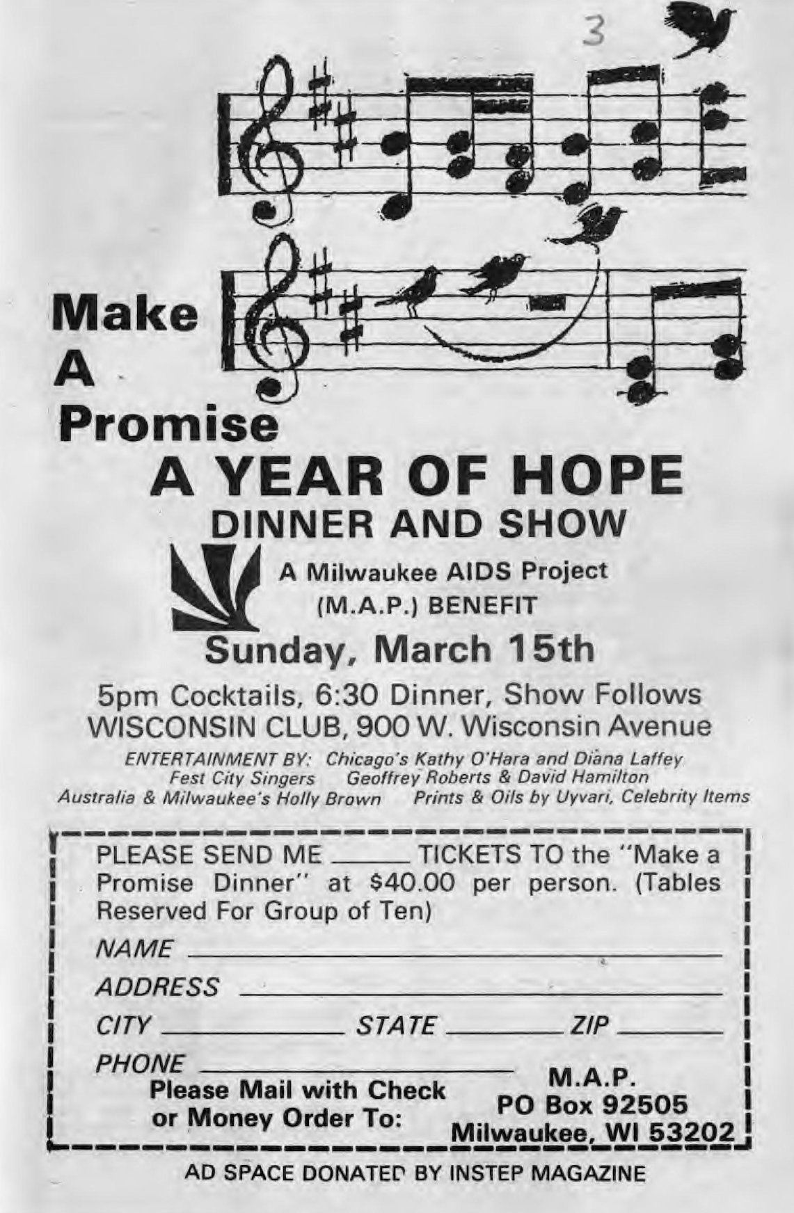 Later in 1986, there was a planning meeting around the big dining room table at the MAP office, including (by some recollections) Tom Boll, Steve Bahr, likely Steve Steinhauer and John Luedtke, and probably a few others. It was decided to hold a formal dinner and fundraiser called 'Make a Promise', to share the 'MAP' acronym of the parent agency, the 'Milwaukee AIDS Project'. The planning meetings resulted in a dinner and show held at the Wisconsin Club, which is what is referred to as the first annual event called "Make a Promise". (Articles in 1991 and 1992 state that "Tom Boll... created the concept of Make A Promise".)
