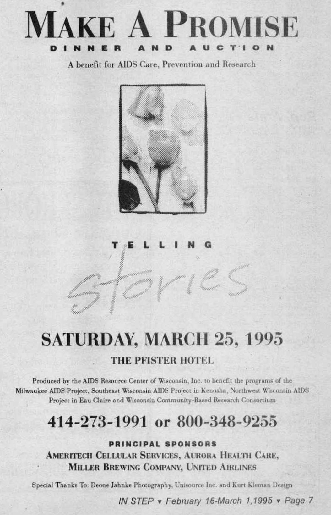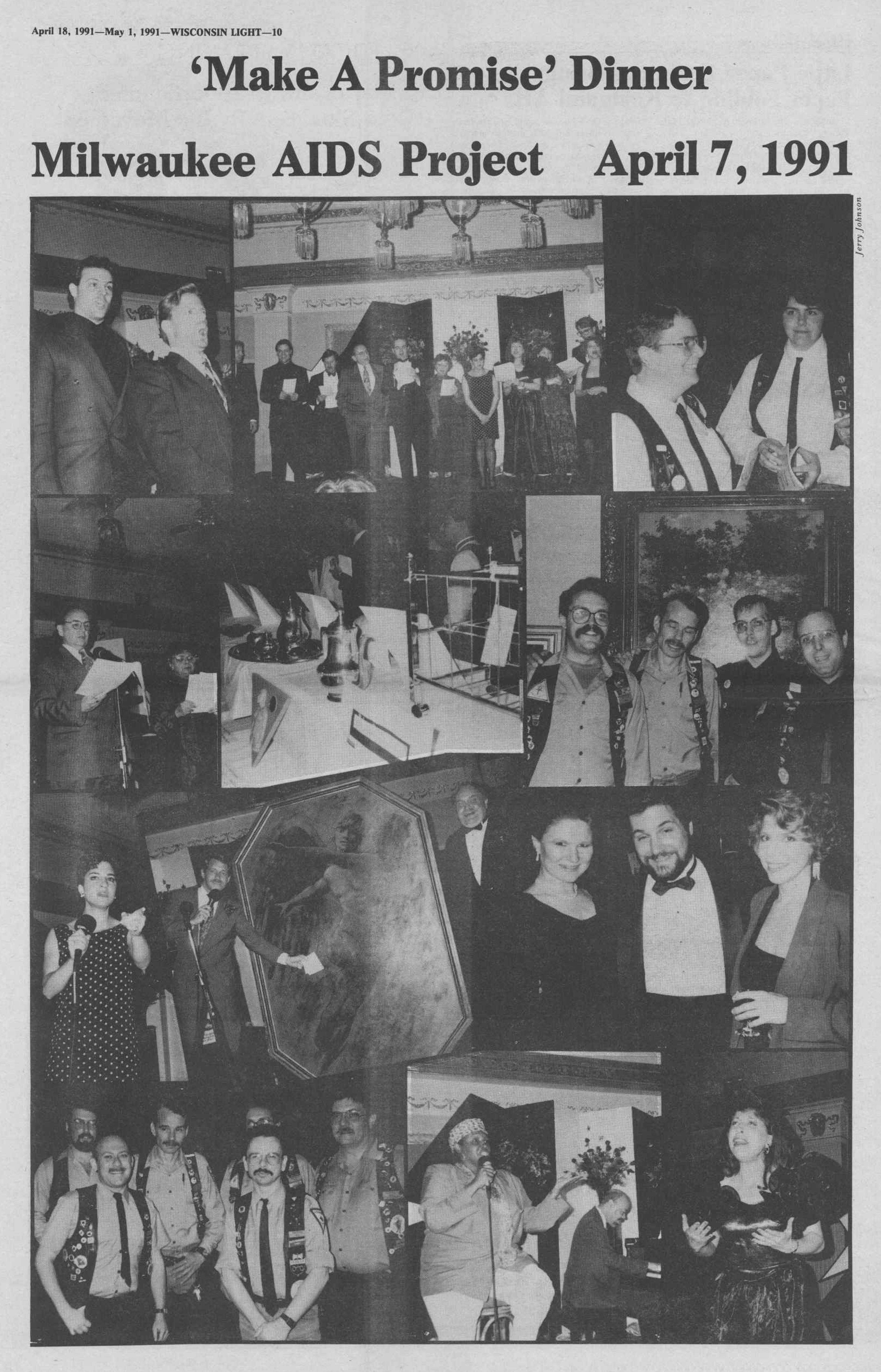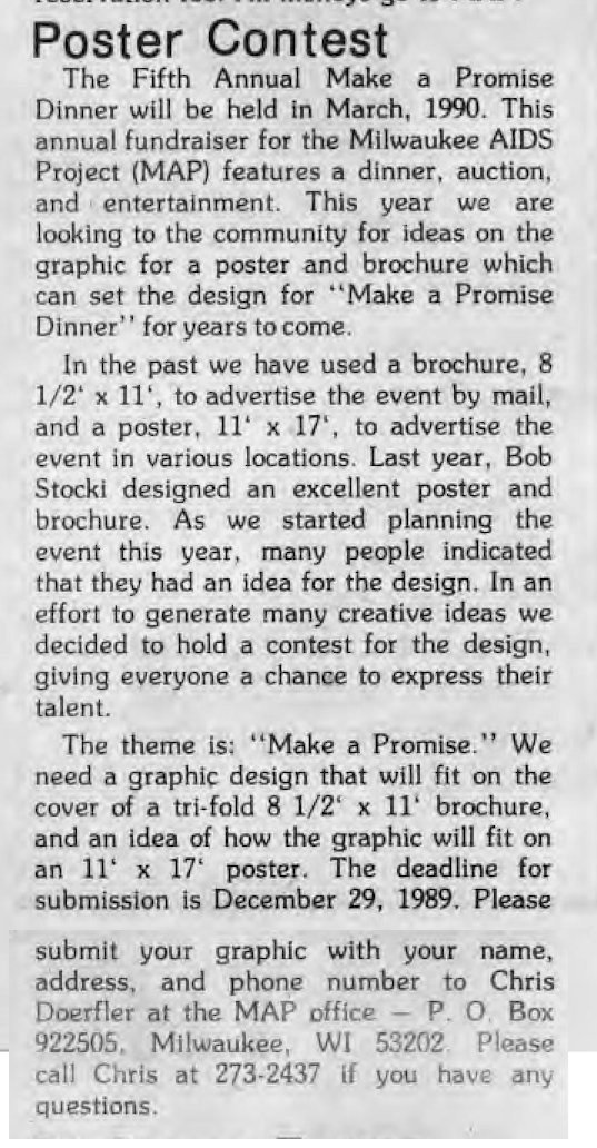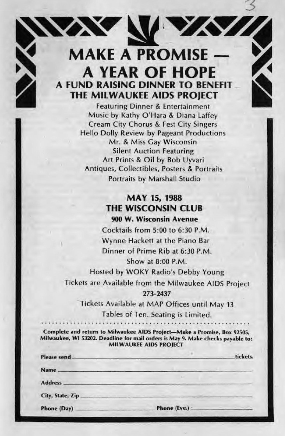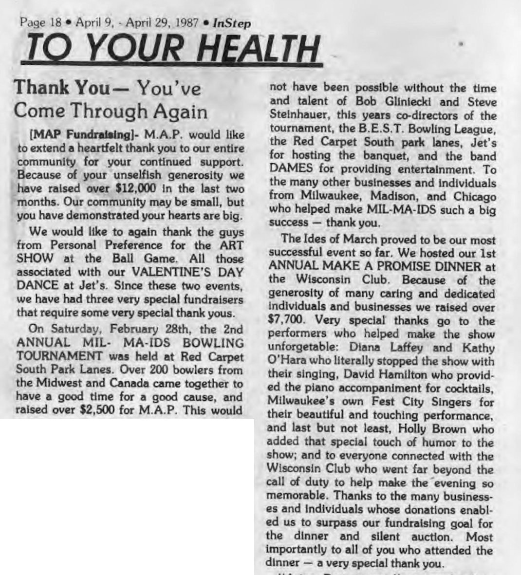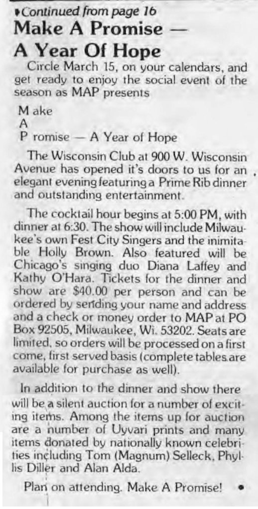 Later in 1986, there was a planning meeting around the big dining room table at the MAP office, including (by some recollections) Tom Boll, Steve Bahr, likely Steve Steinhauer and John Luedtke, and probably a few others. It was decided to hold a formal dinner and fundraiser called 'Make a Promise', to share the 'MAP' acronym of the parent agency, the 'Milwaukee AIDS Project'. The planning meetings resulted in a dinner and show held at the Wisconsin Club, which is what is referred to as the first annual event called "Make a Promise". (Articles in 1991 and 1992 state that "Tom Boll... created the concept of Make A Promise".)