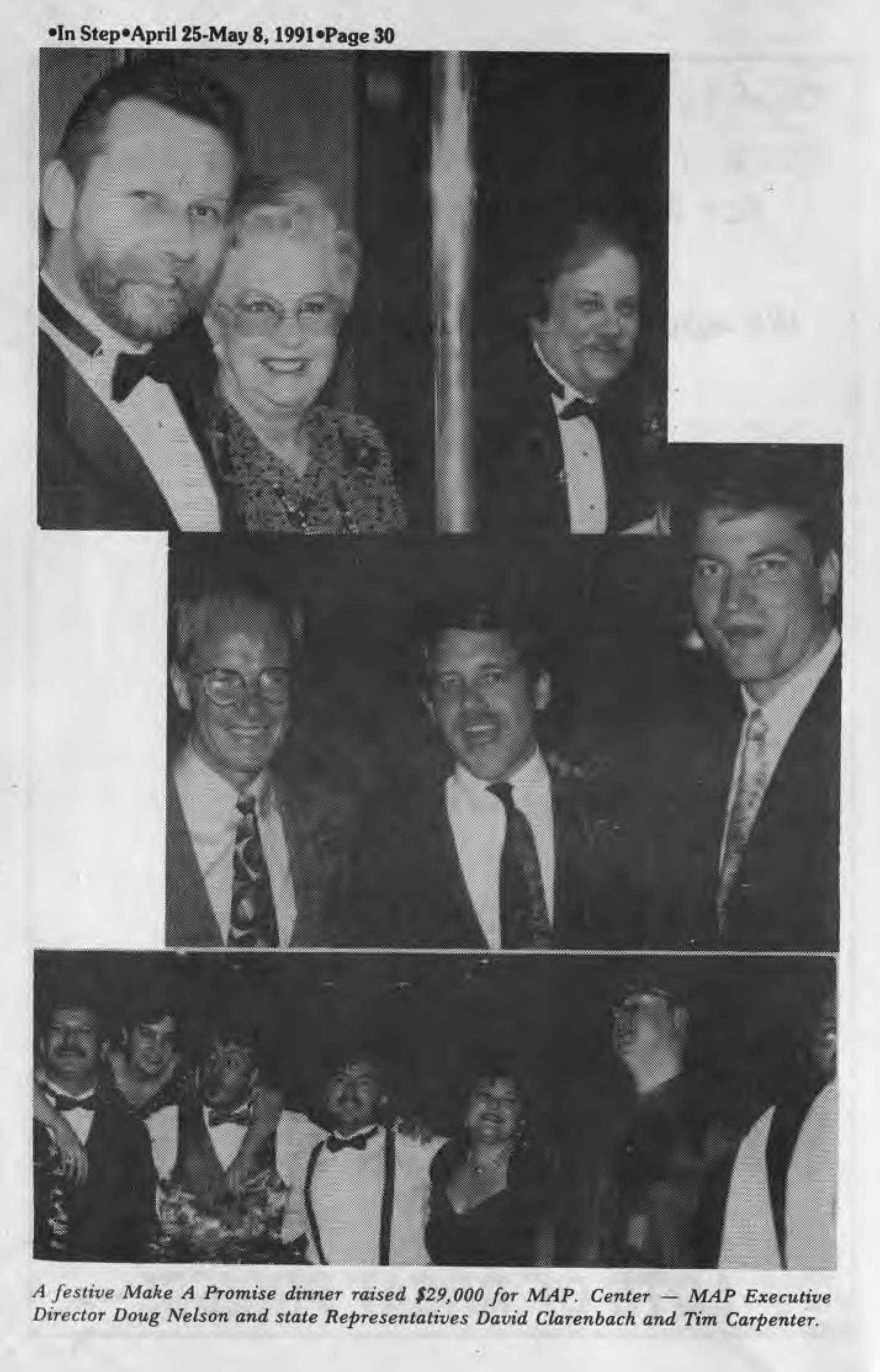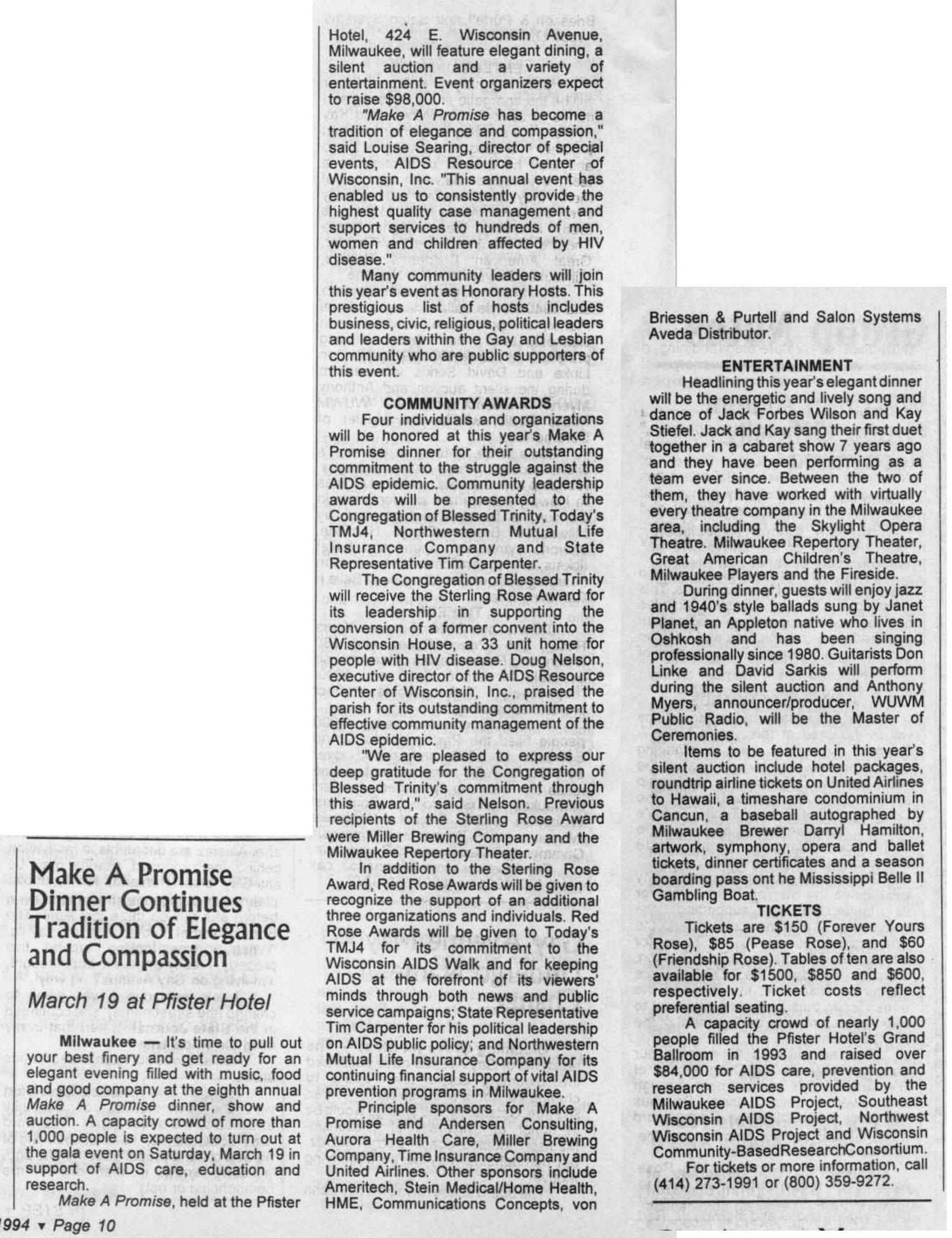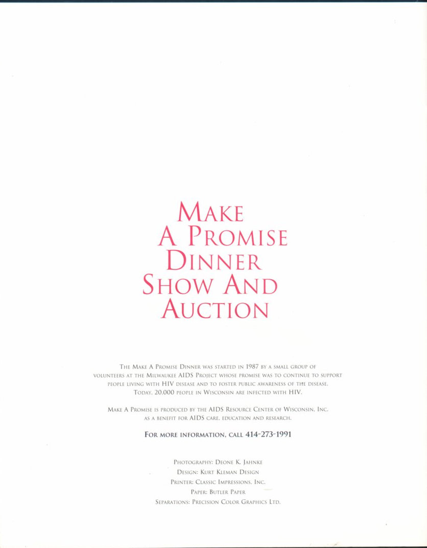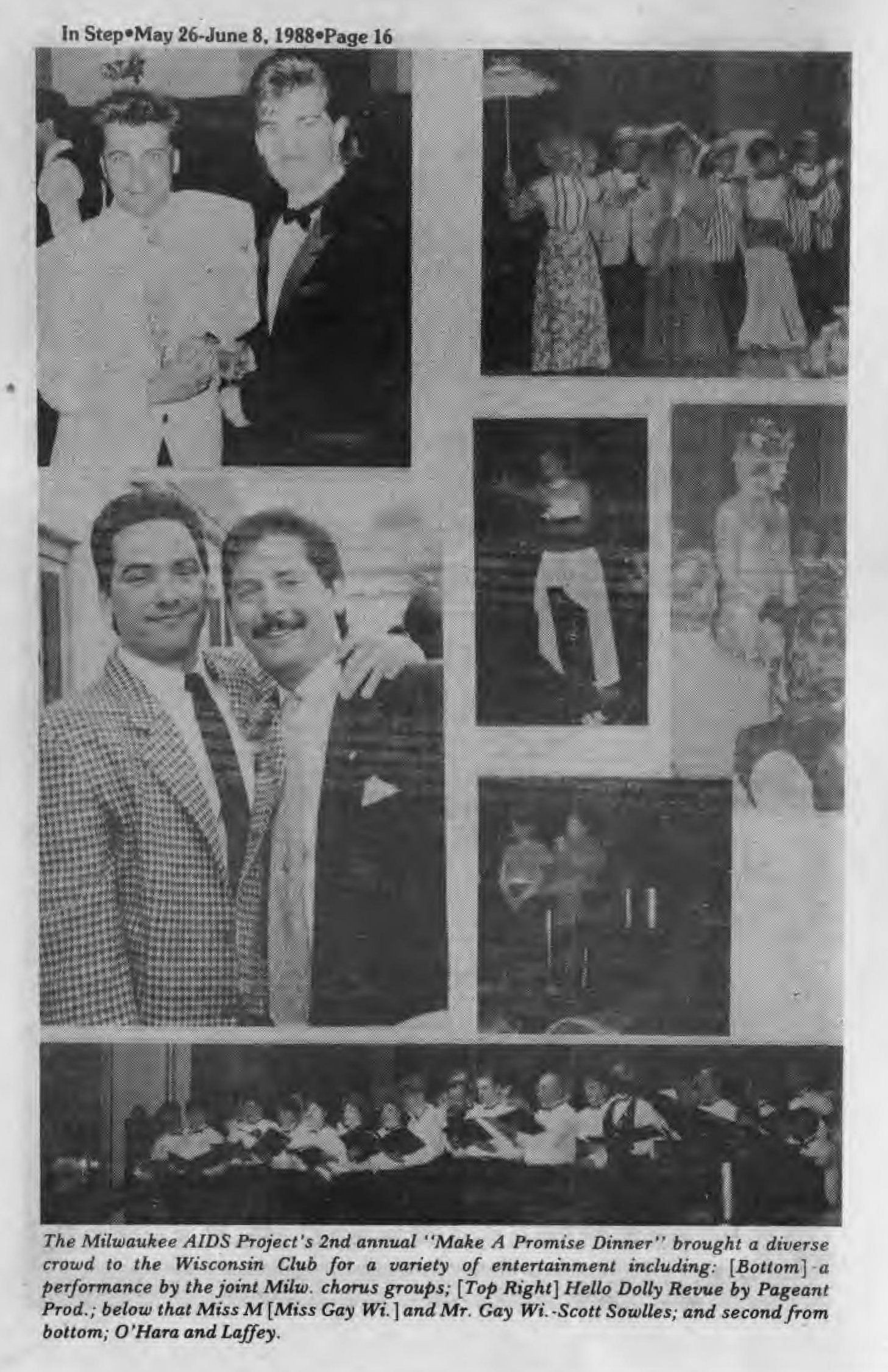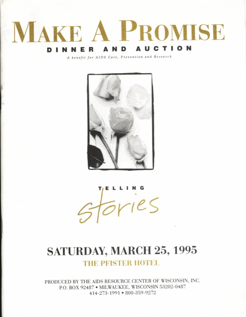 Later in 1986, there was a planning meeting around the big dining room table at the MAP office, including (by some recollections) Tom Boll, Steve Bahr, likely Steve Steinhauer and John Luedtke, and probably a few others. It was decided to hold a formal dinner and fundraiser called 'Make a Promise', to share the 'MAP' acronym of the parent agency, the 'Milwaukee AIDS Project'. The planning meetings resulted in a dinner and show held at the Wisconsin Club, which is what is referred to as the first annual event called "Make a Promise". (Articles in 1991 and 1992 state that "Tom Boll... created the concept of Make A Promise".)