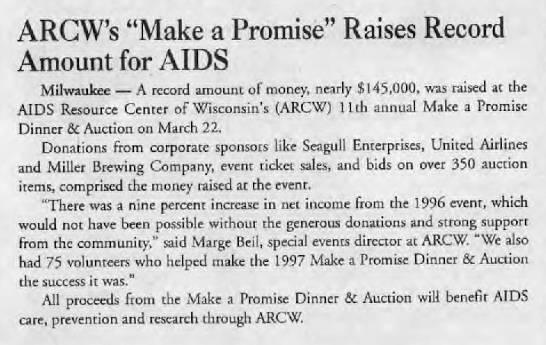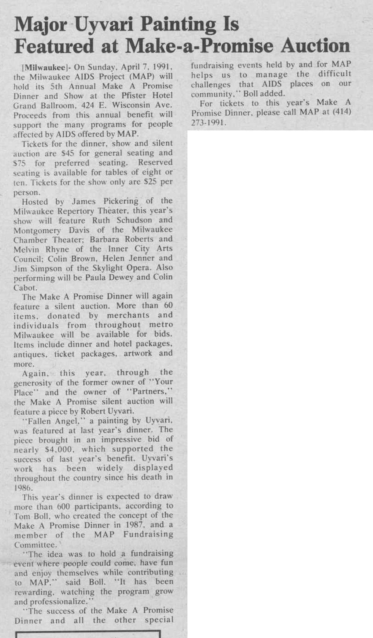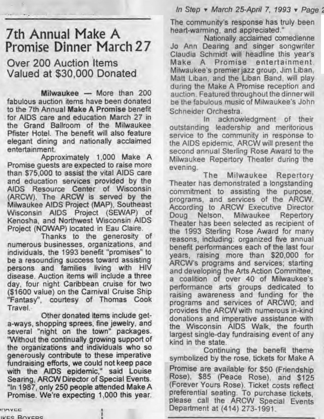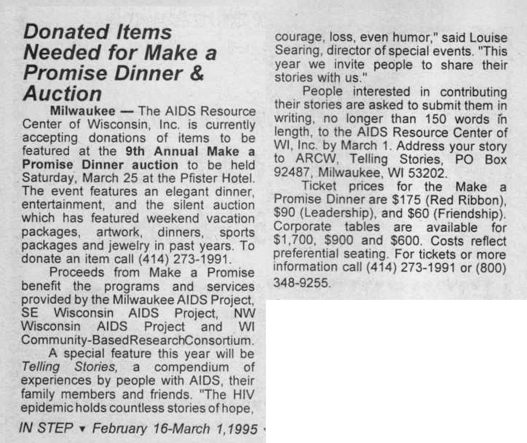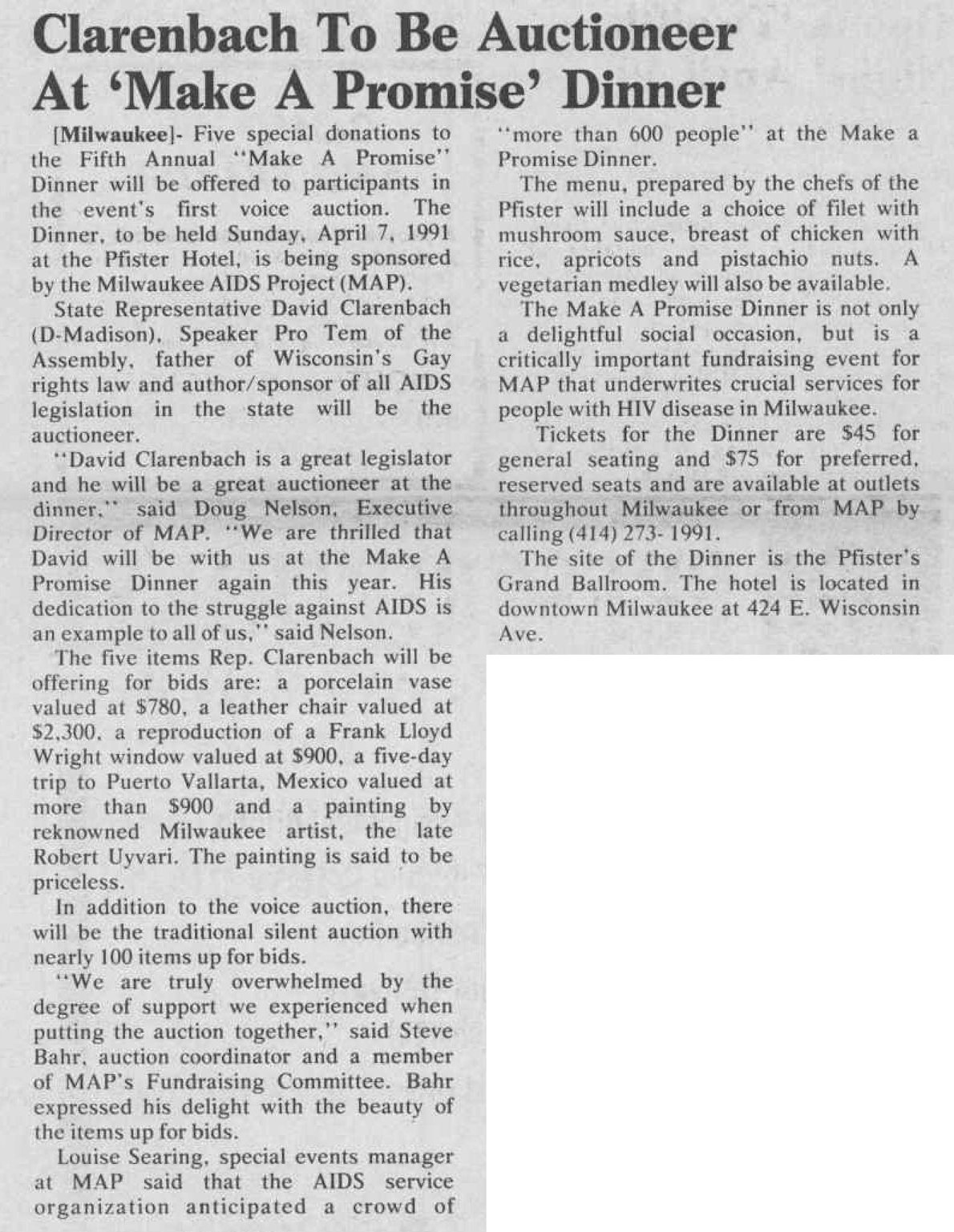 Later in 1986, there was a planning meeting around the big dining room table at the MAP office, including (by some recollections) Tom Boll, Steve Bahr, likely Steve Steinhauer and John Luedtke, and probably a few others. It was decided to hold a formal dinner and fundraiser called 'Make a Promise', to share the 'MAP' acronym of the parent agency, the 'Milwaukee AIDS Project'. The planning meetings resulted in a dinner and show held at the Wisconsin Club, which is what is referred to as the first annual event called "Make a Promise". (Articles in 1991 and 1992 state that "Tom Boll... created the concept of Make A Promise".)